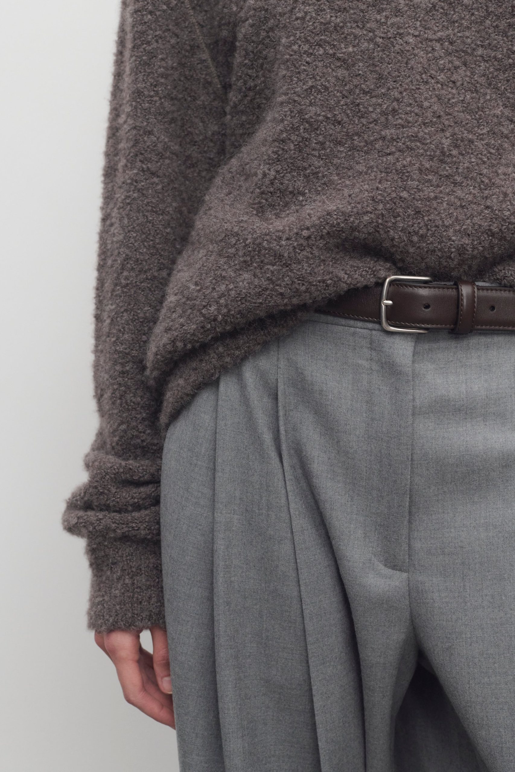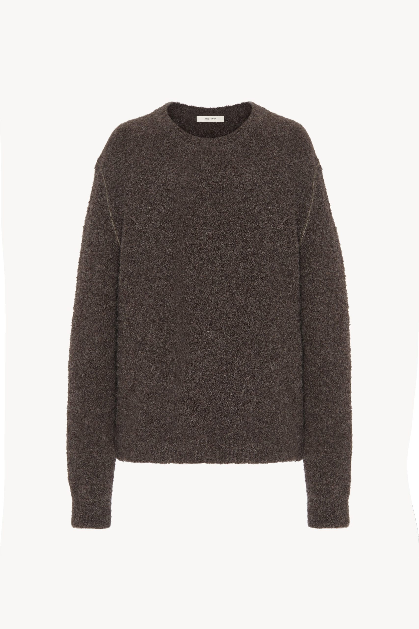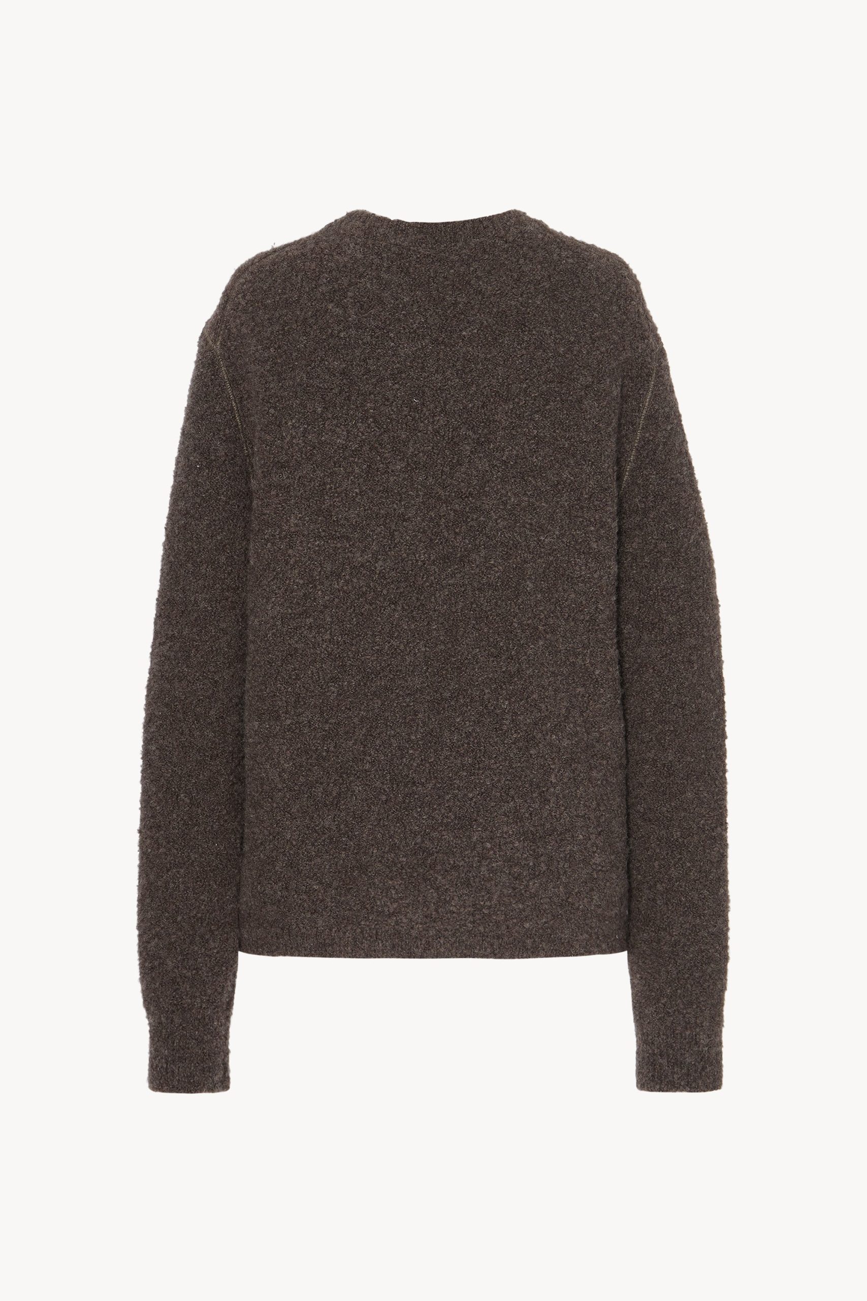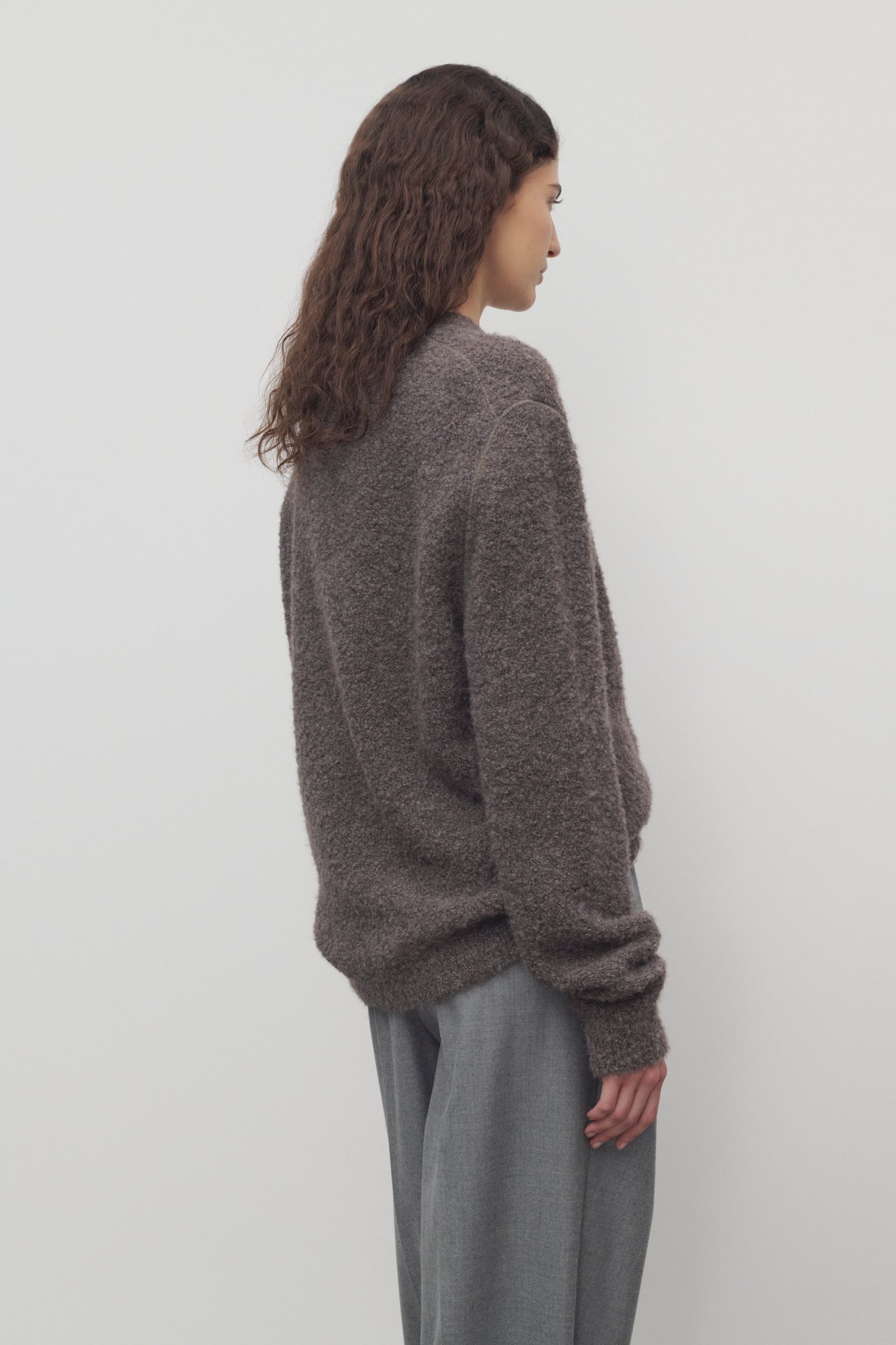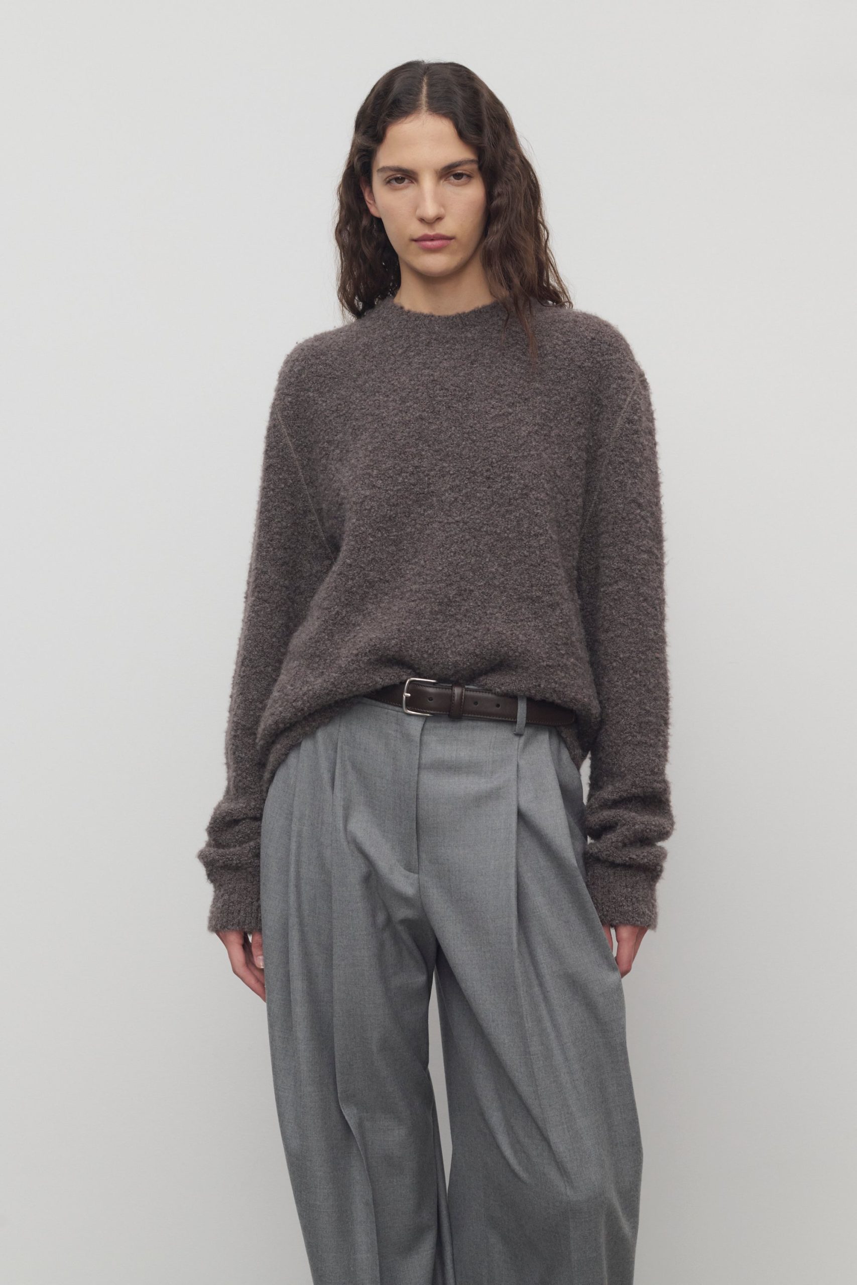 Relaxed crewneck sweater in textured alpaca and cashmere bouclé with topstitched armholes and ribbed neckline. cuffs. and hem.