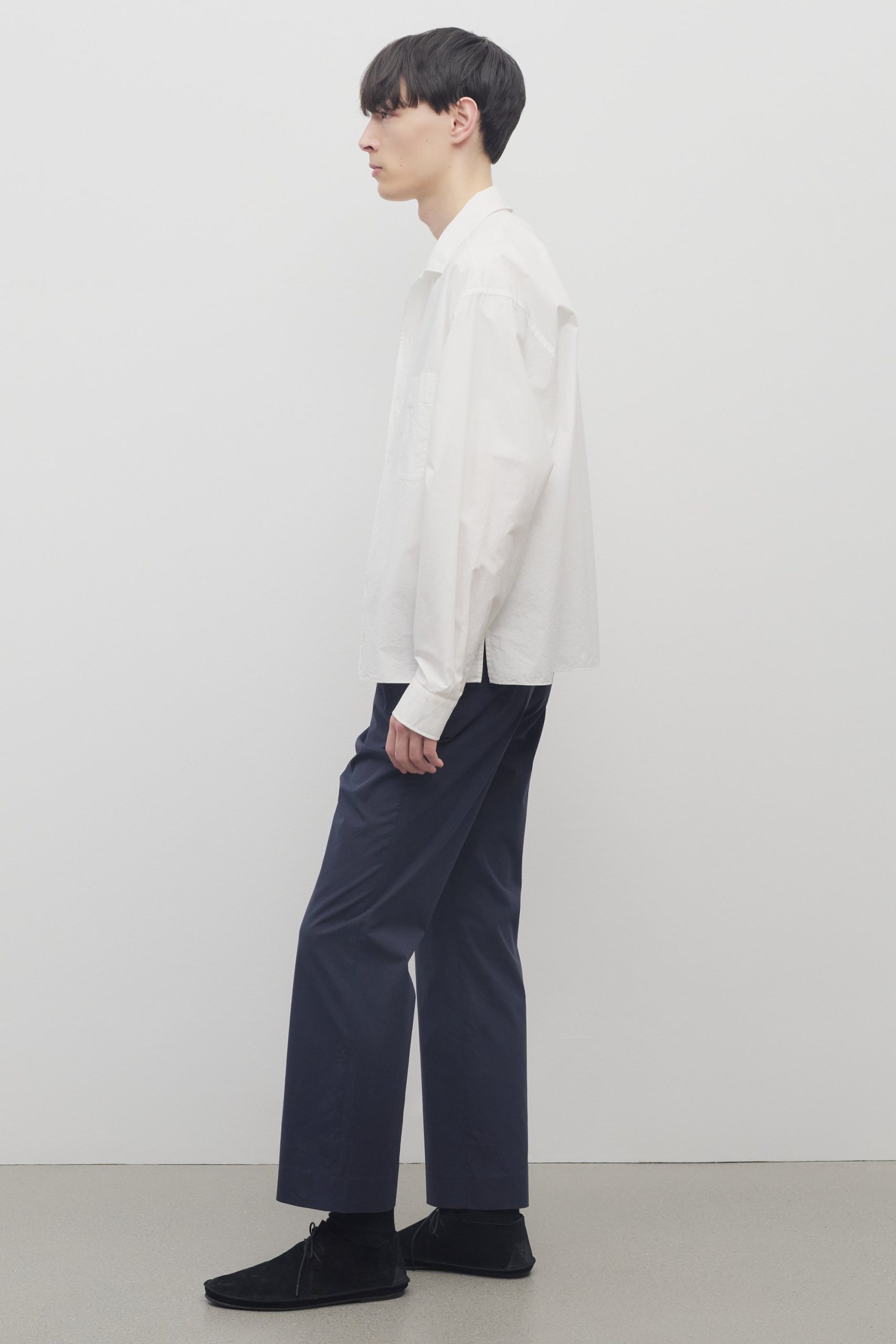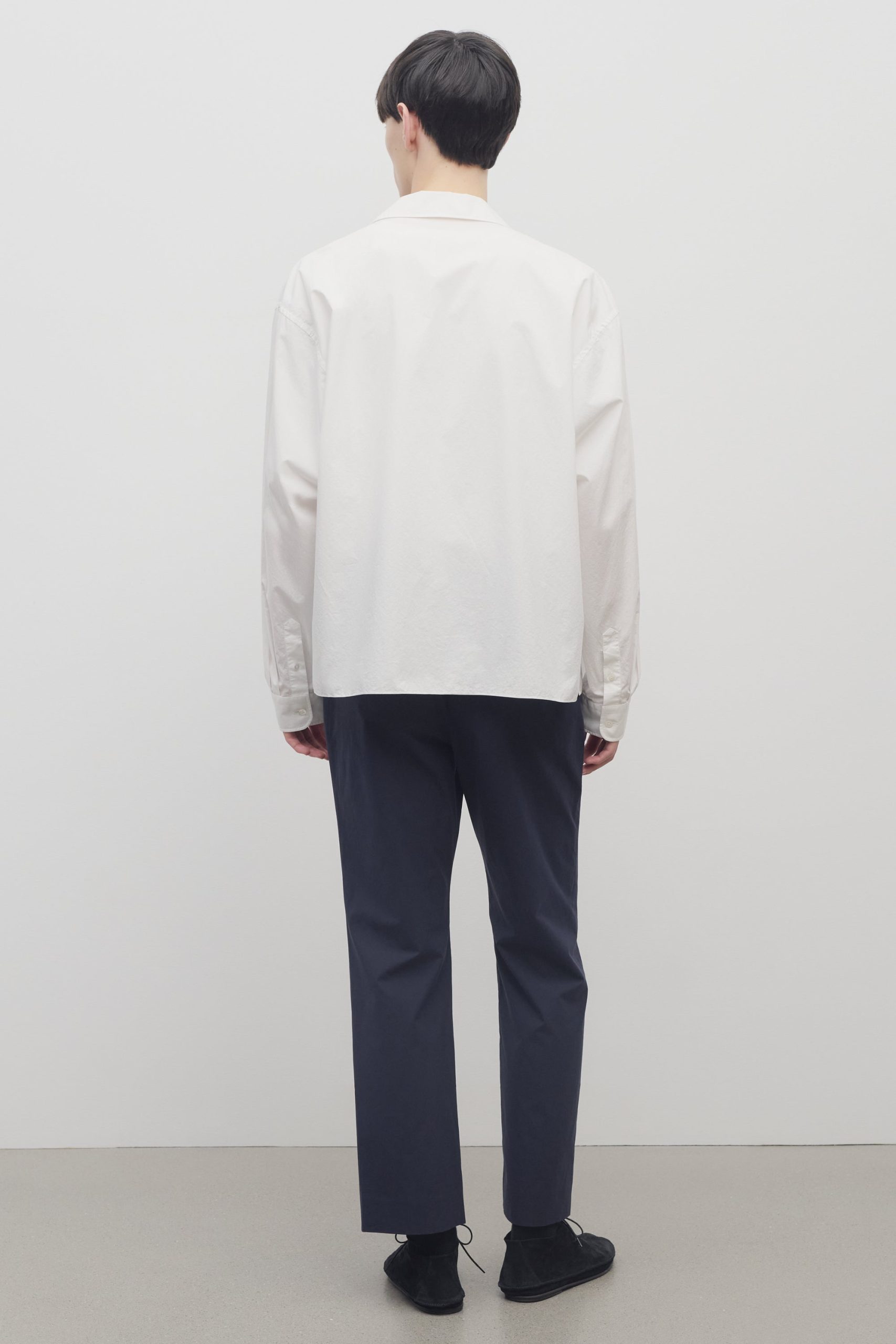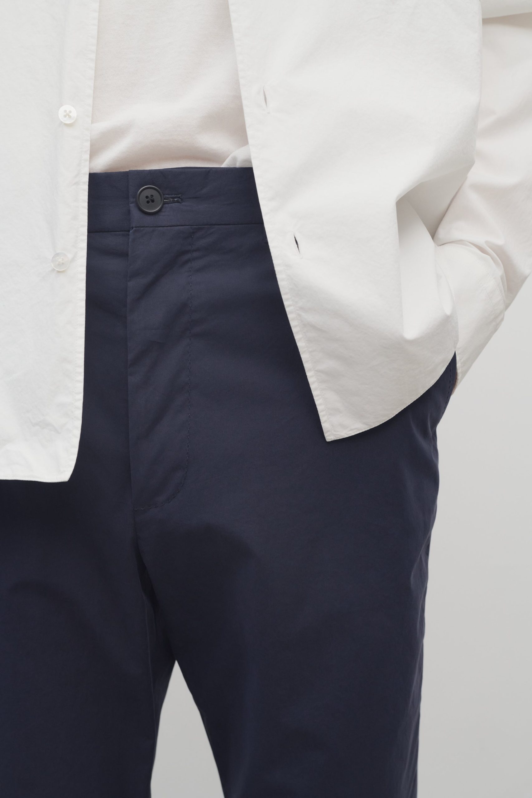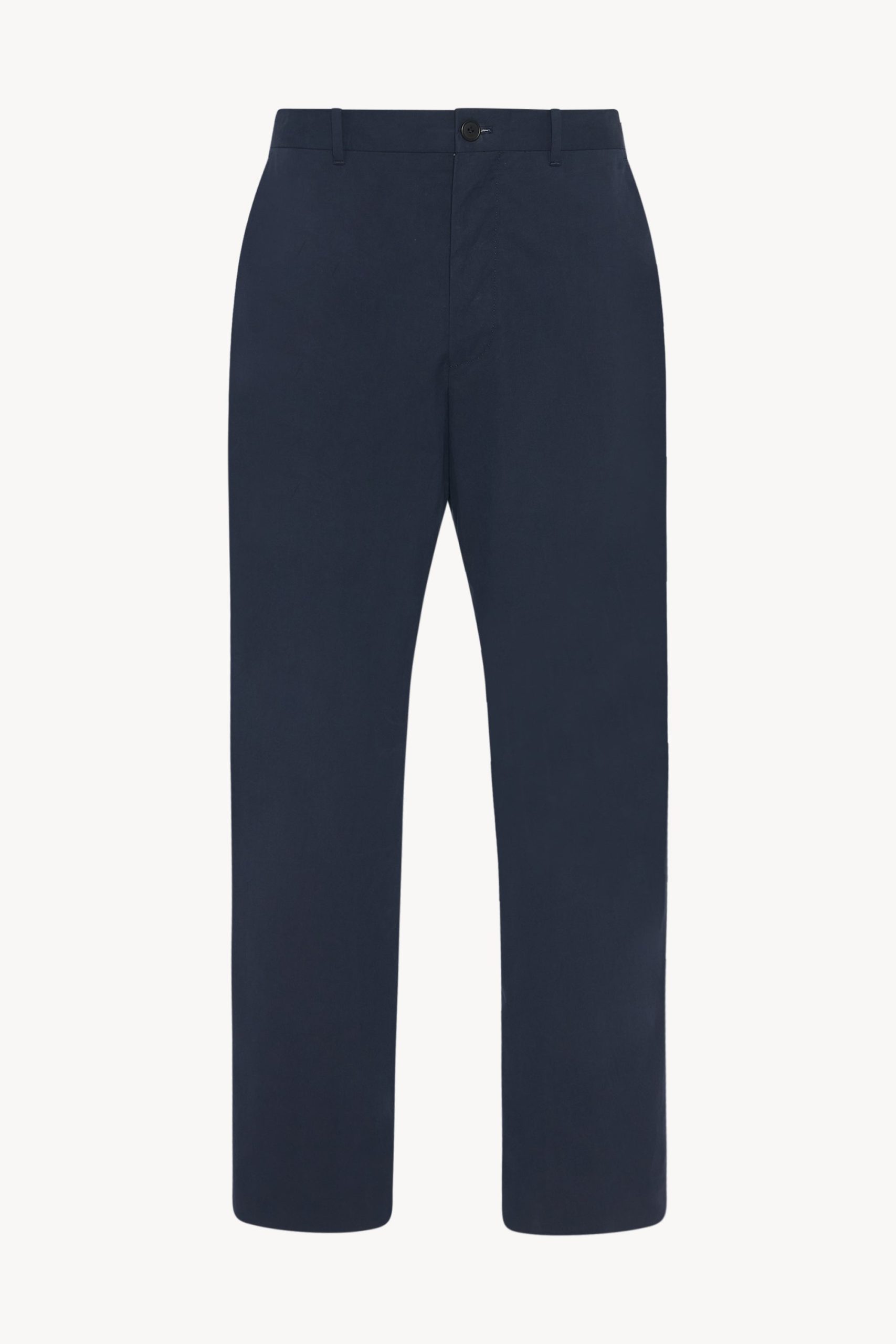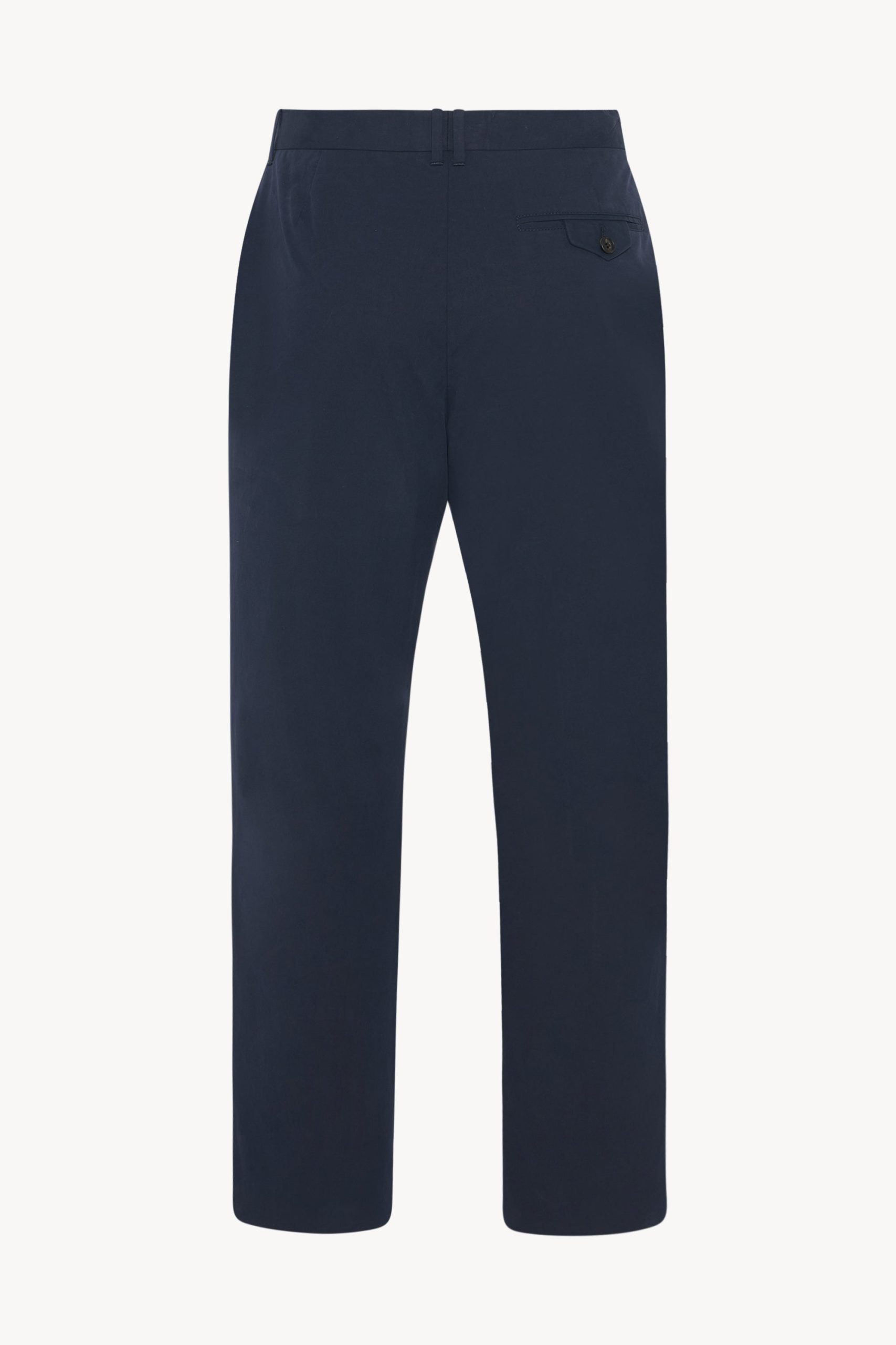 Mid-rise tailored trouser in smooth Pima cotton with straight leg. side seam pockets. and horn button details.