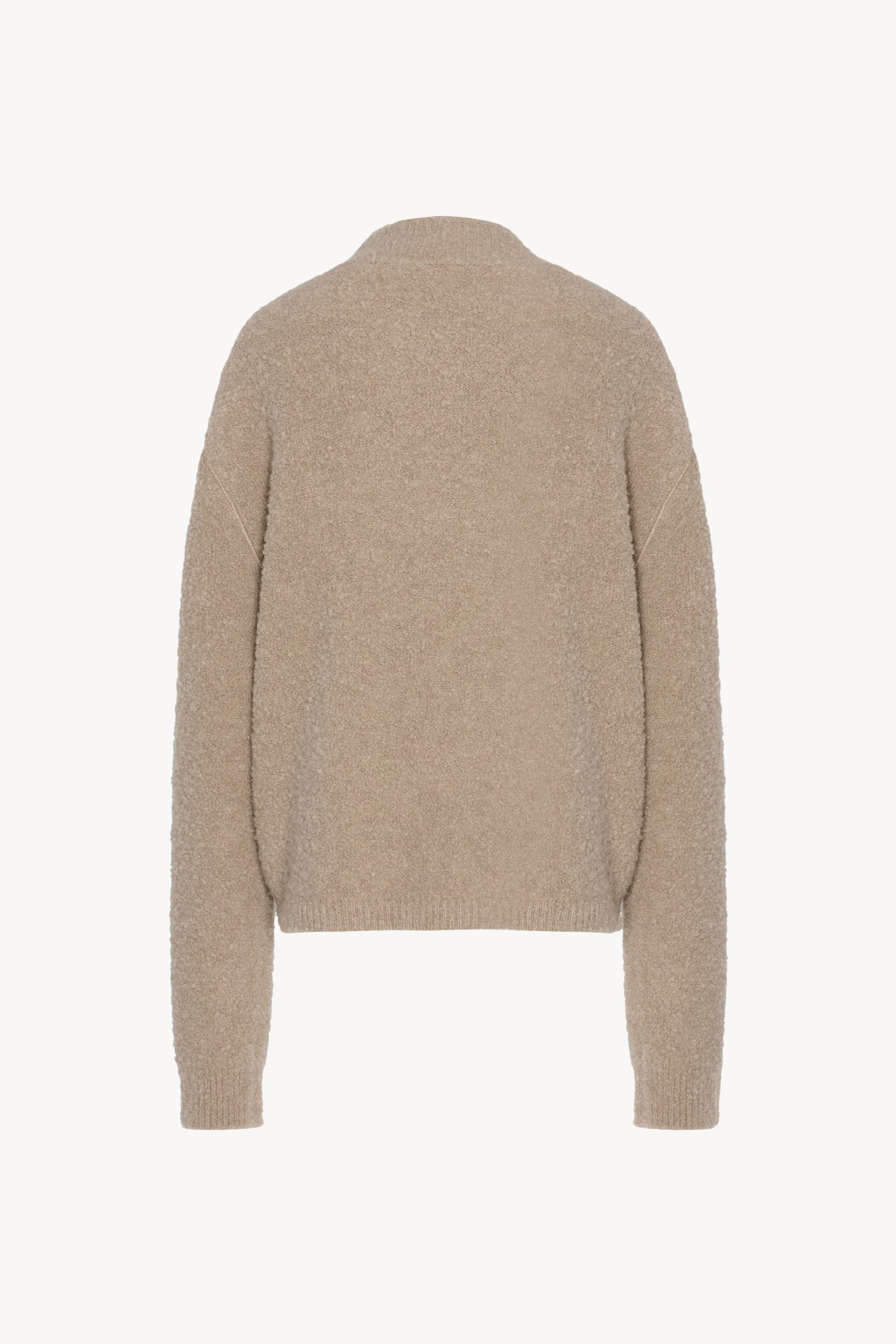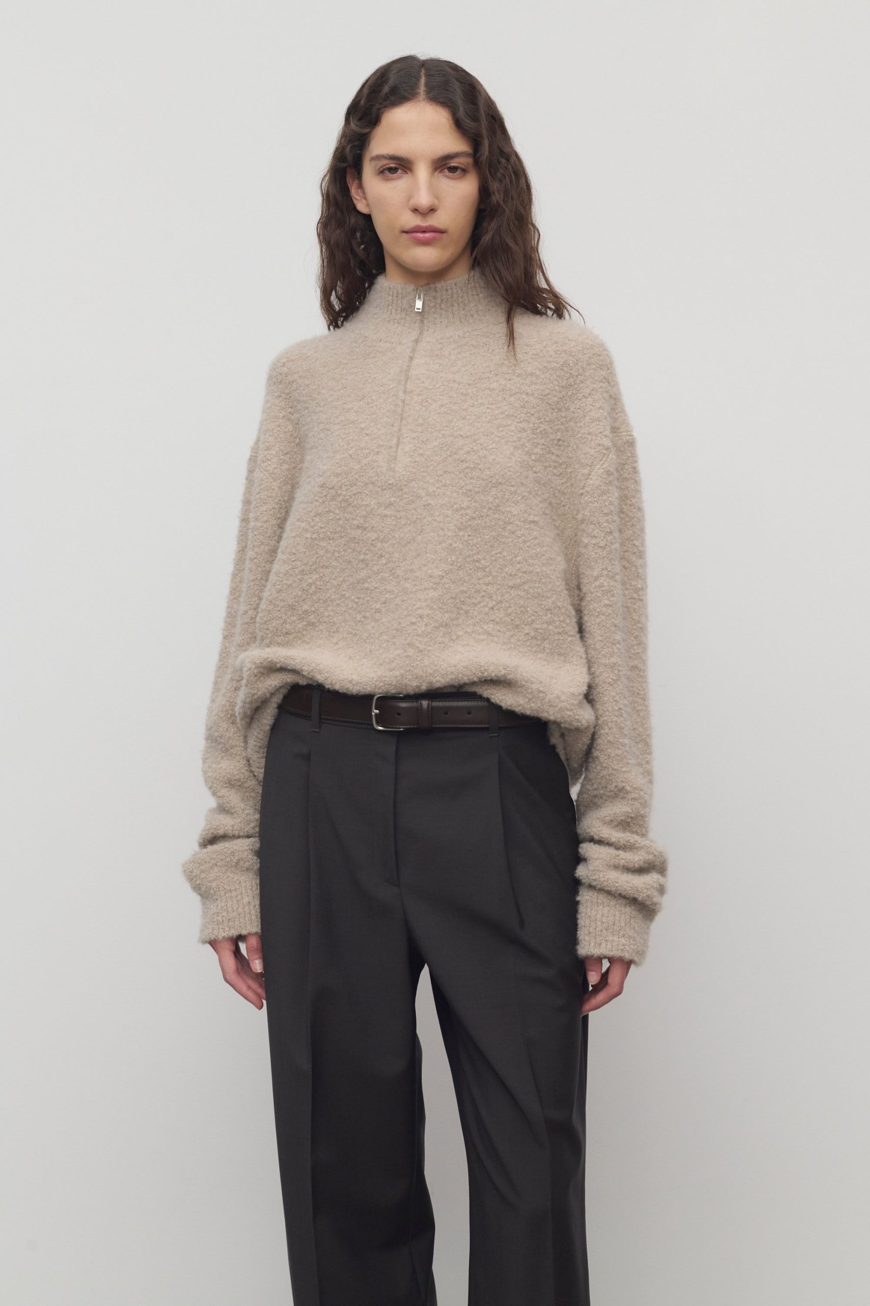 Boxy turtleneck sweater in textured alpaca and cashmere bouclé with front half-zip closure. topstitched armholes. and ribbed neckline. cuffs. and hem.