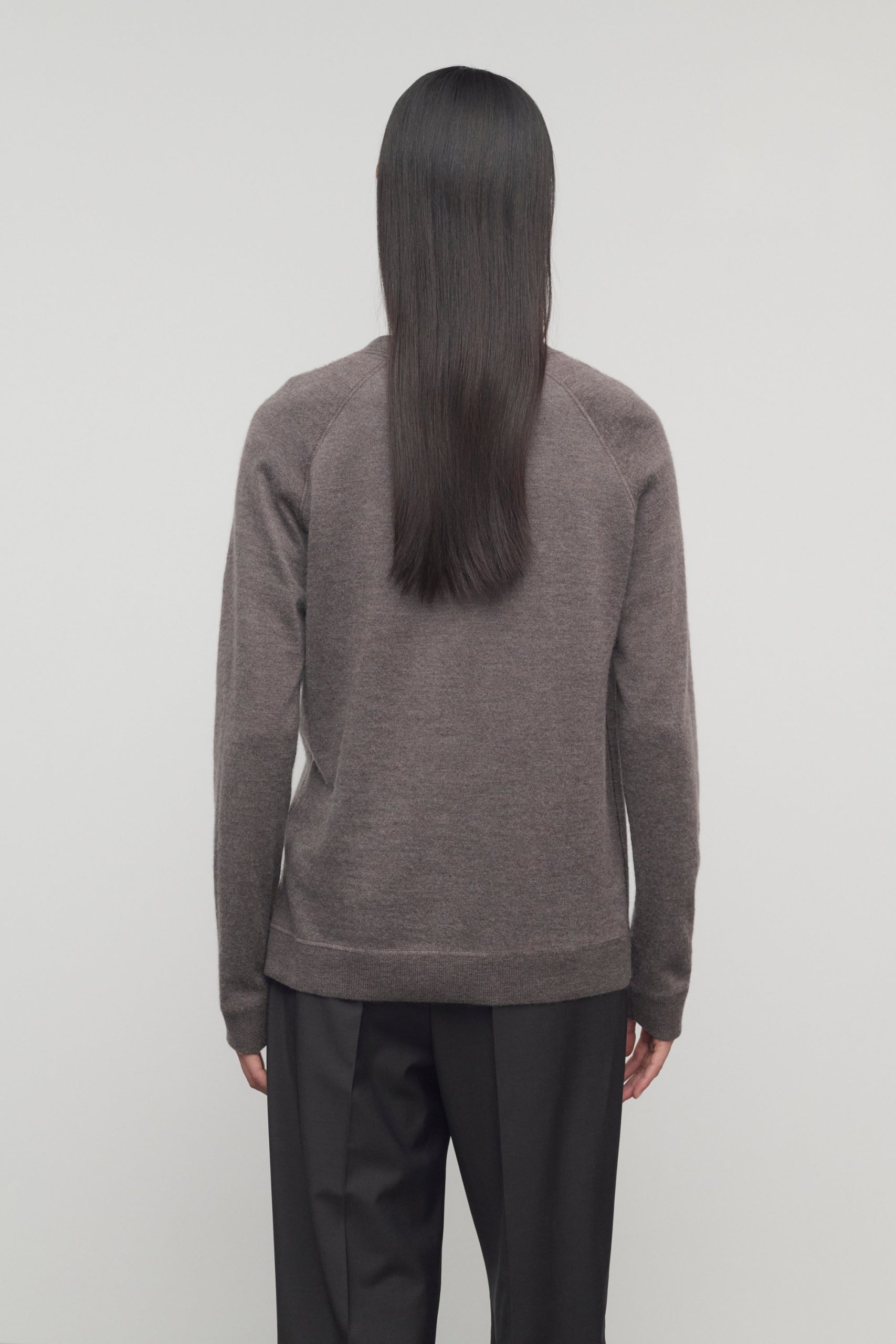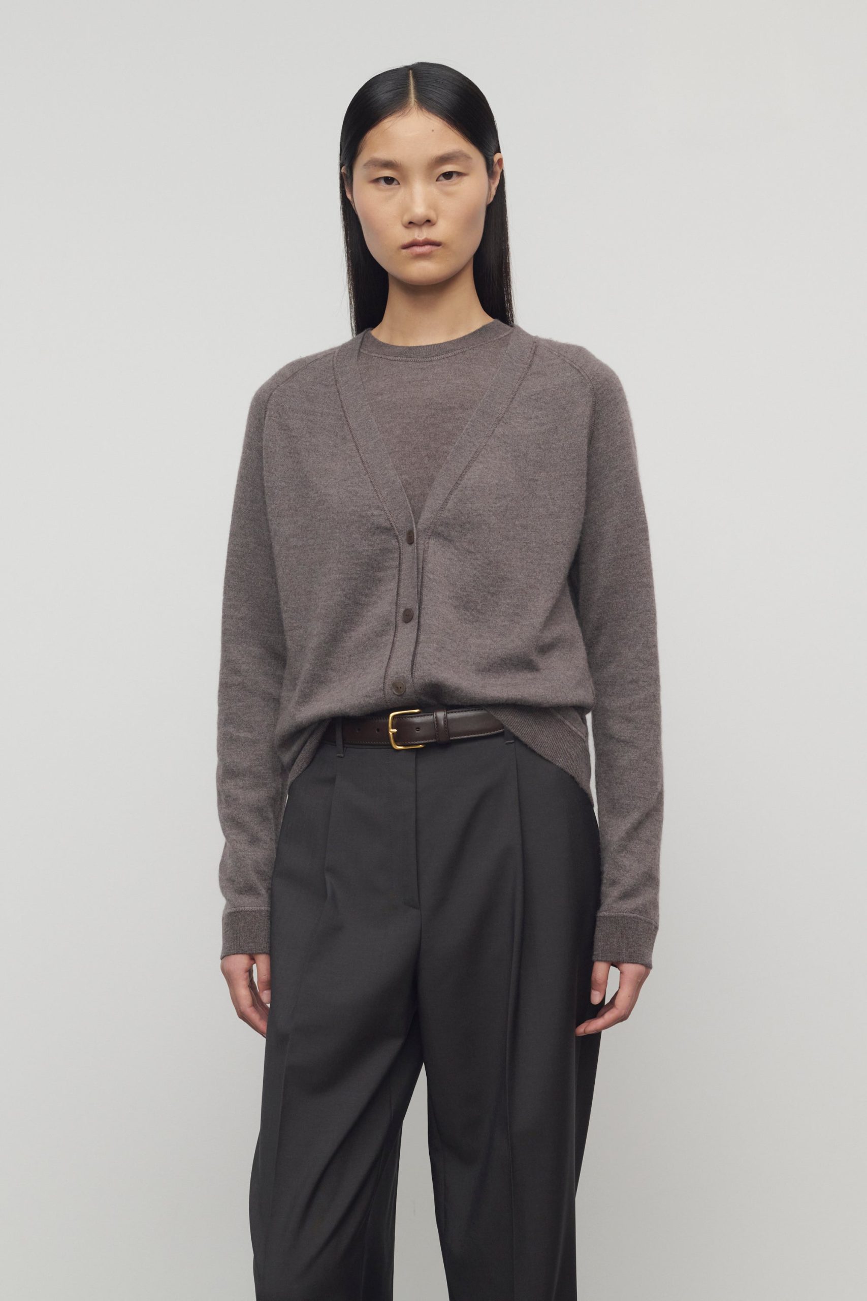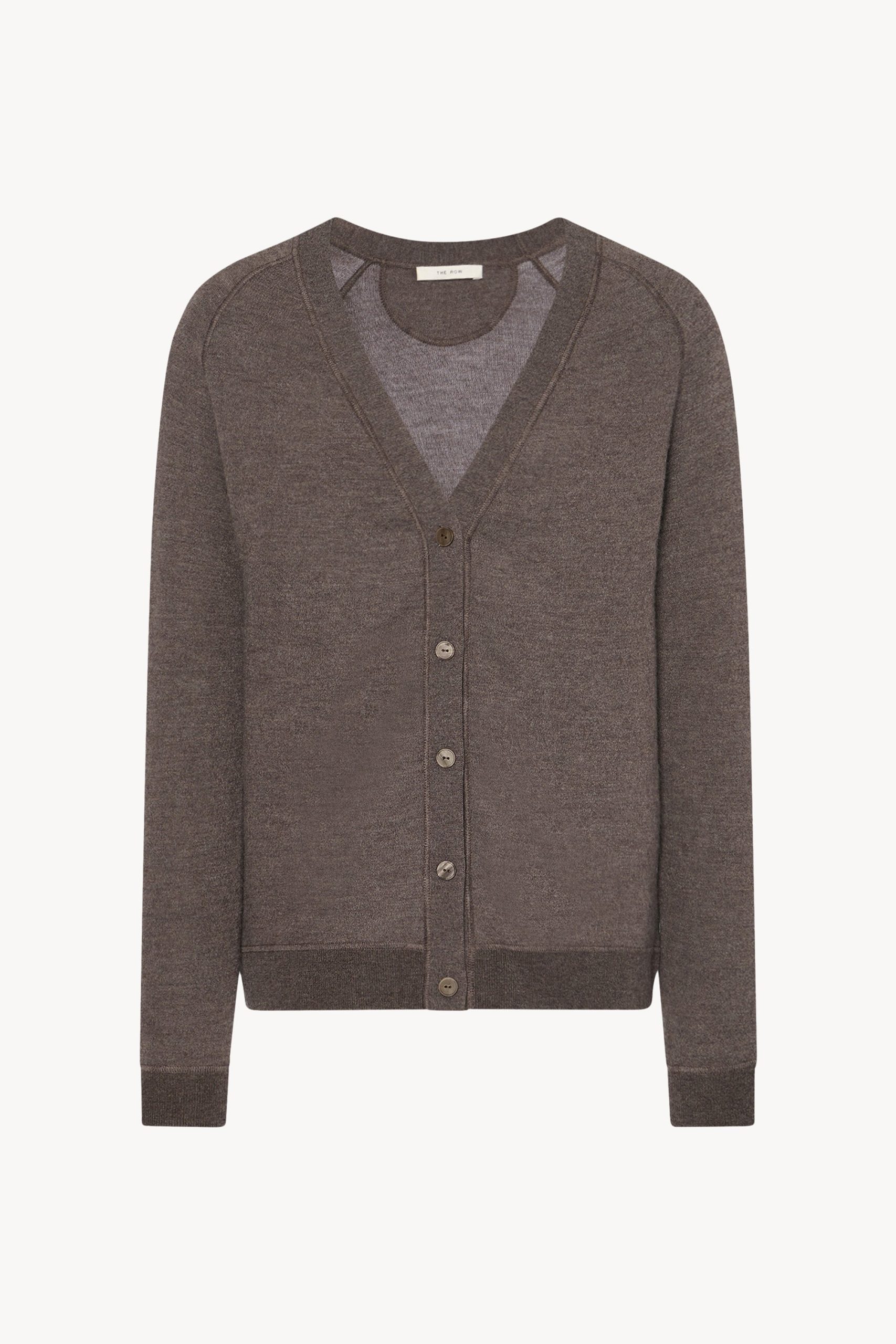 Relaxed v-neck cardigan in ultrafine cashmere jersey with covered stitch detailing. front button closure. and ribbed cuffs and hem.
