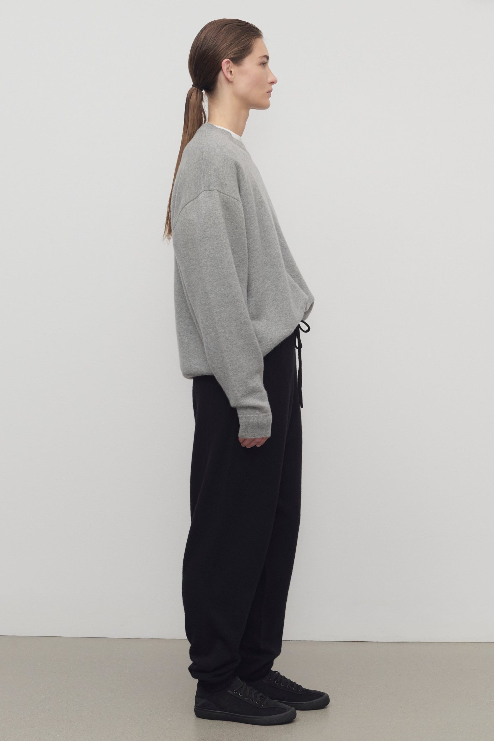 Mid-rise jogger pant in soft cashmere with slightly tapered leg and drawstring waist.