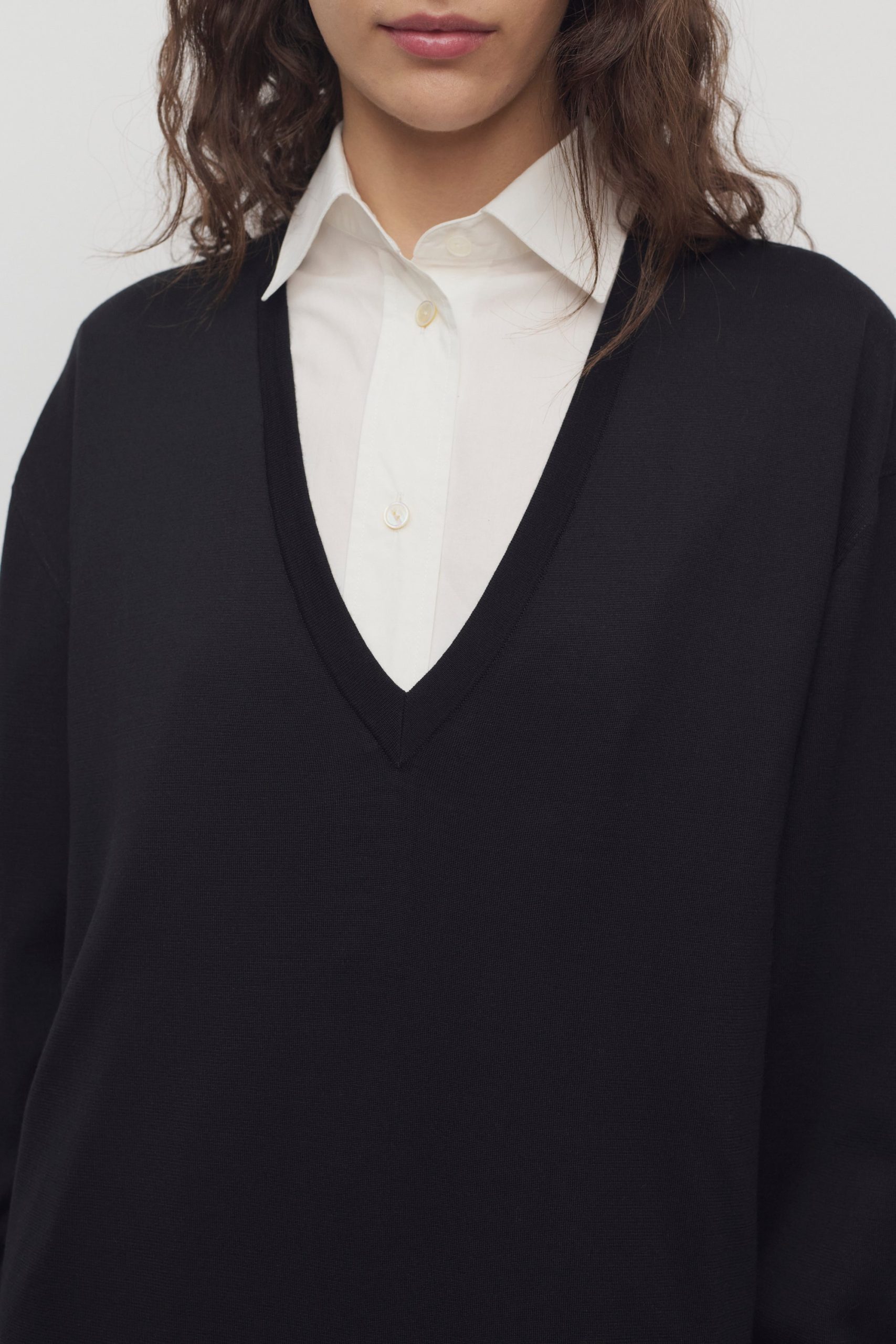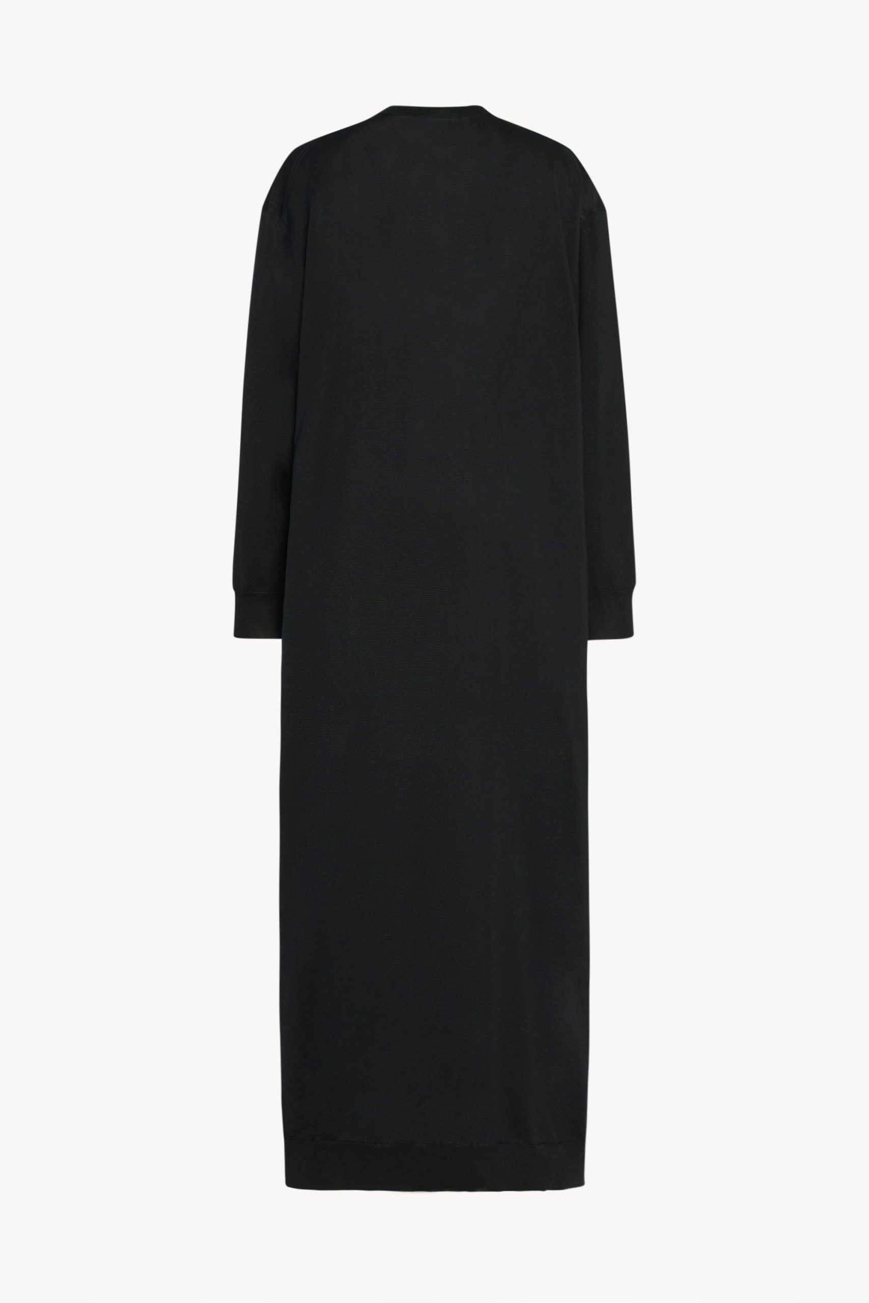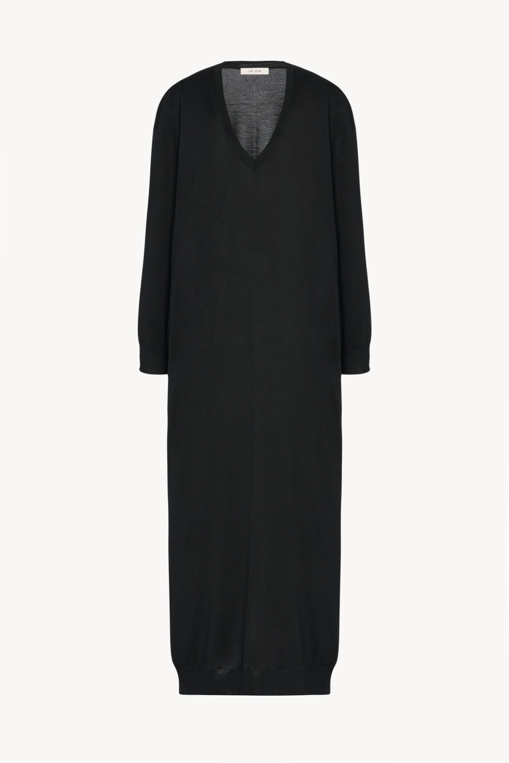 Ankle-length long-sleeved dress in finely knit silk with relaxed silhouette. deep v-neck. and ribbed neckline. cuffs. and hem.