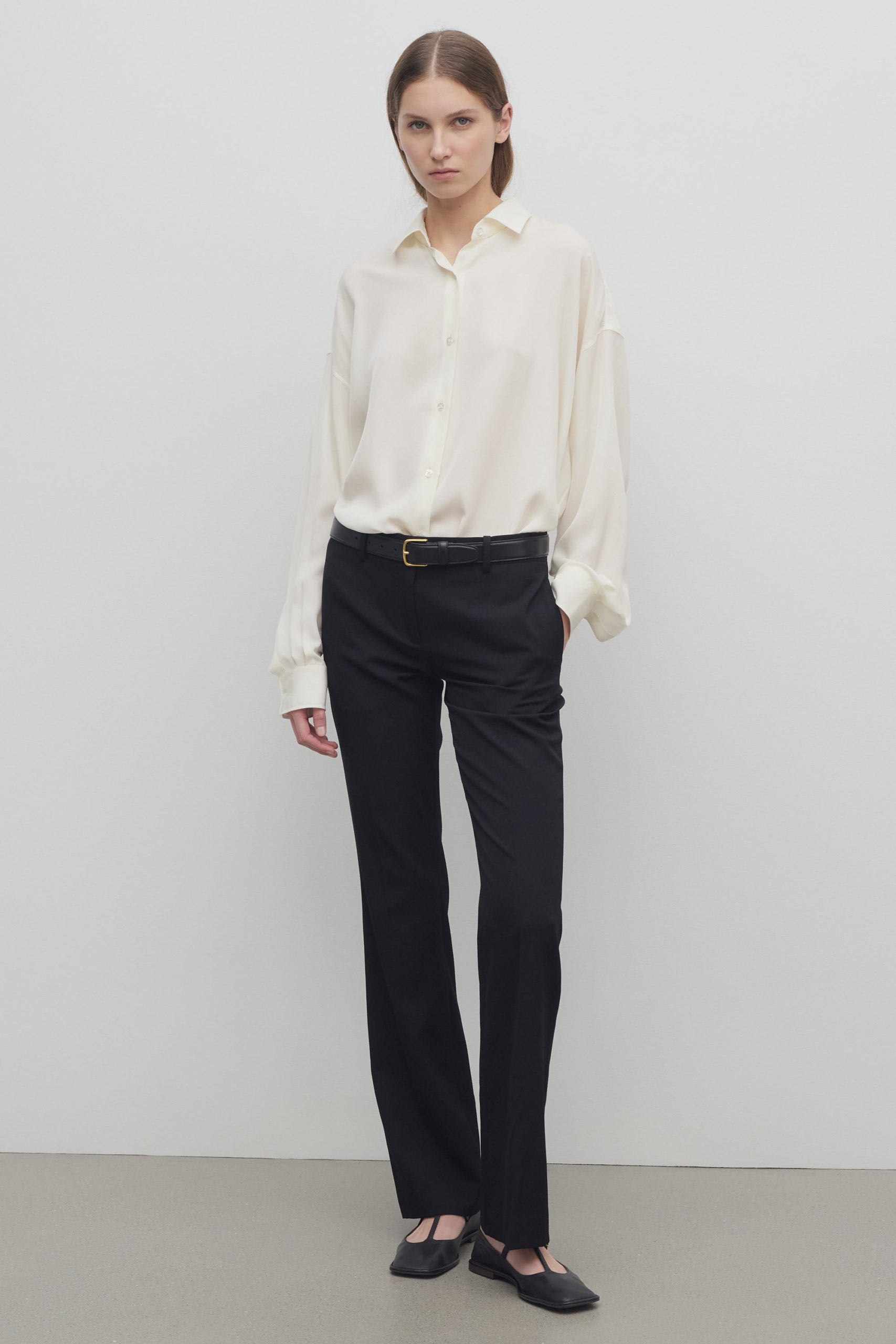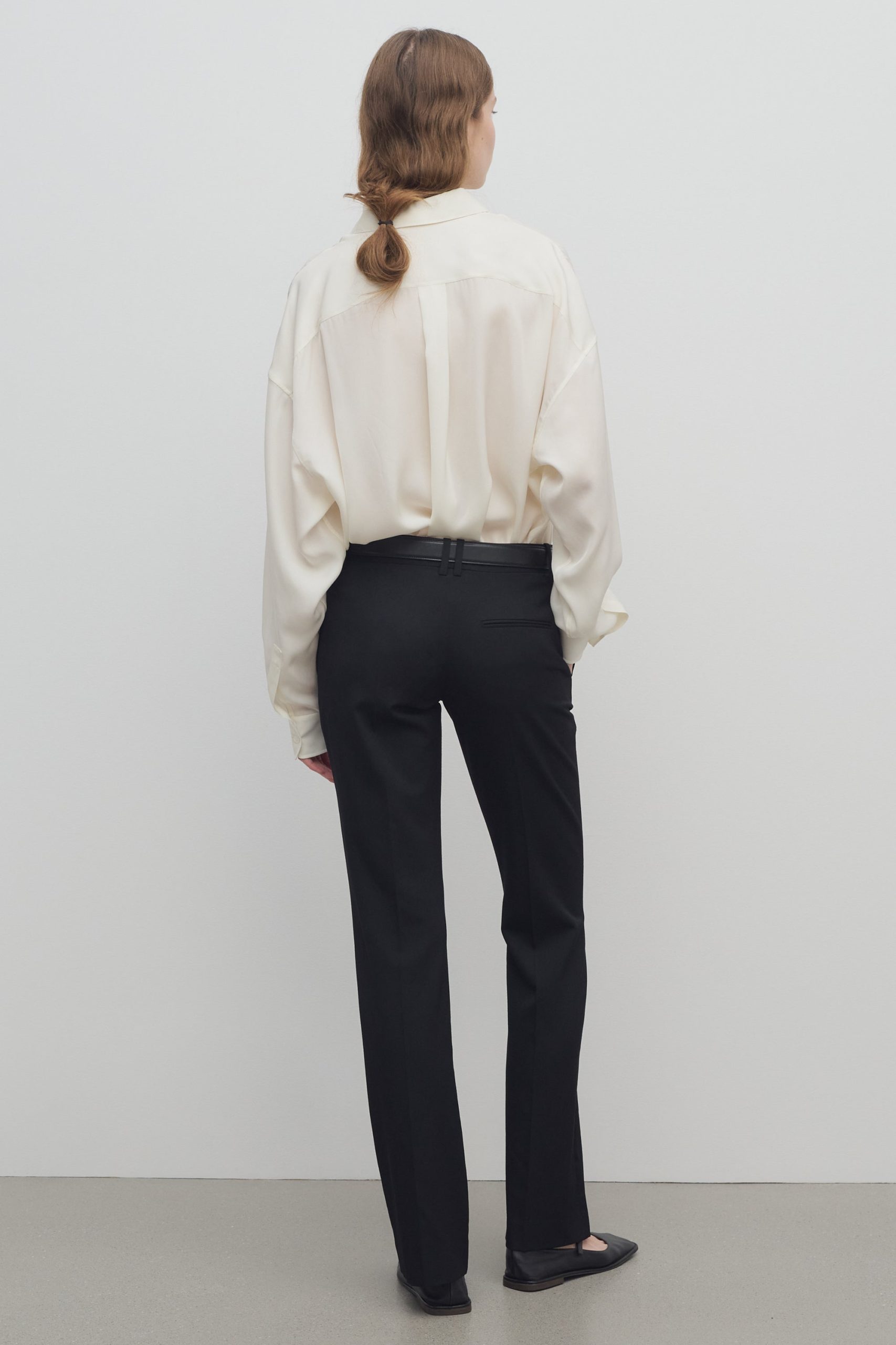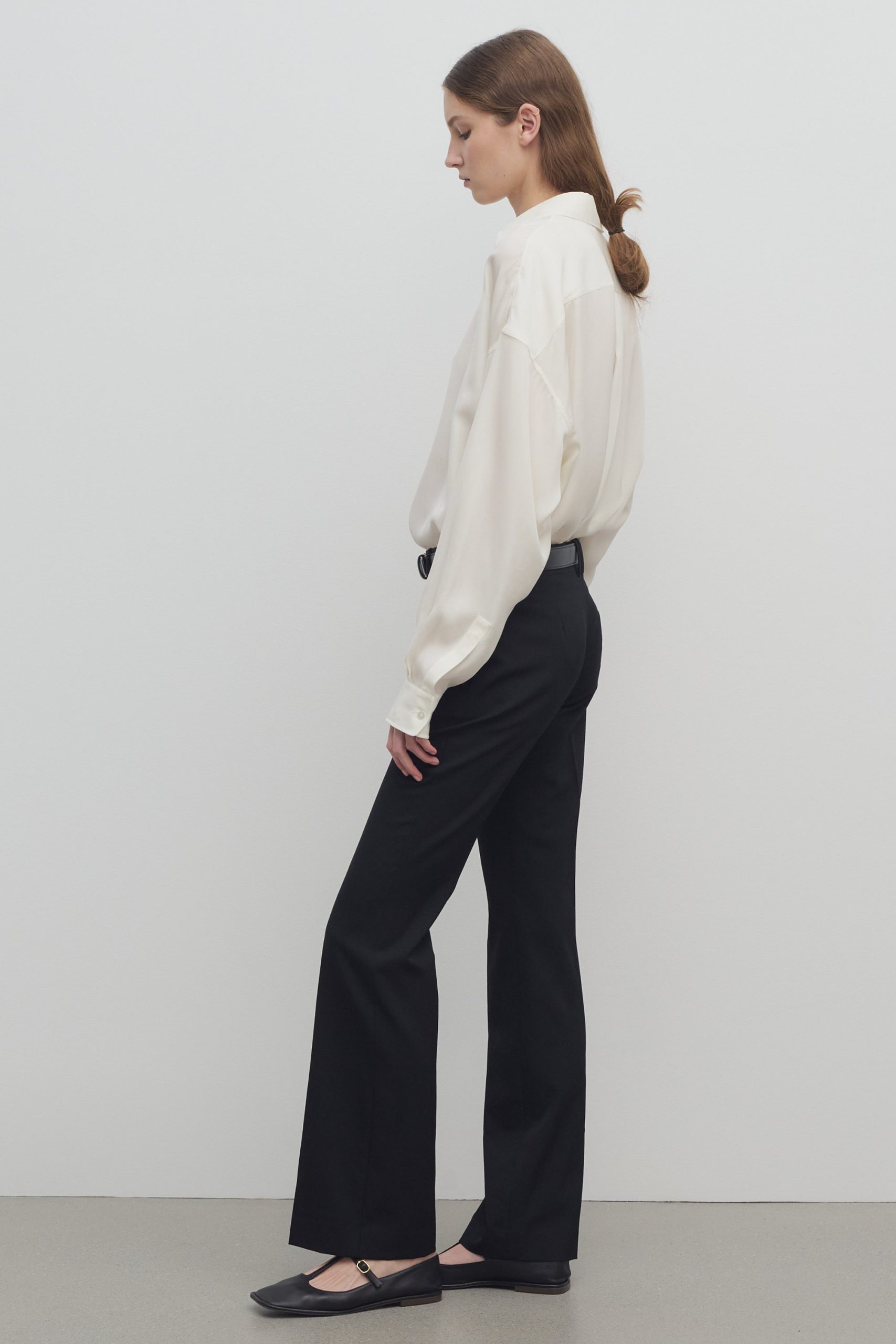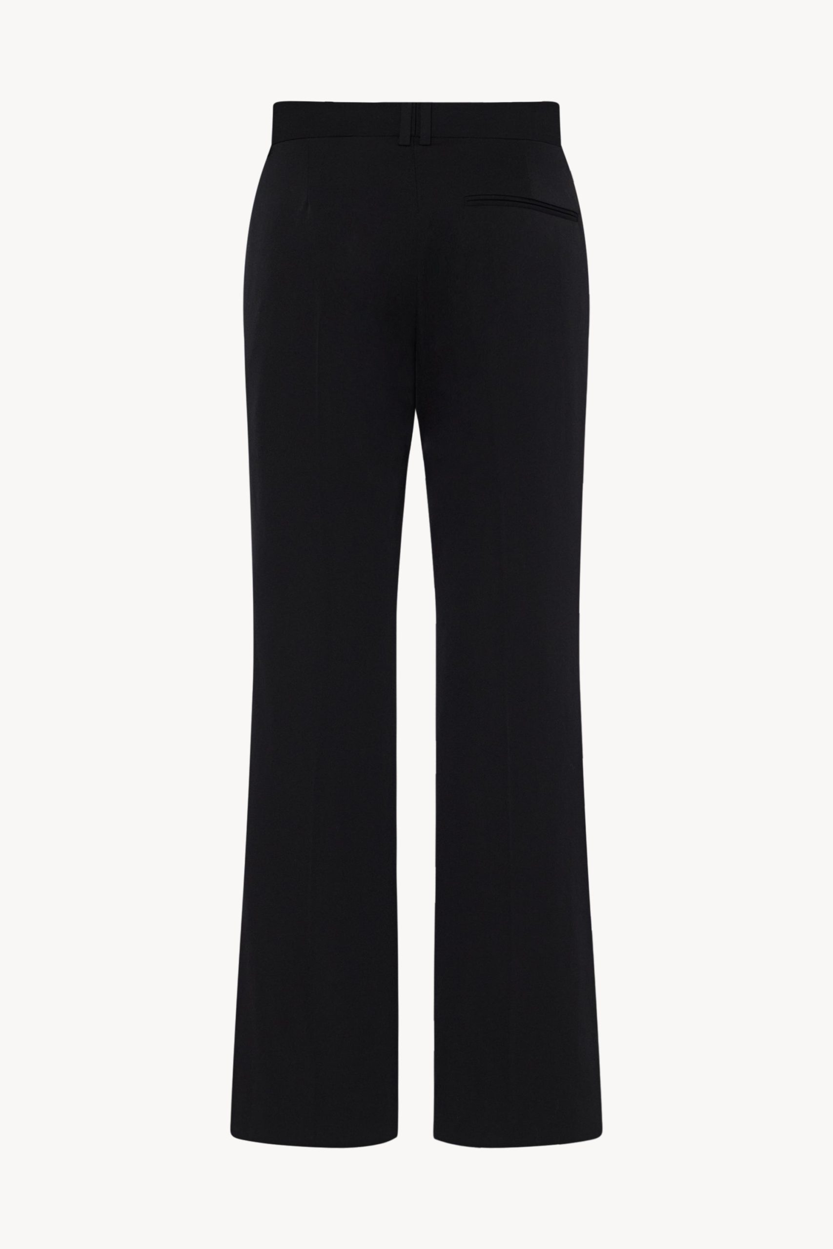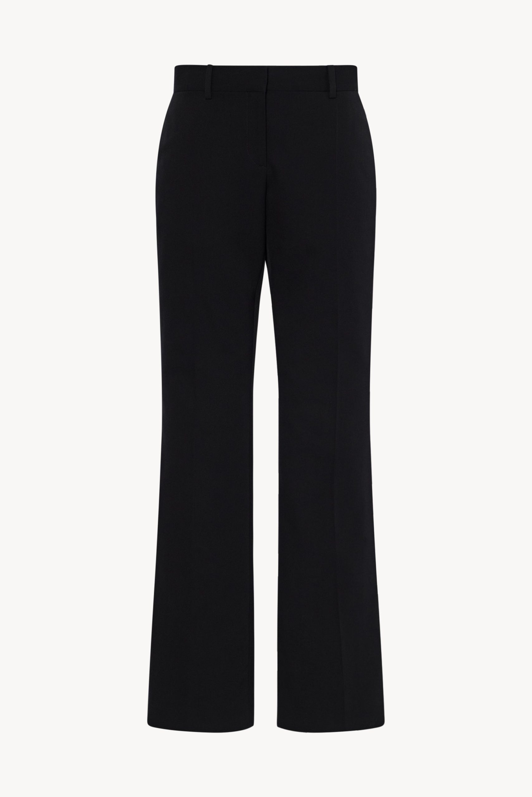 Low-rise trouser in textured wool with slanted side pockets. pressed front and back creases. and slightly flared hem.