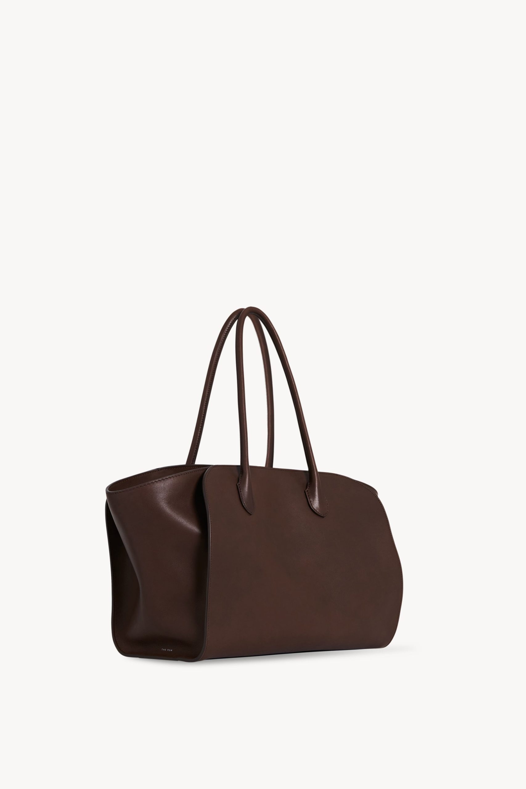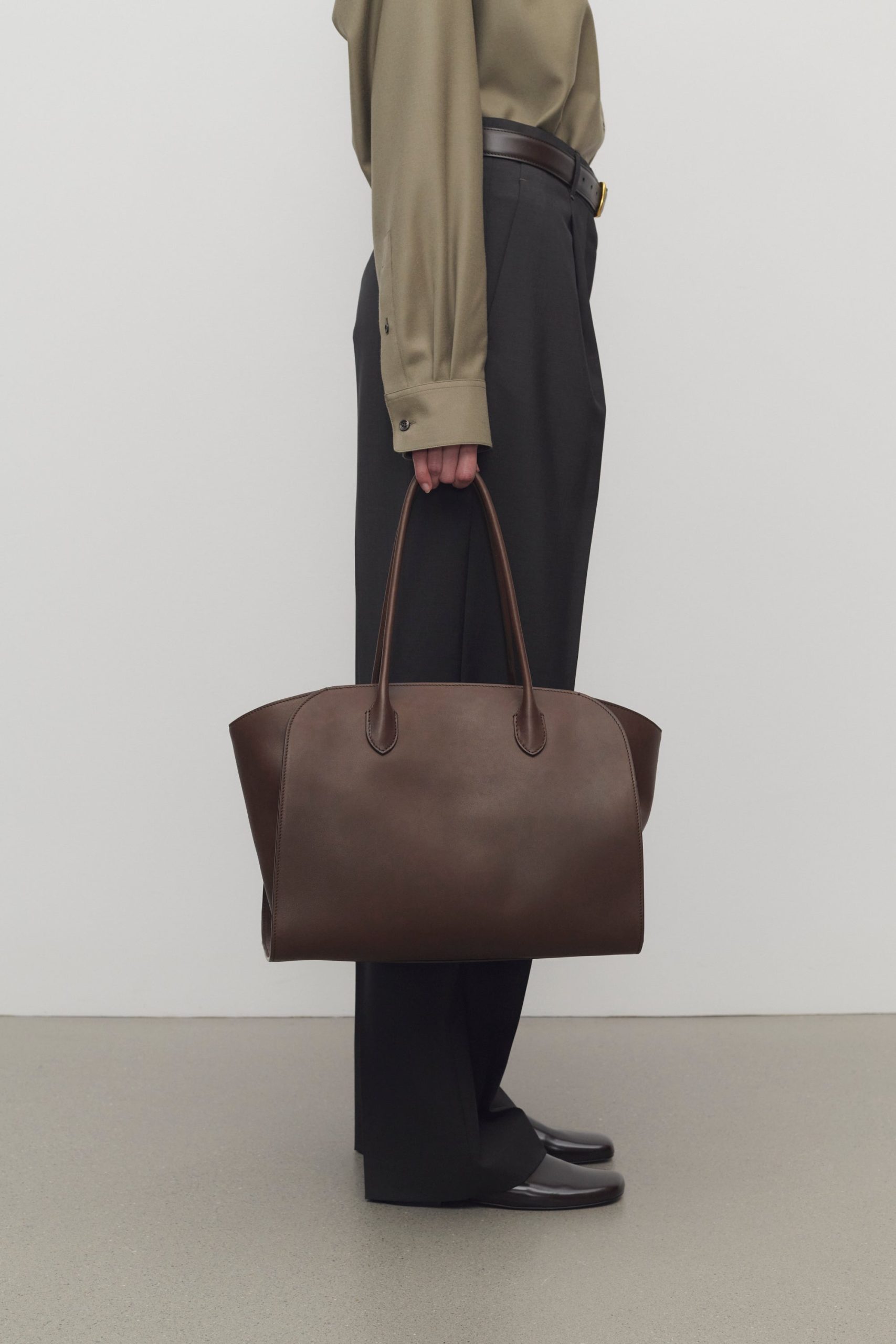 Softly structured tote bag in polished saddle leather with tubular handles. gusseted side panels. and top zipper closure. Untreated and drum-dyed. the leather develops character with time and use.
