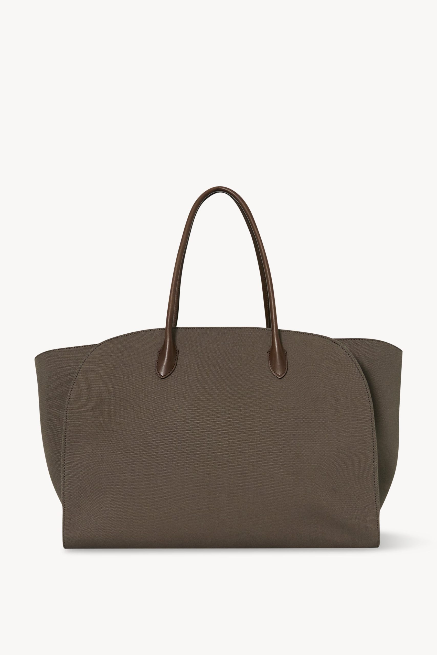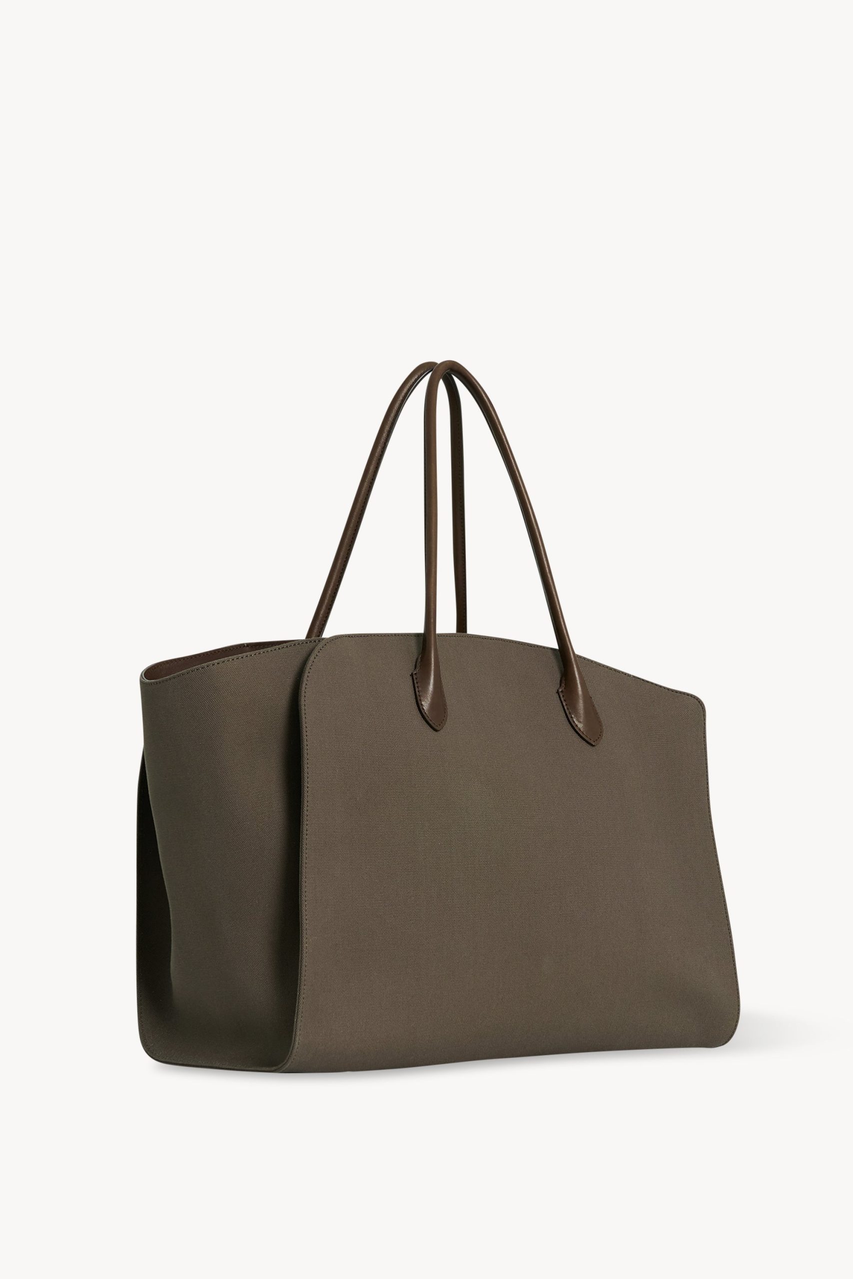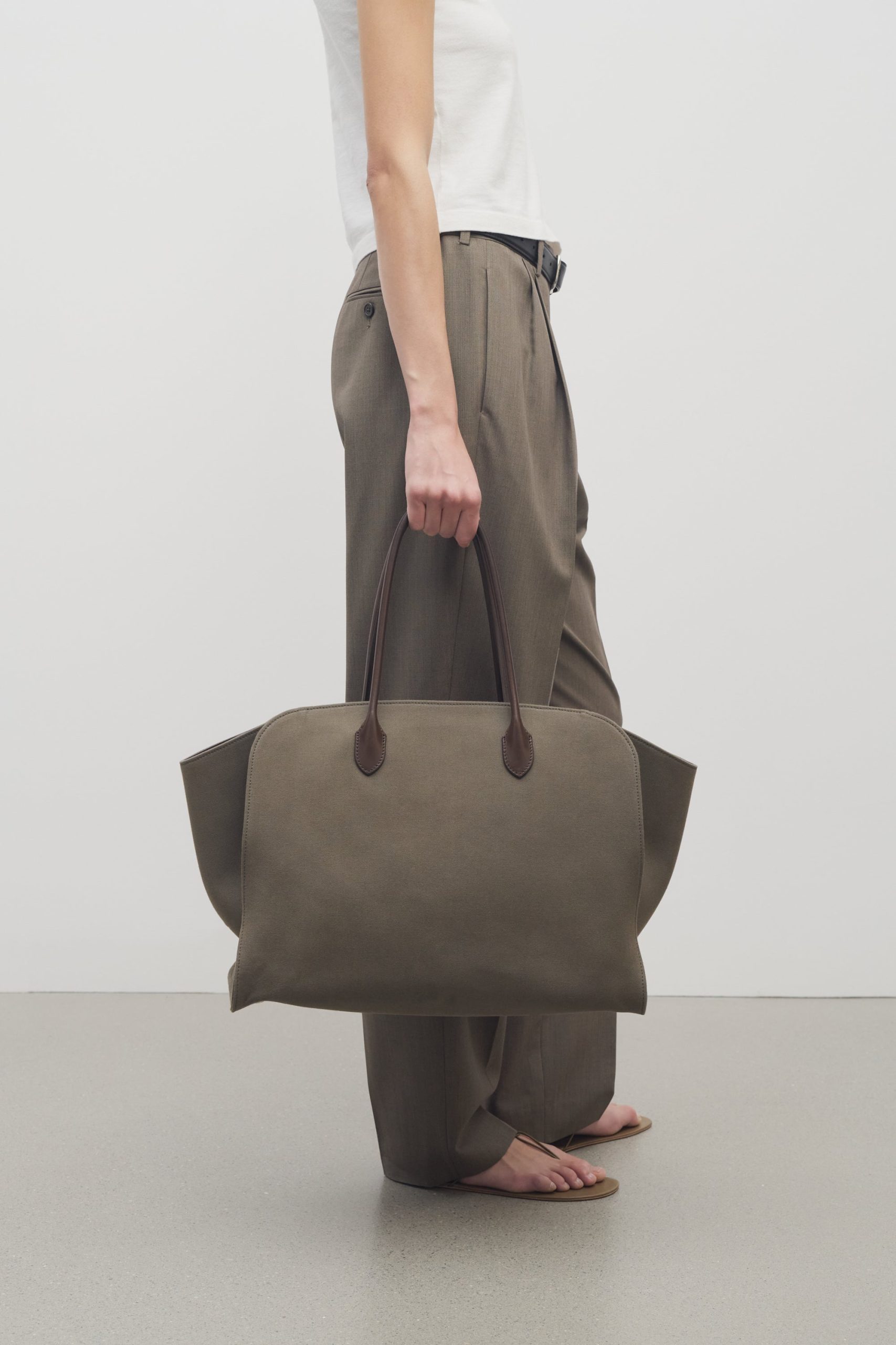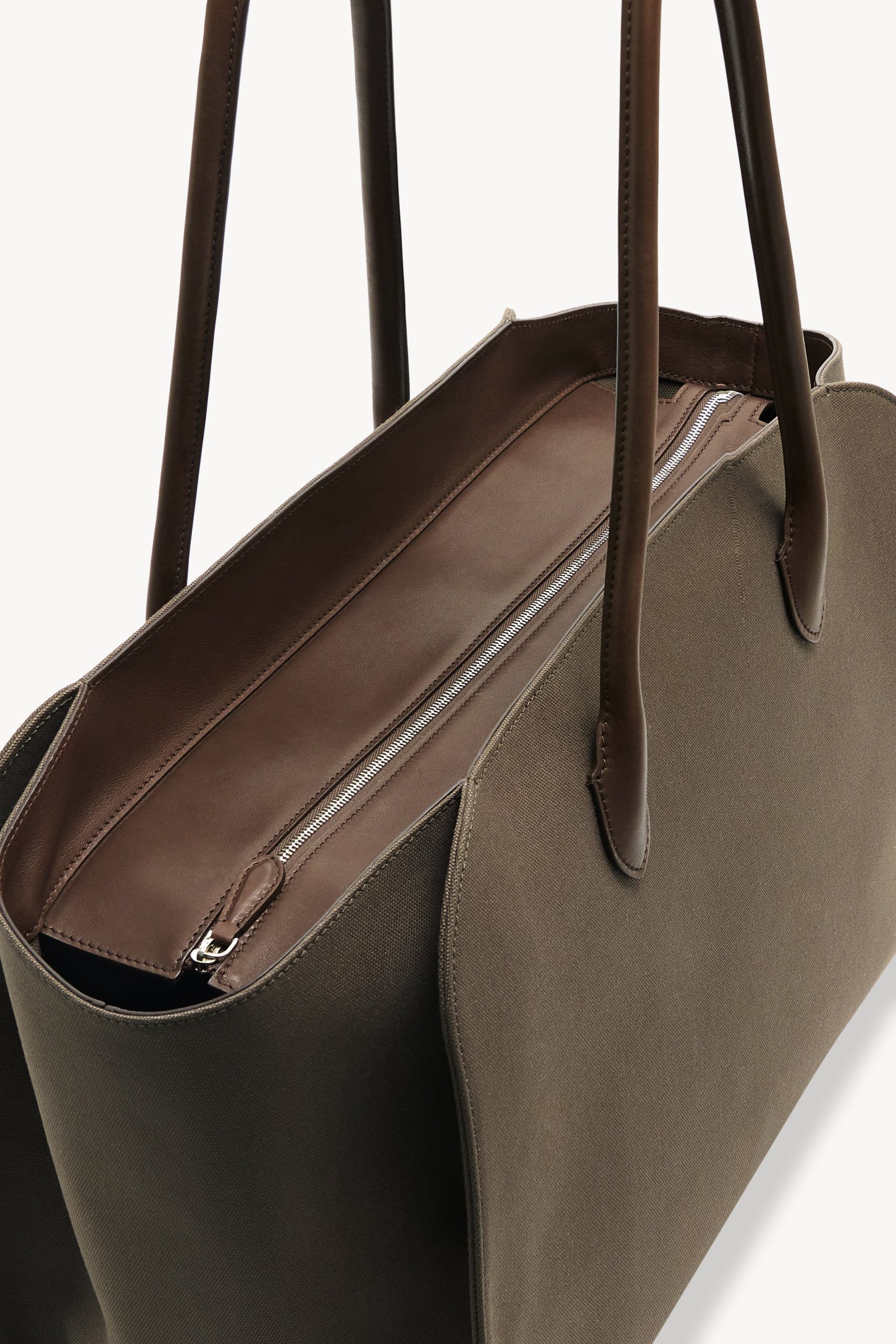 Softly structured tote bag in cotton canvas with tubular handles. gusseted side panels. and top zipper closure.