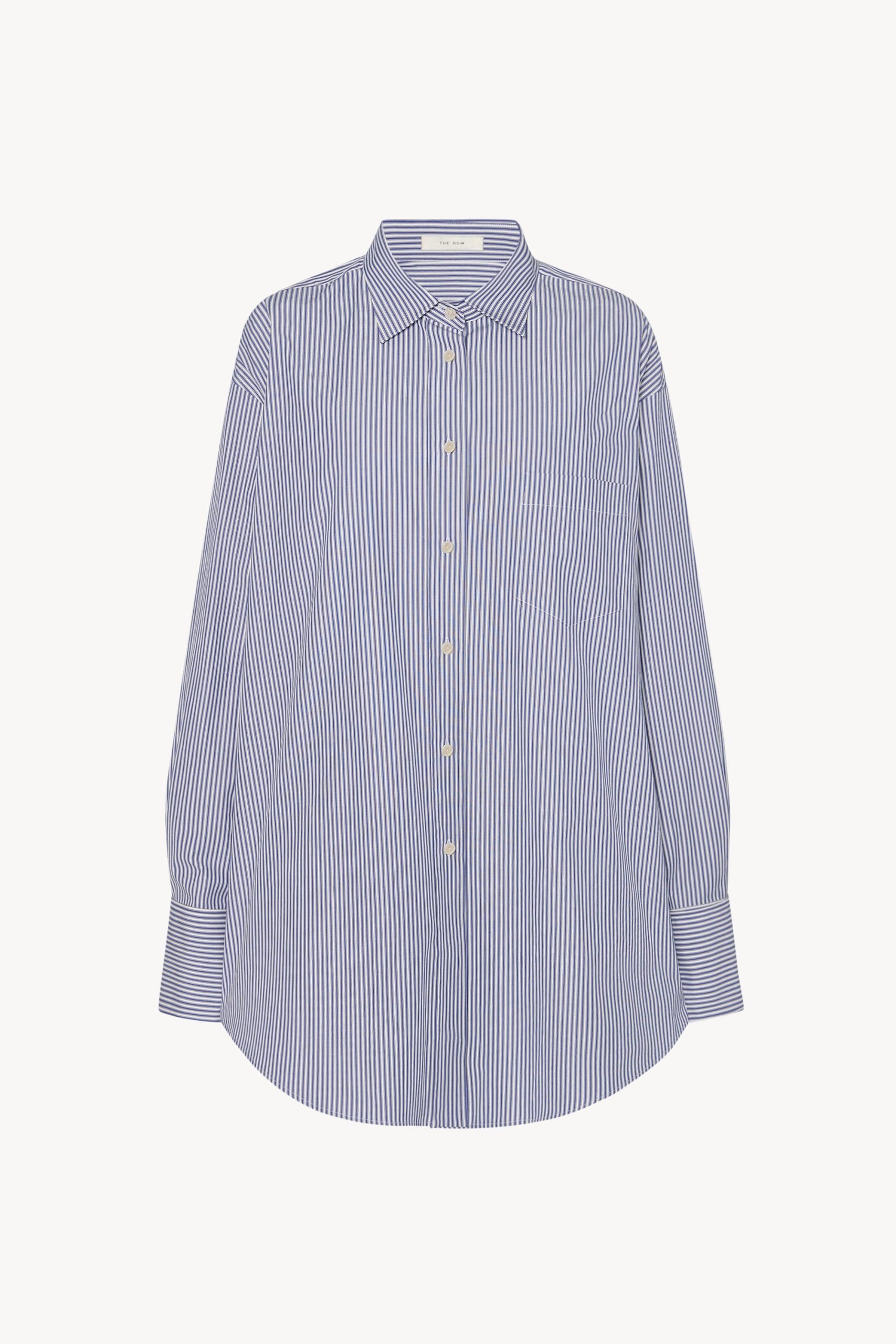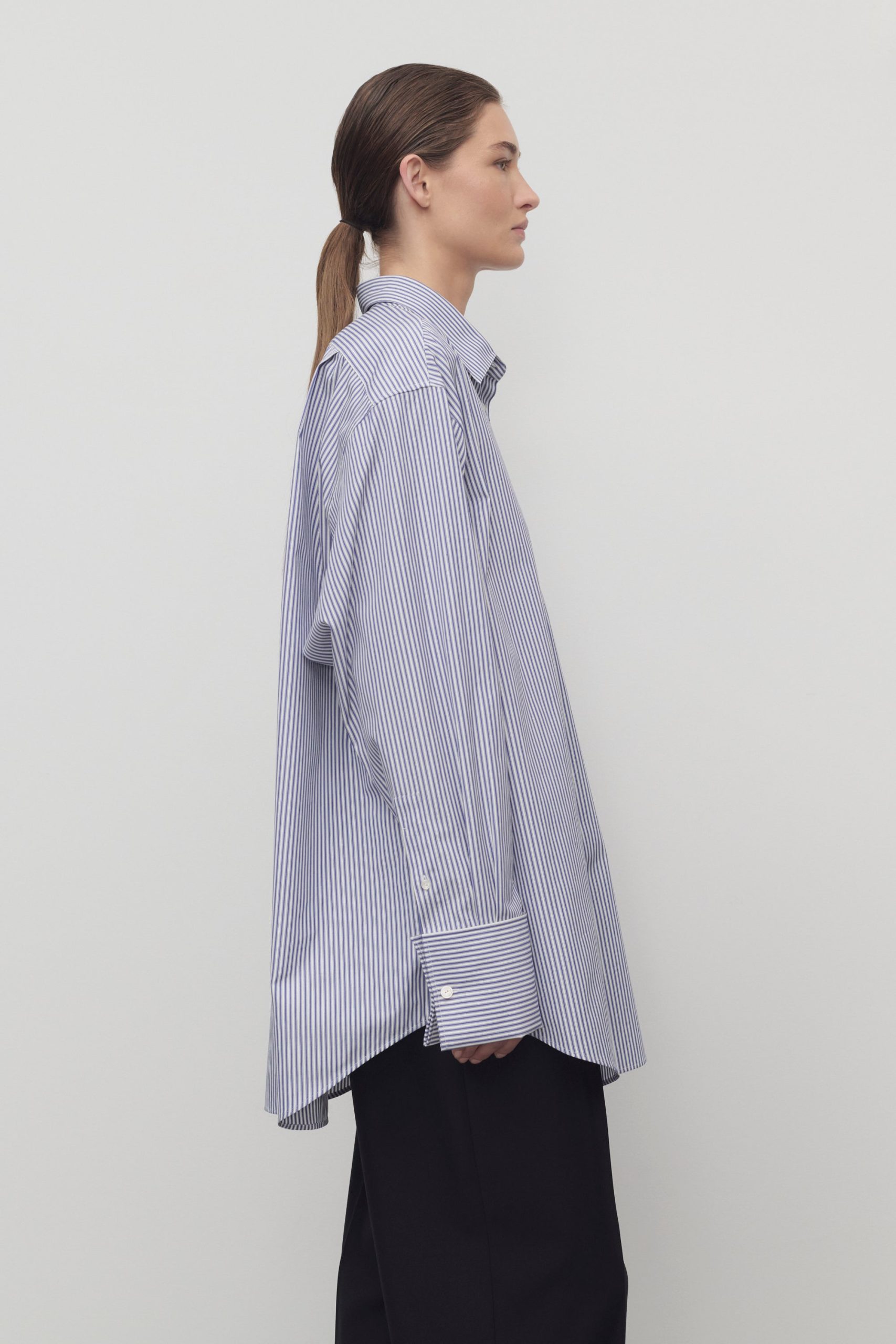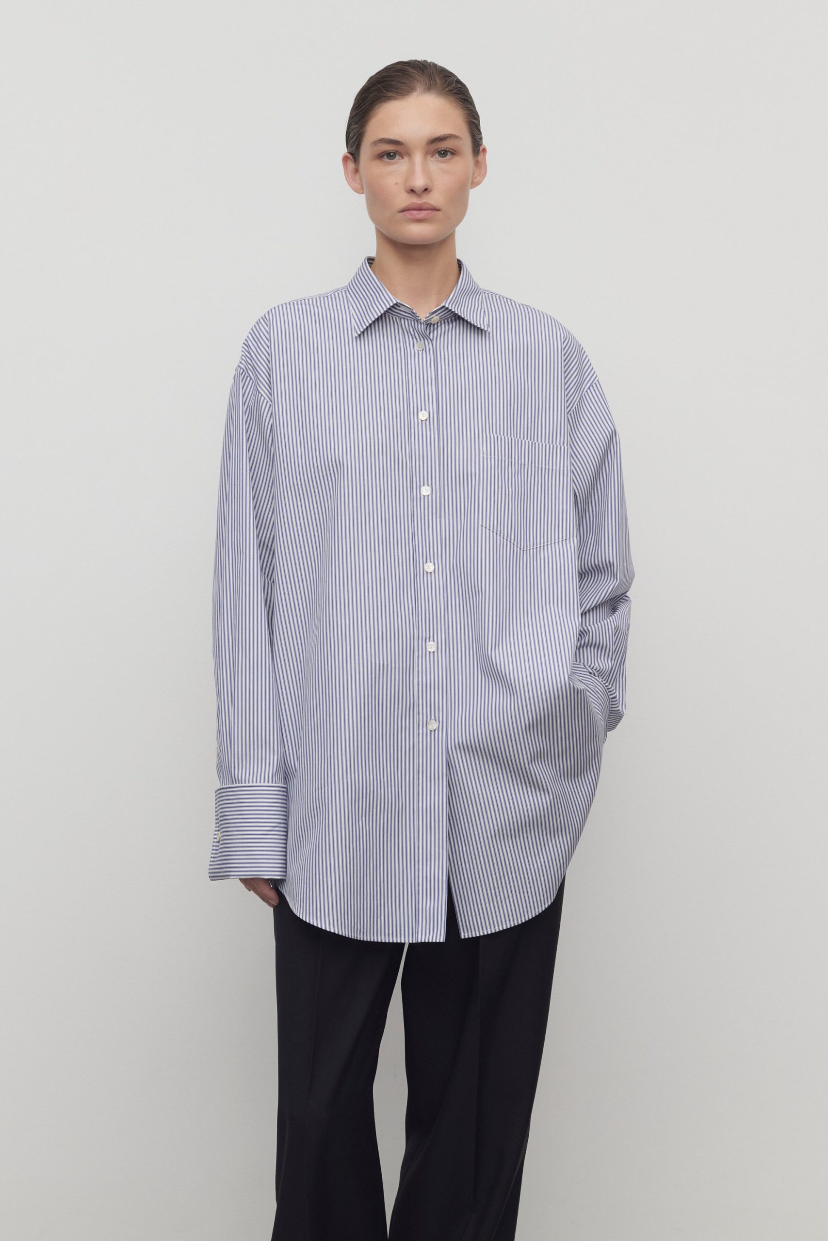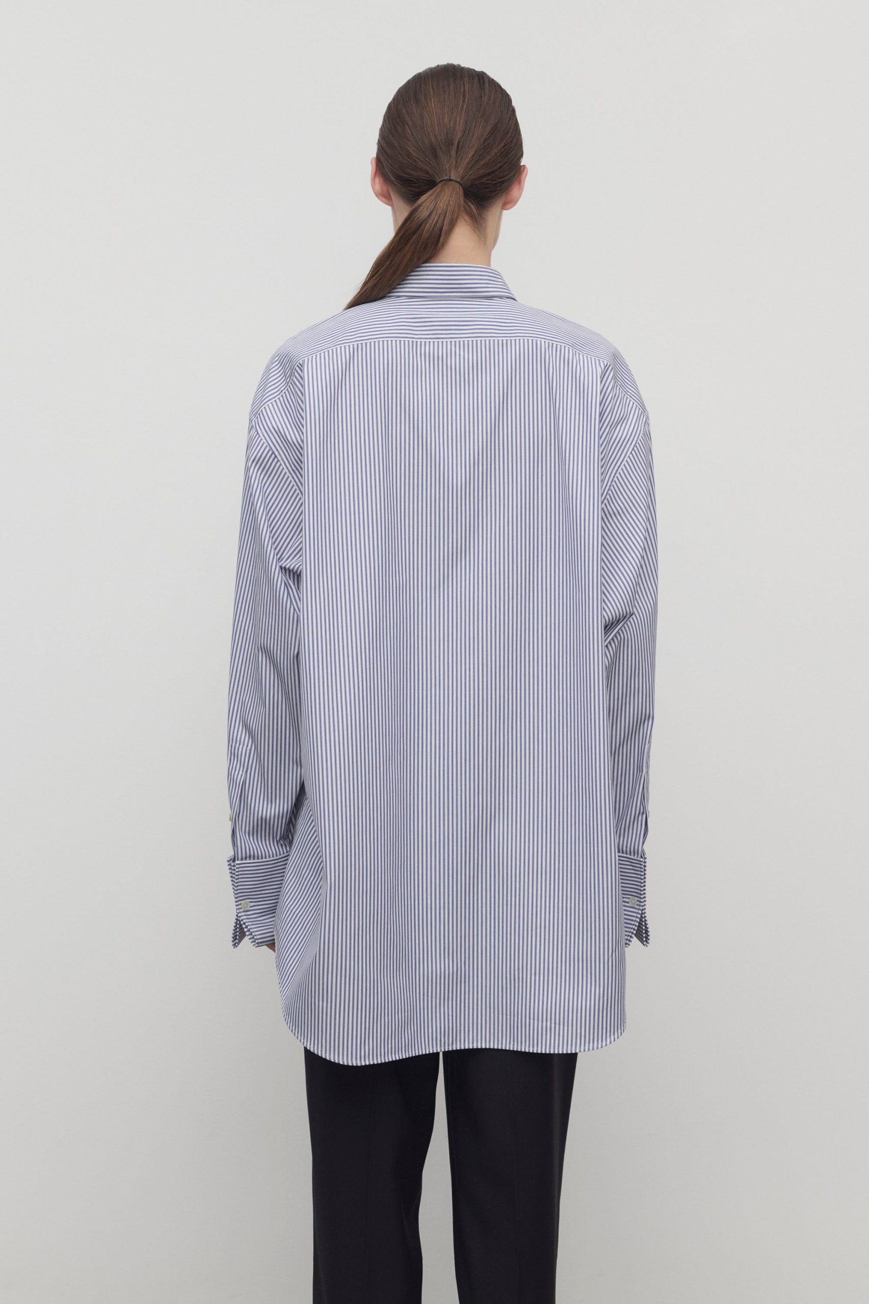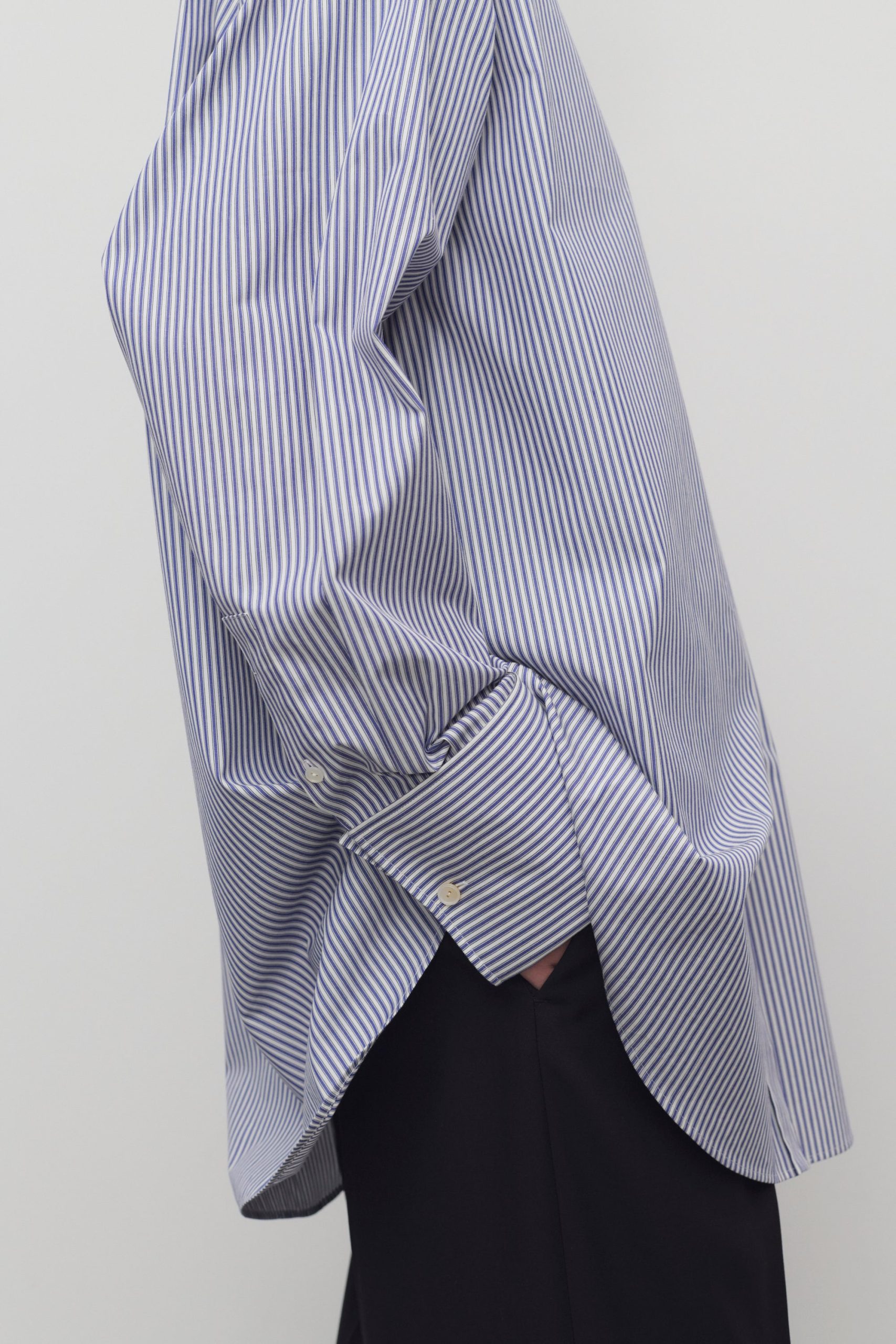 Classic button-up shirt in Japanese striped poplin with front patch pocket. elongated cuffs. and exposed front placket with mother-of-pearl buttons.