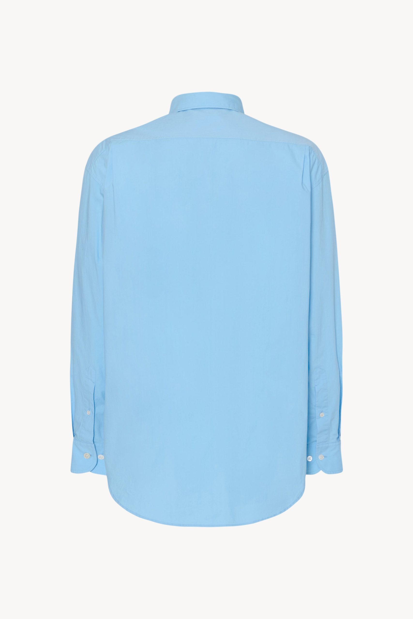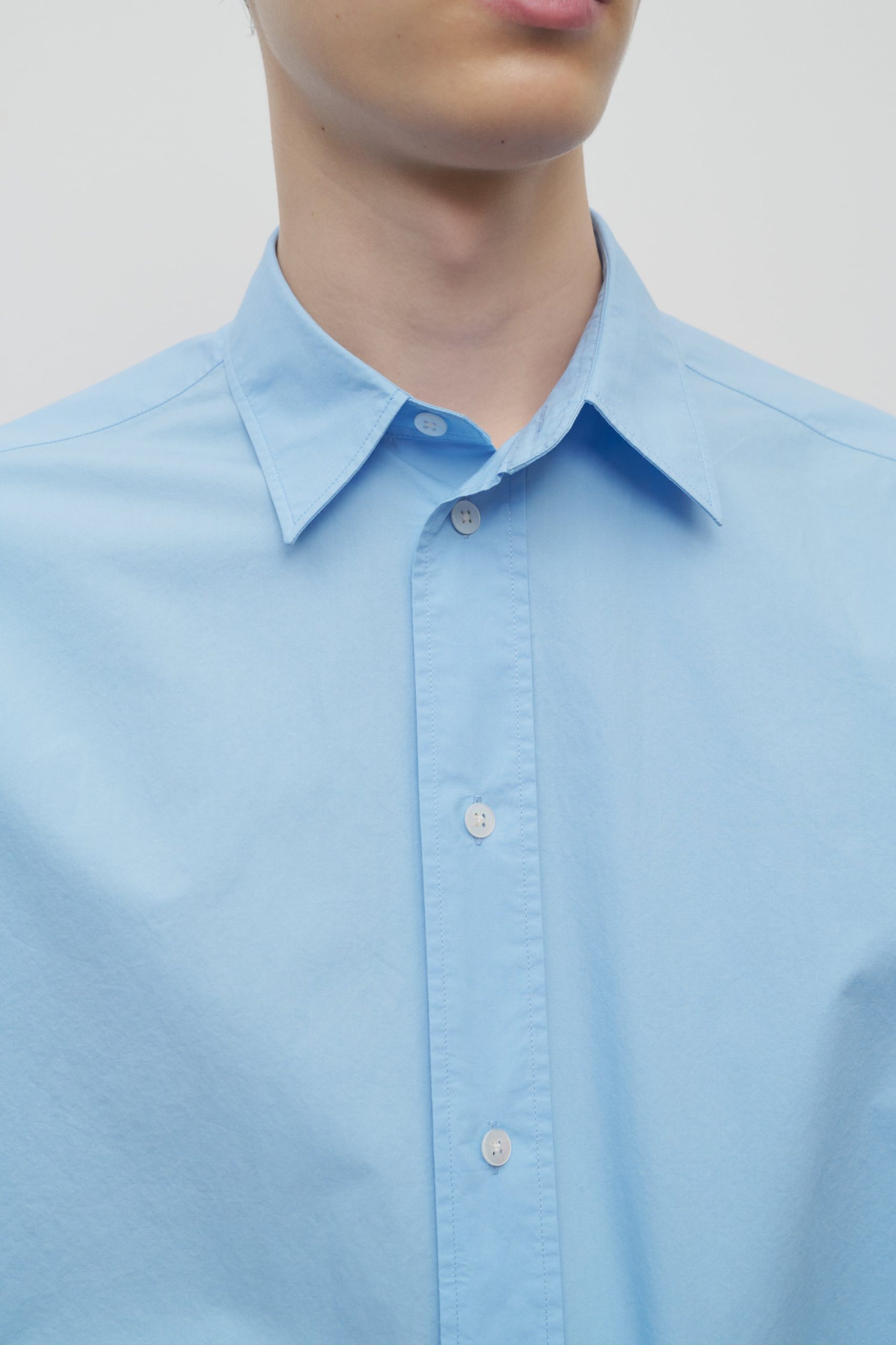 Classic button-up shirt in washed cotton poplin with slim back yoke. curved hem. and exposed front placket with mother-of-pearl buttons.