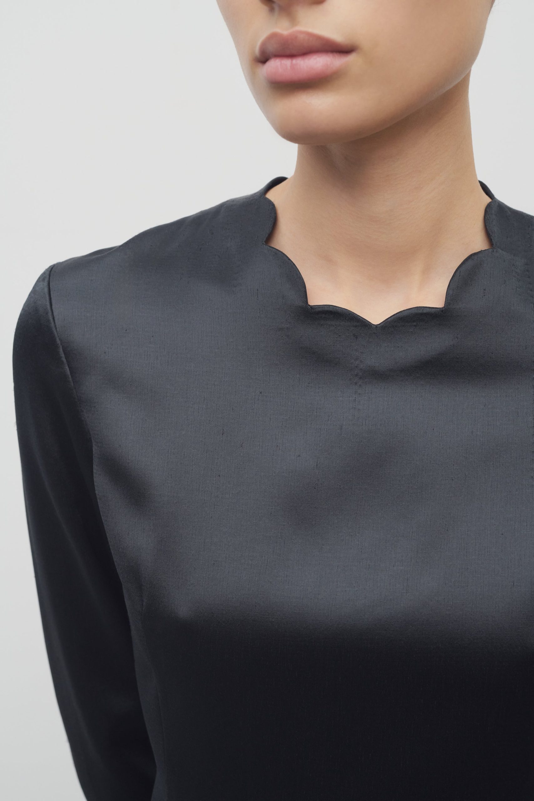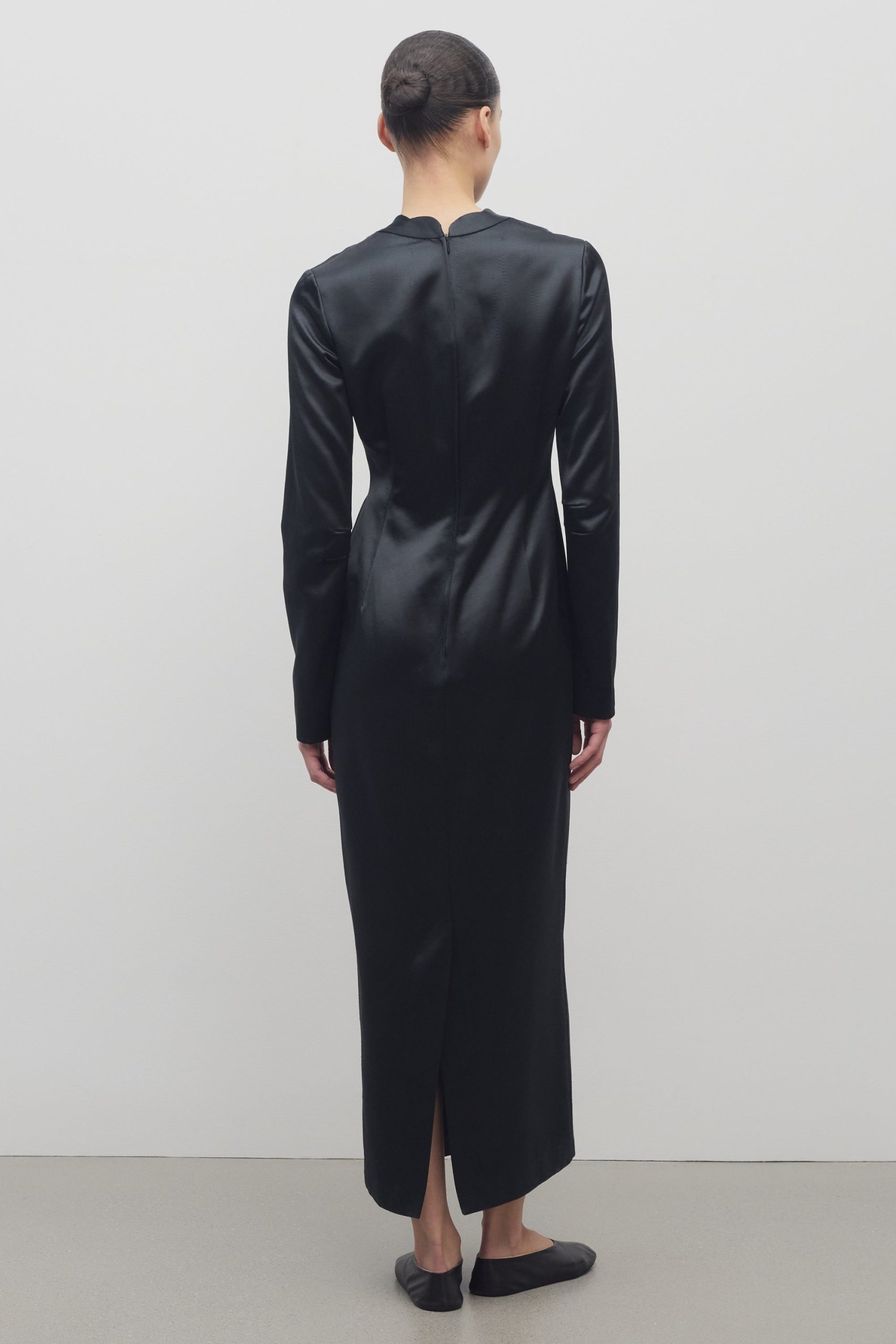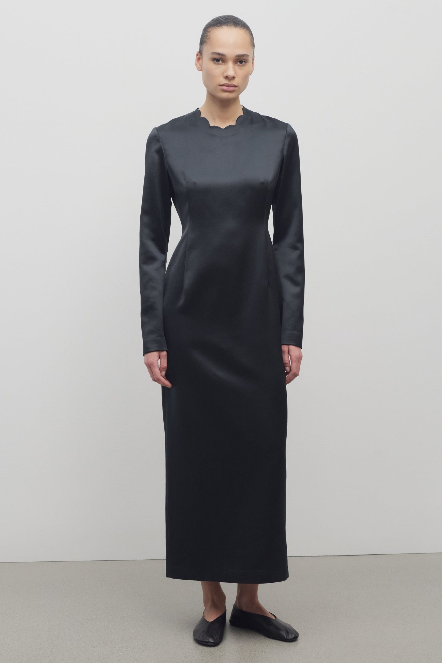 Ankle-length column dress in heavyweight silk satin with scalloped neckline. center back hem vent. and fitted silhouette.