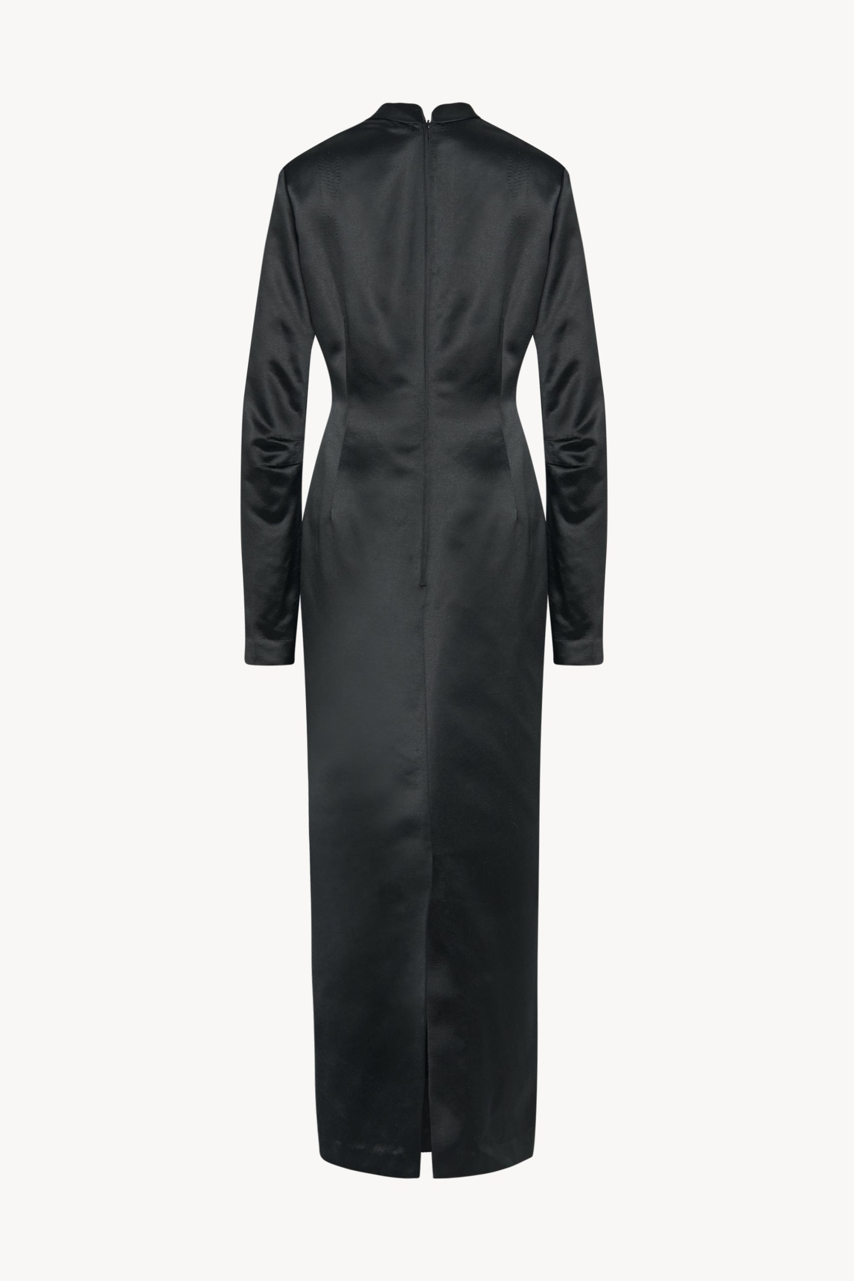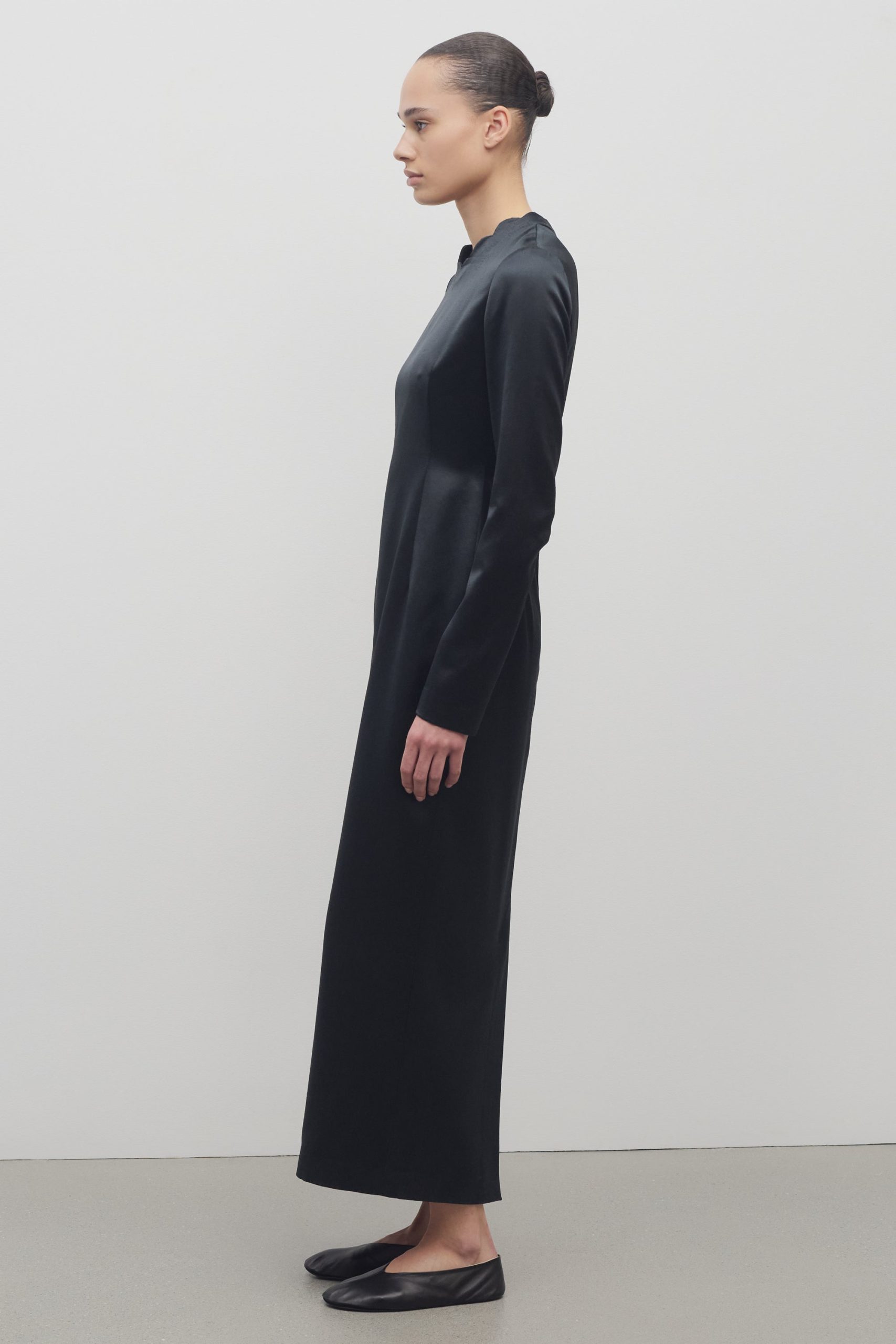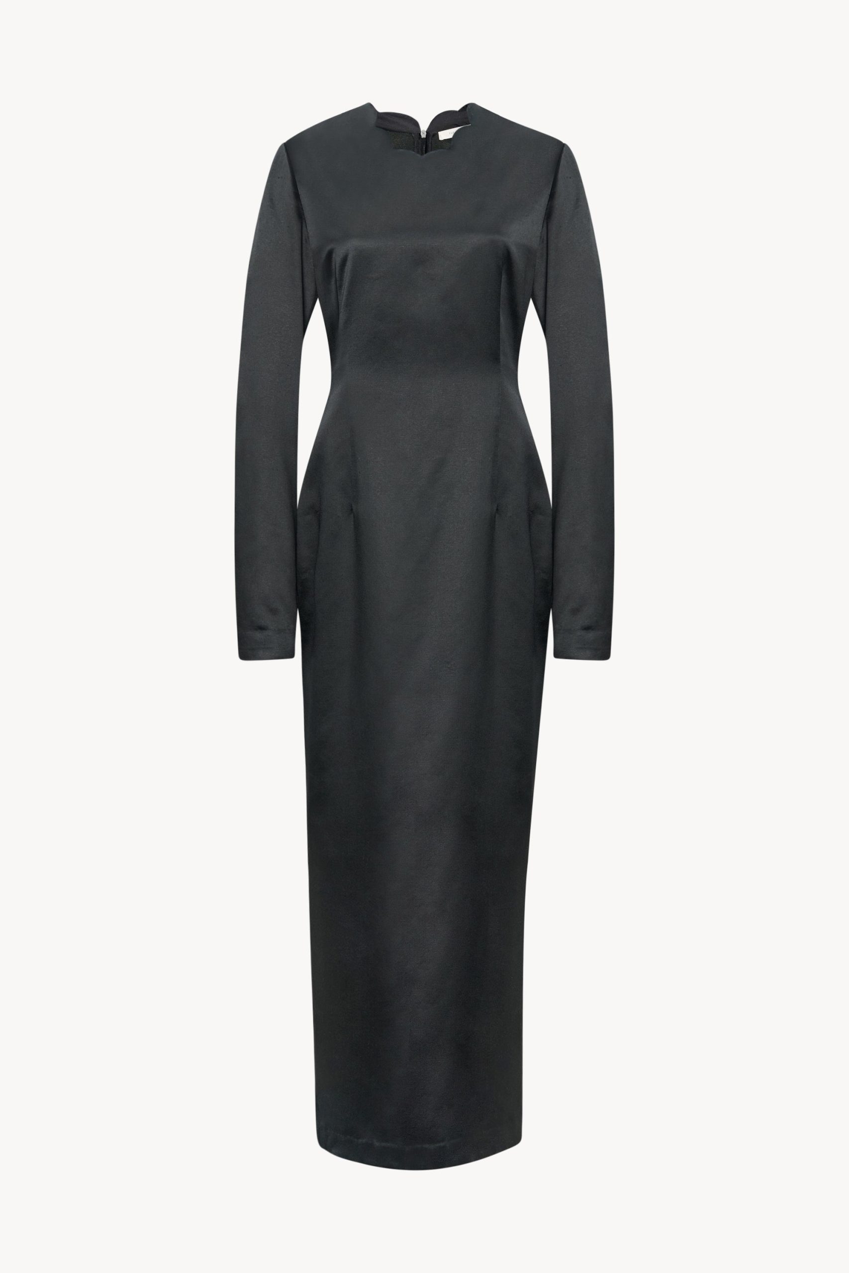 Ankle-length column dress in heavyweight silk satin with scalloped neckline. center back hem vent. and fitted silhouette.