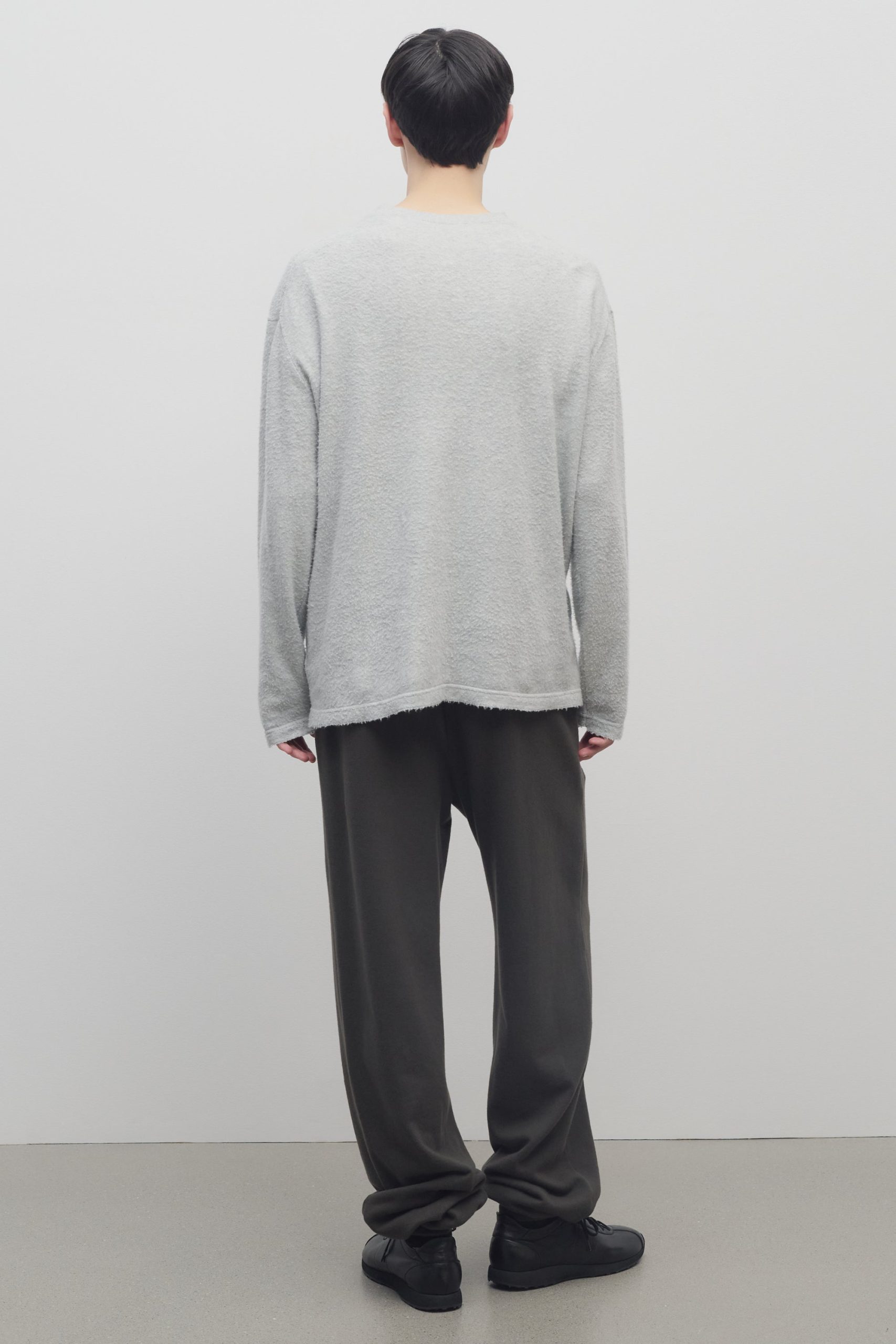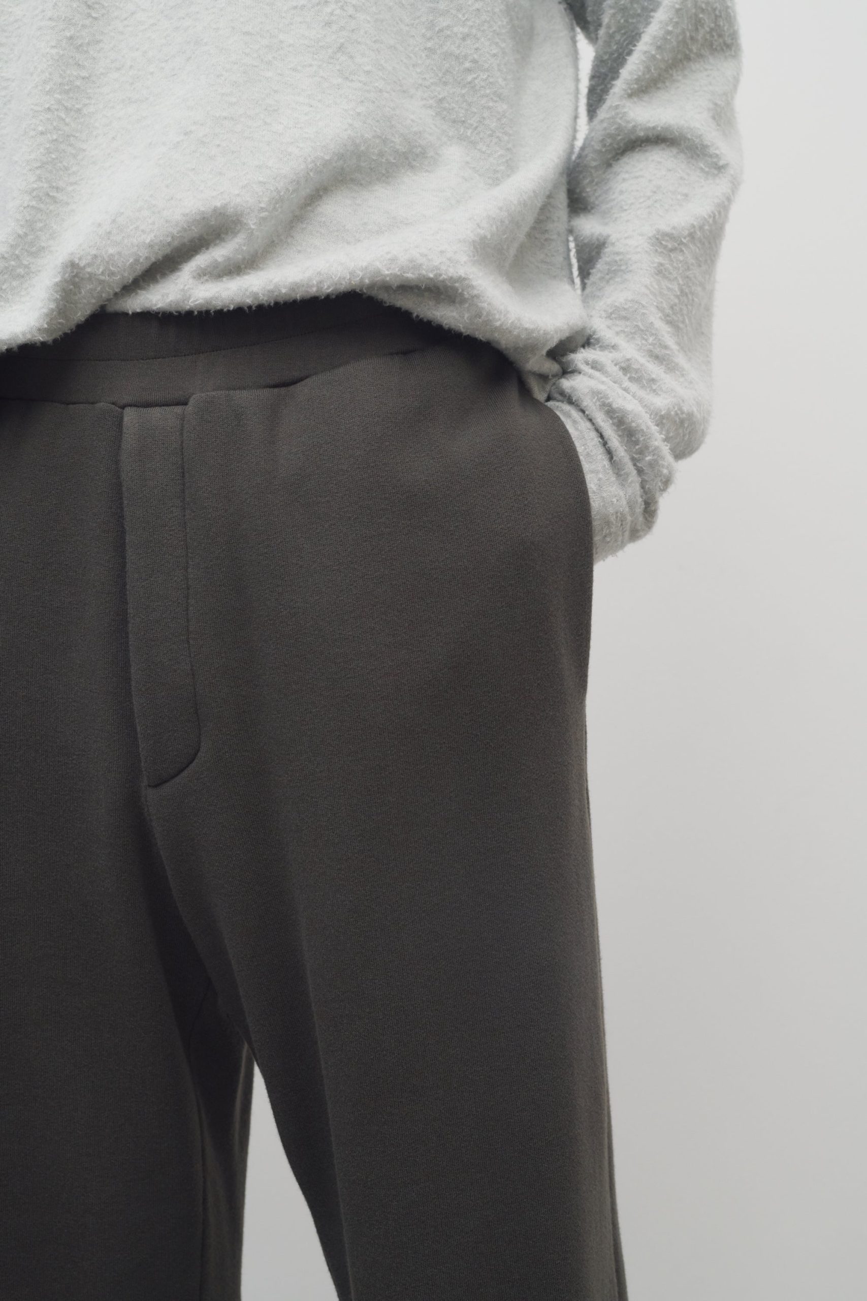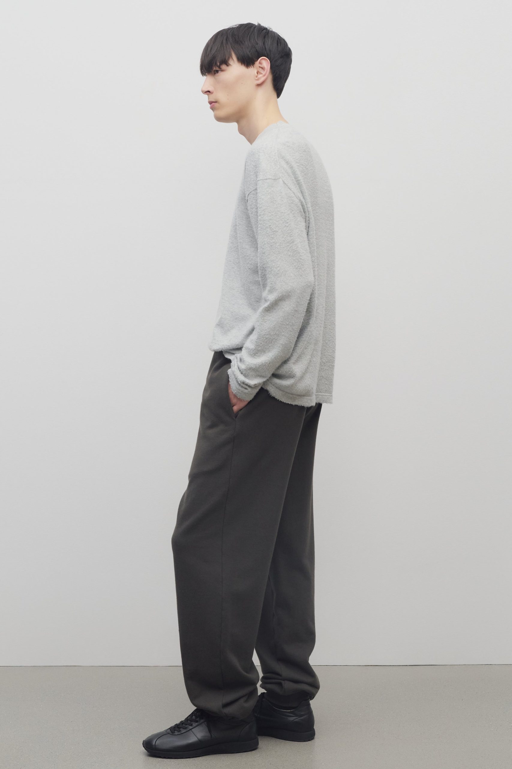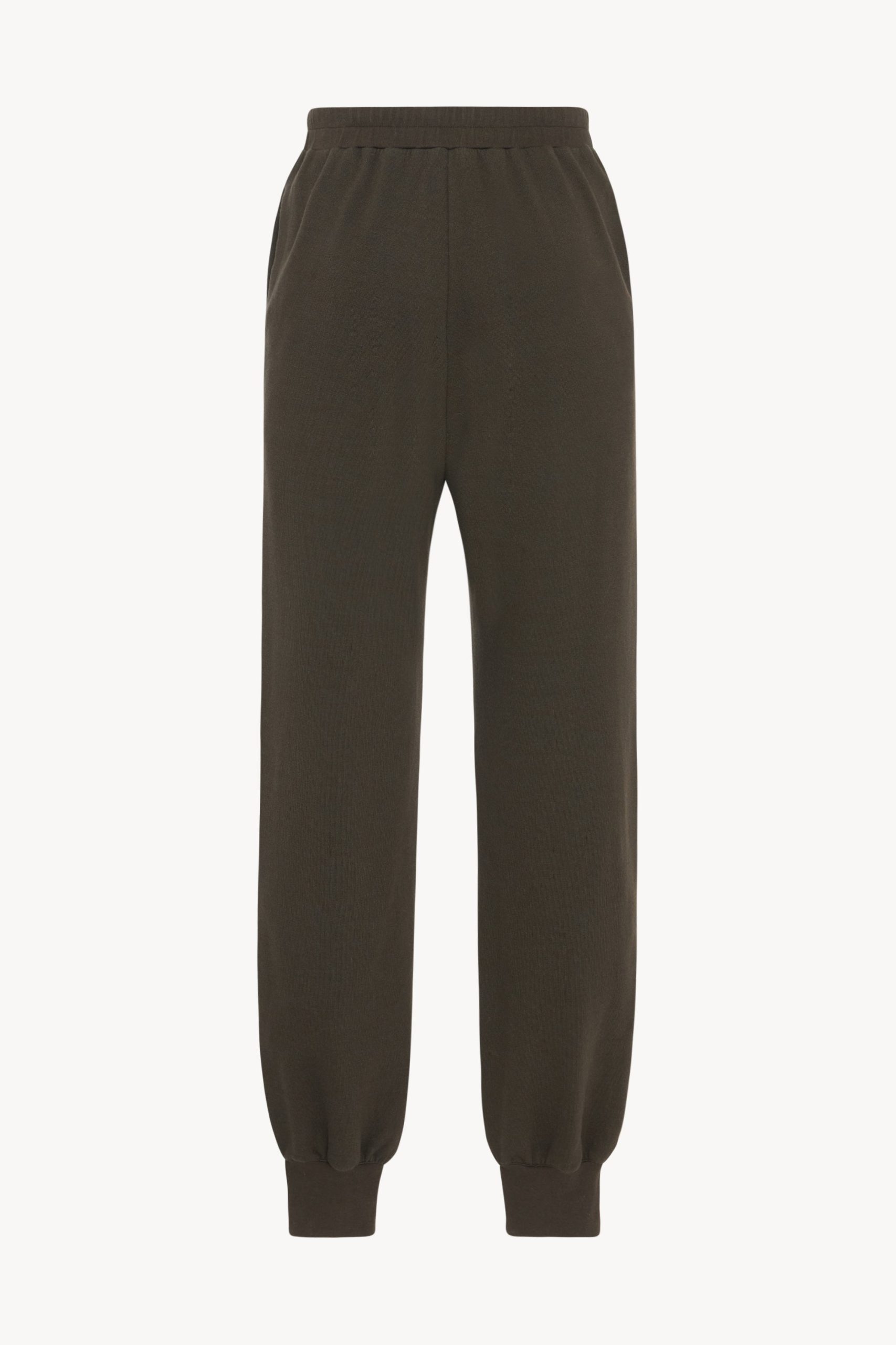 Mid-rise jogger pant in cotton and cashmere French terry with straight leg. side seam pockets. and gathered elastic cuffs and waistband.