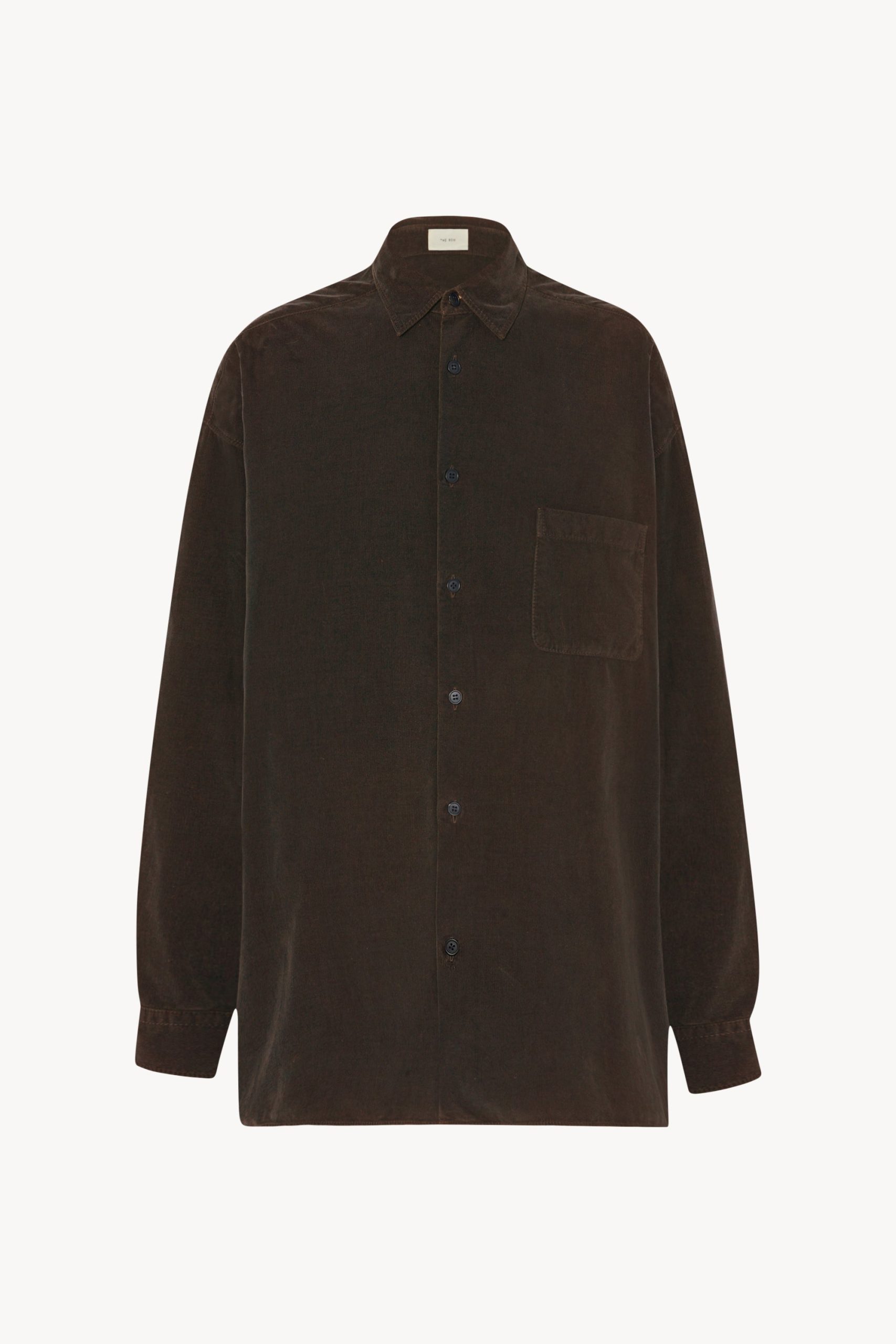 Relaxed button-up shirt in Japanese pinwale corduroy with front patch pocket. slim back yoke with side pleats. and exposed front placket with mother-of-pearl buttons.