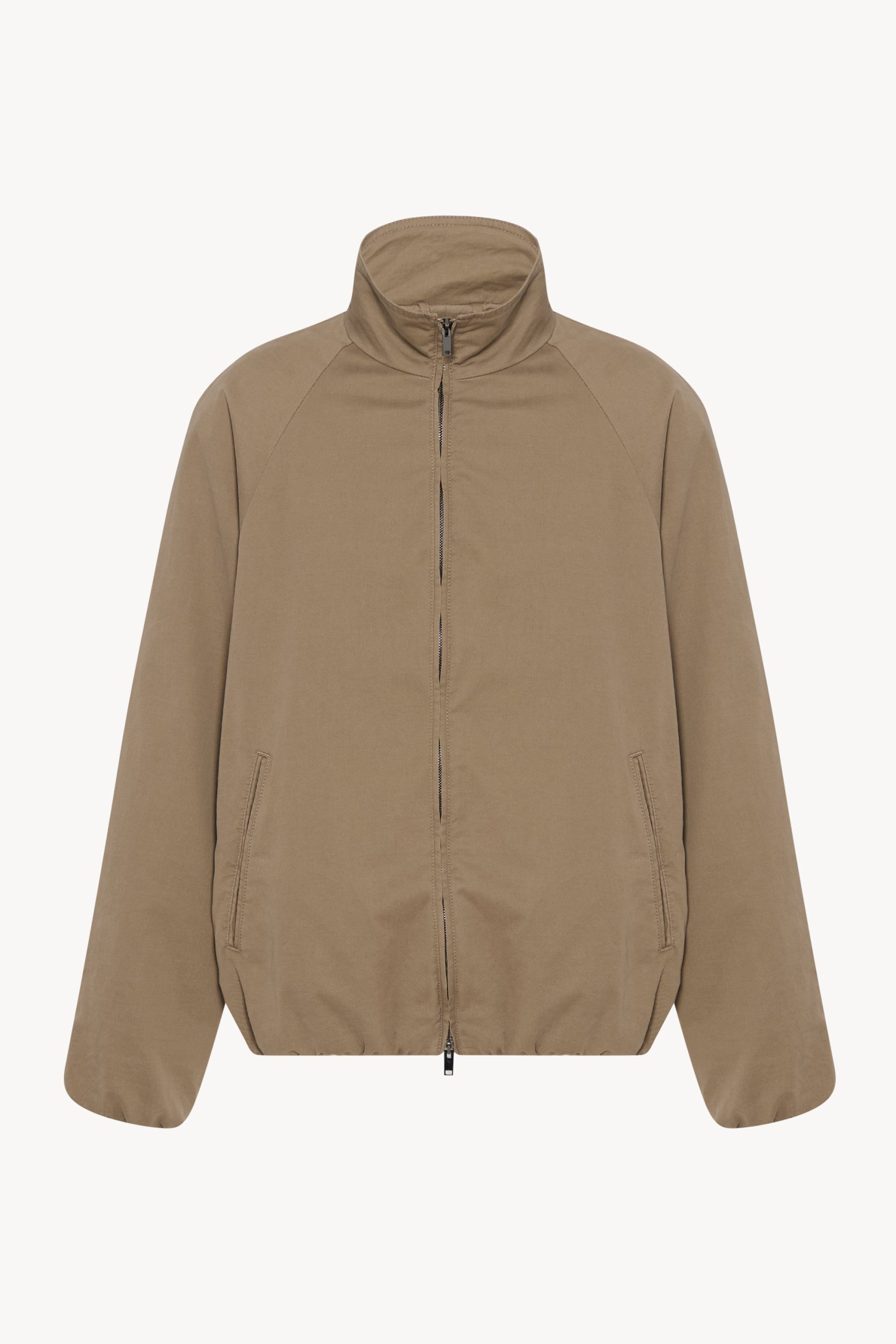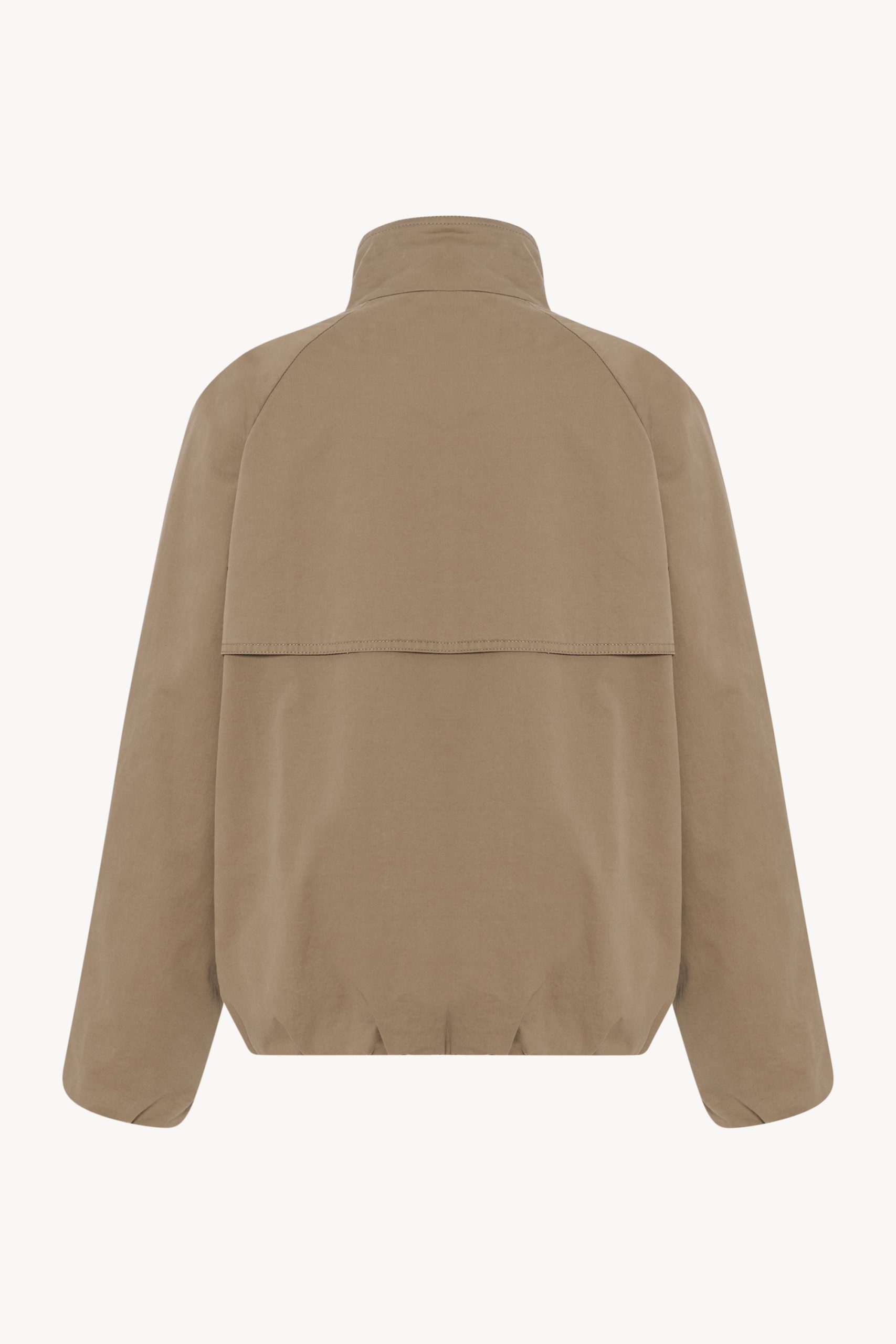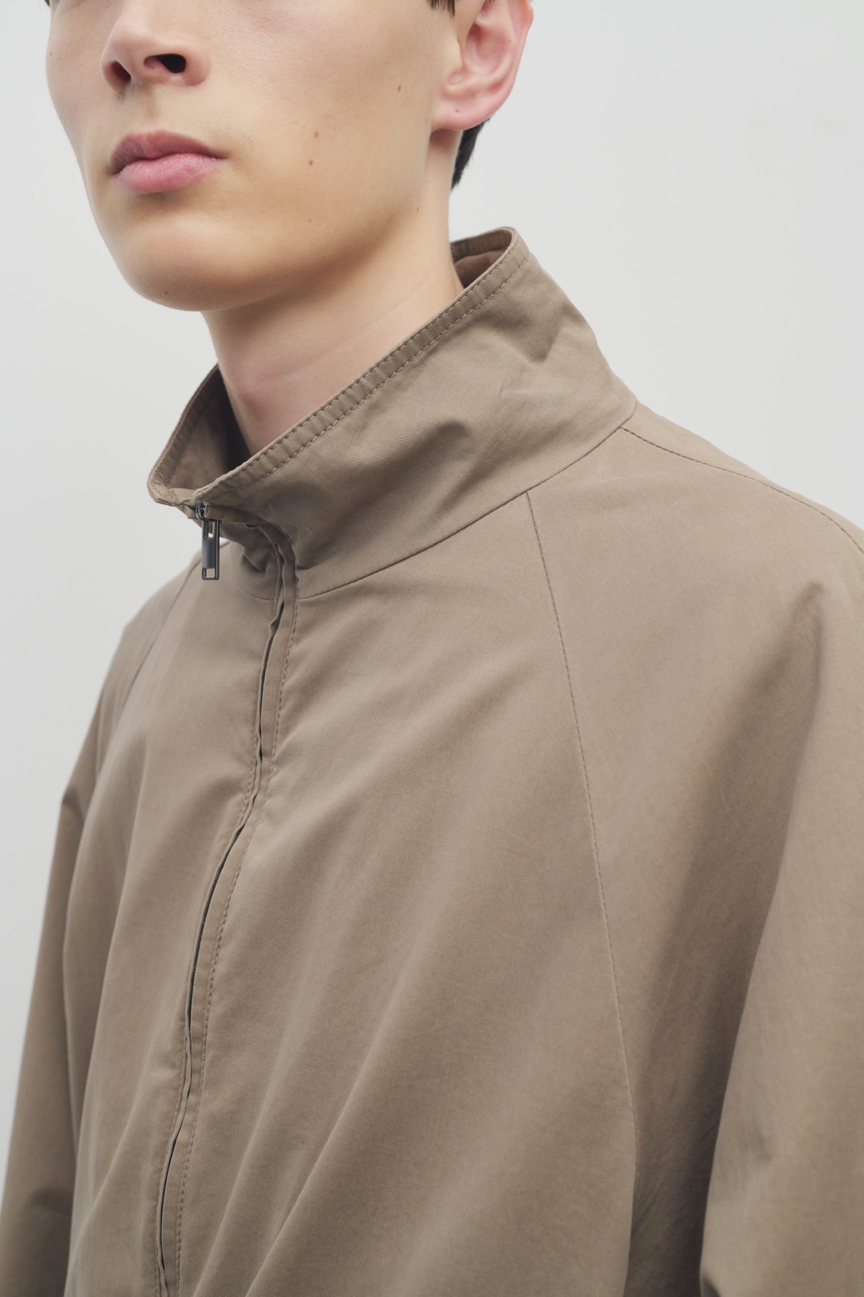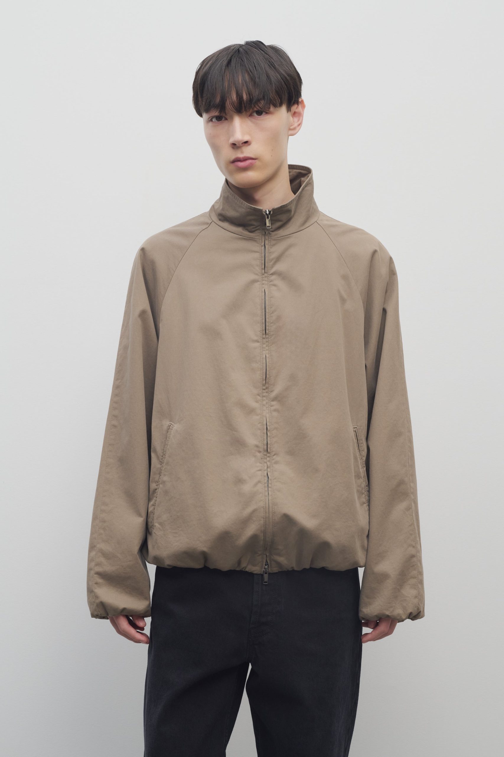 Lightweight bomber jacket in soft cotton and cashmere gabardine with back storm flap. elasticated cuffs and hem. and two-way front zip closure.