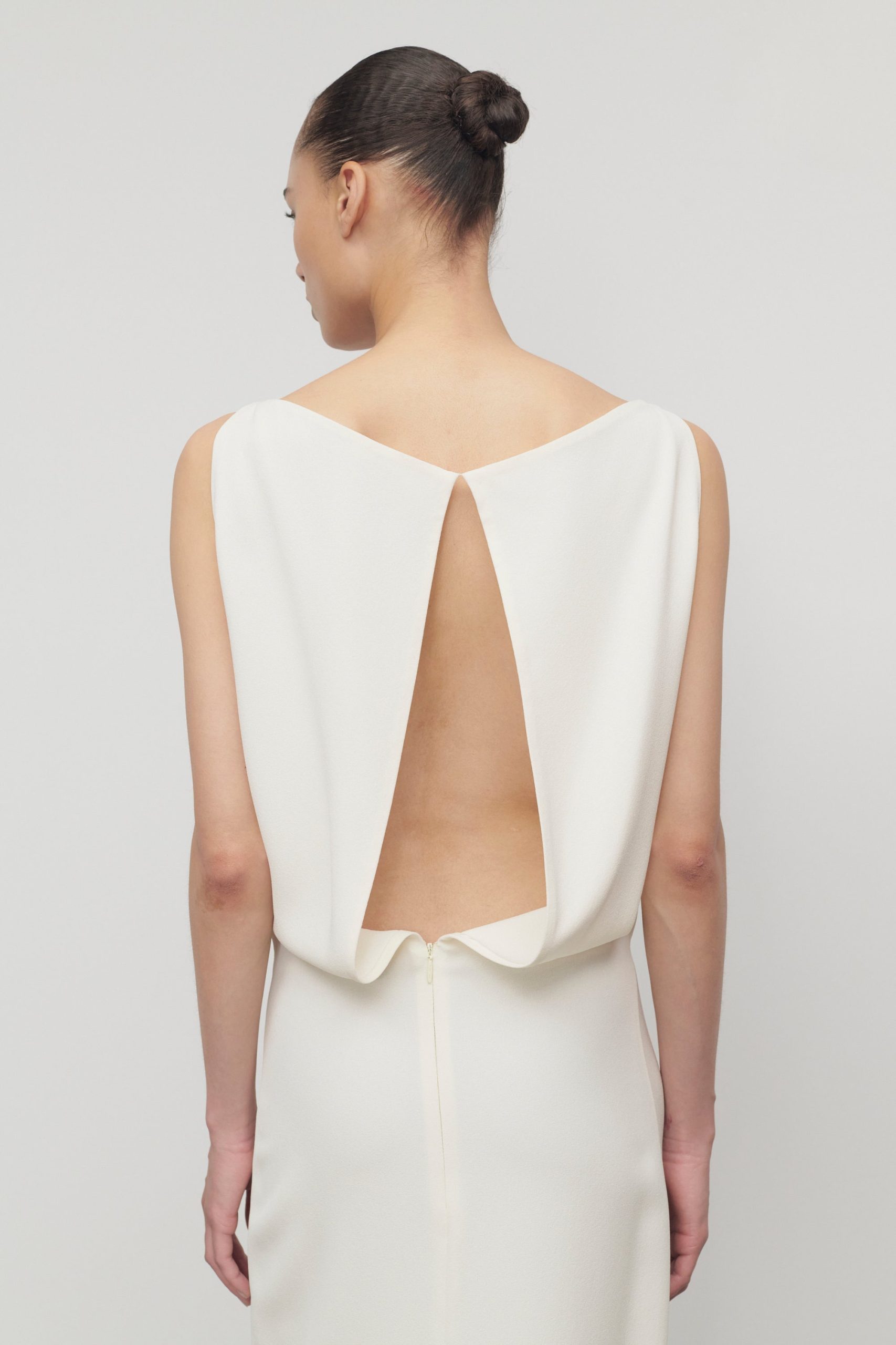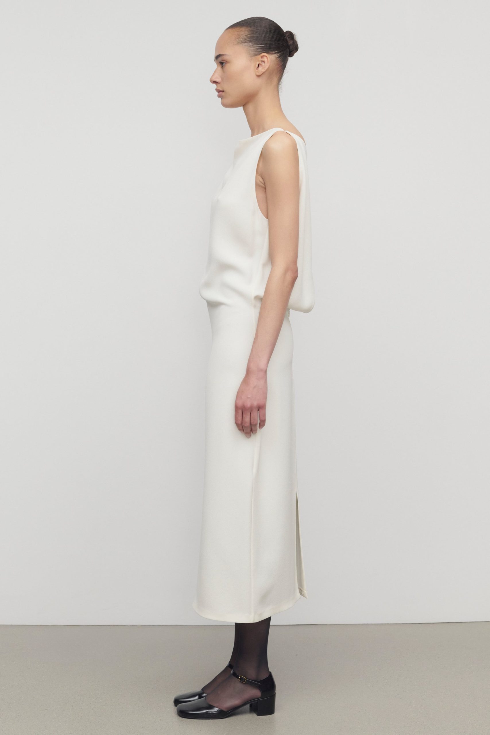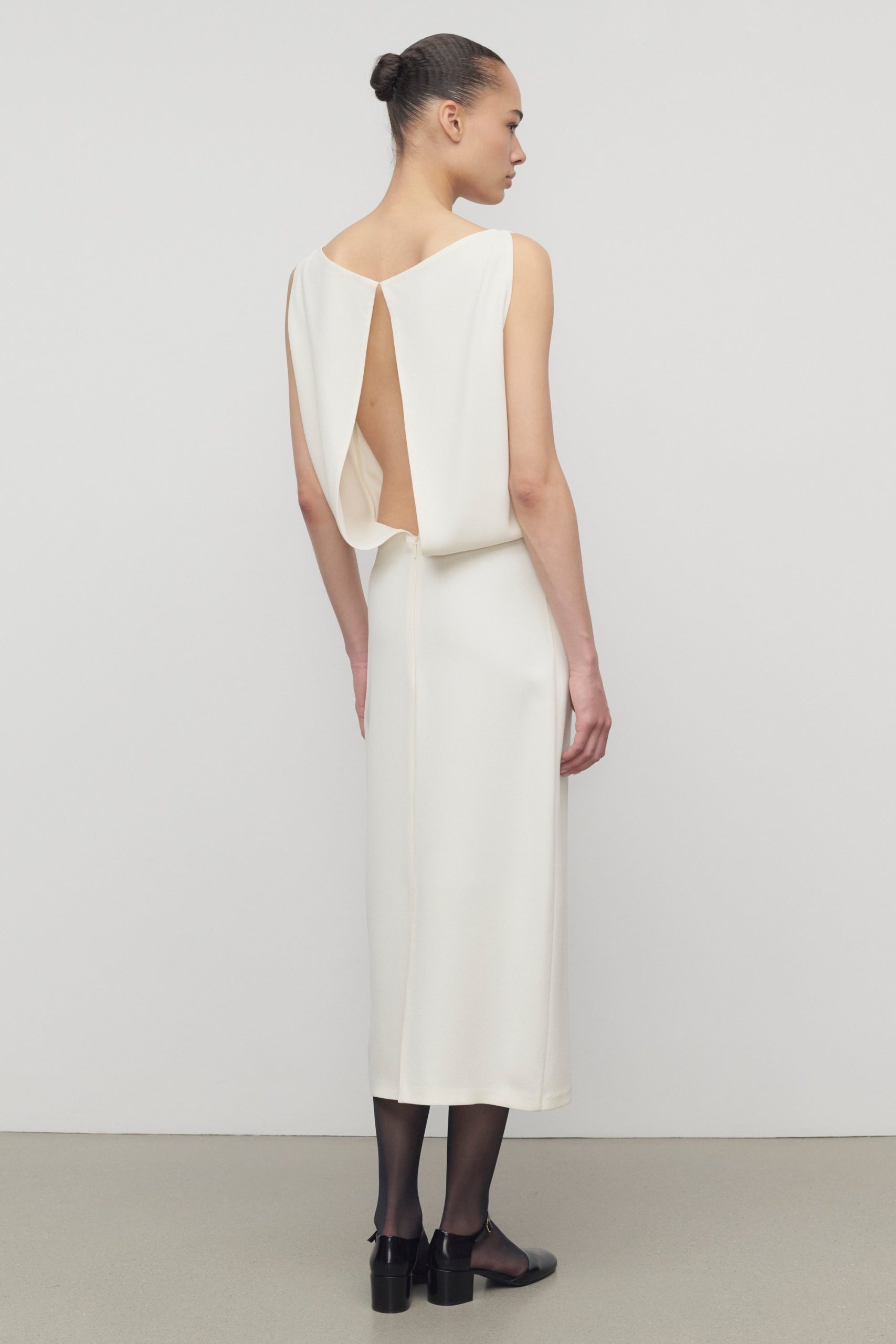Calf-length column dress in smooth heavyweight silk with open back slit. center back hem vent. and concealed back zip closure with hook & eye at neckline.