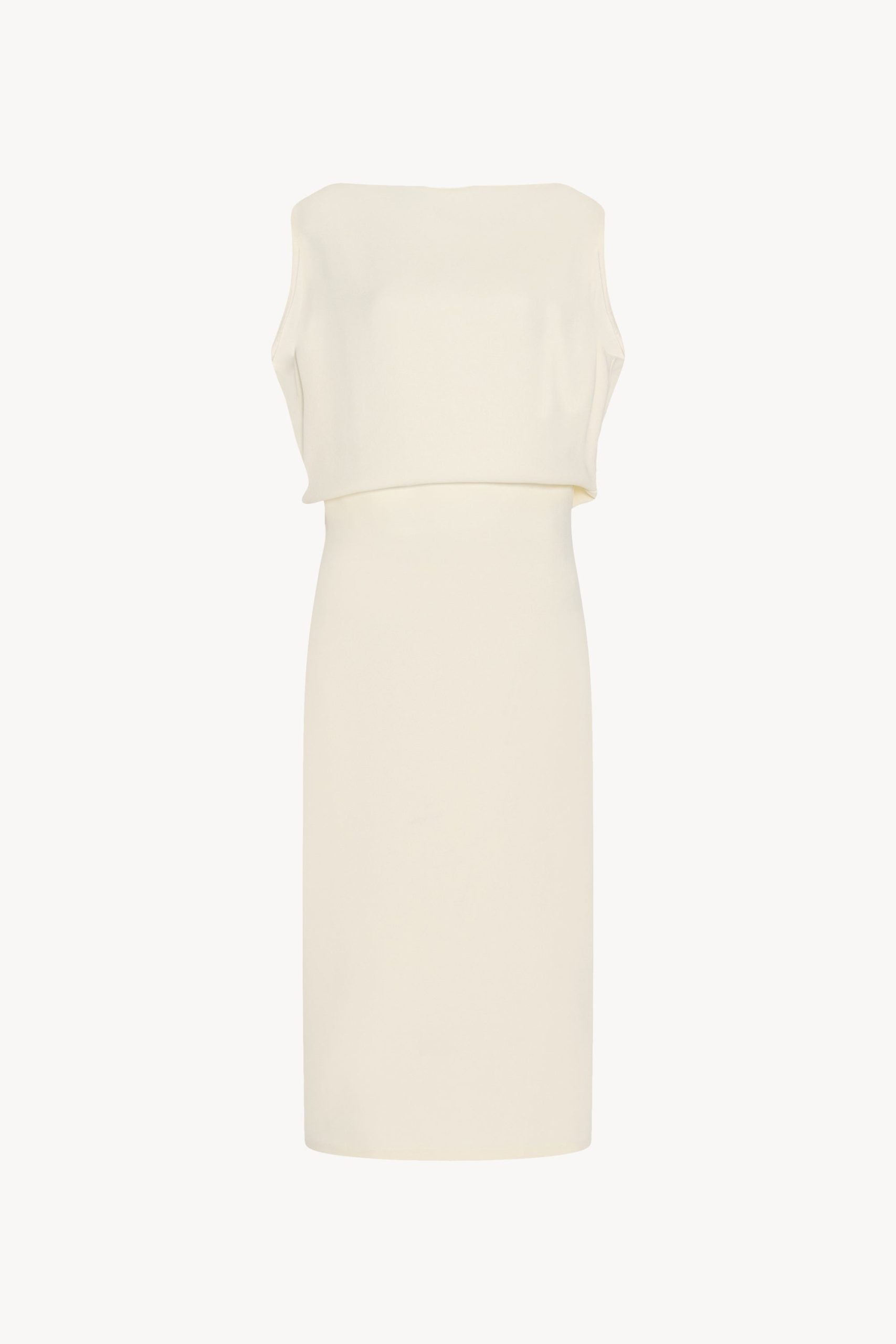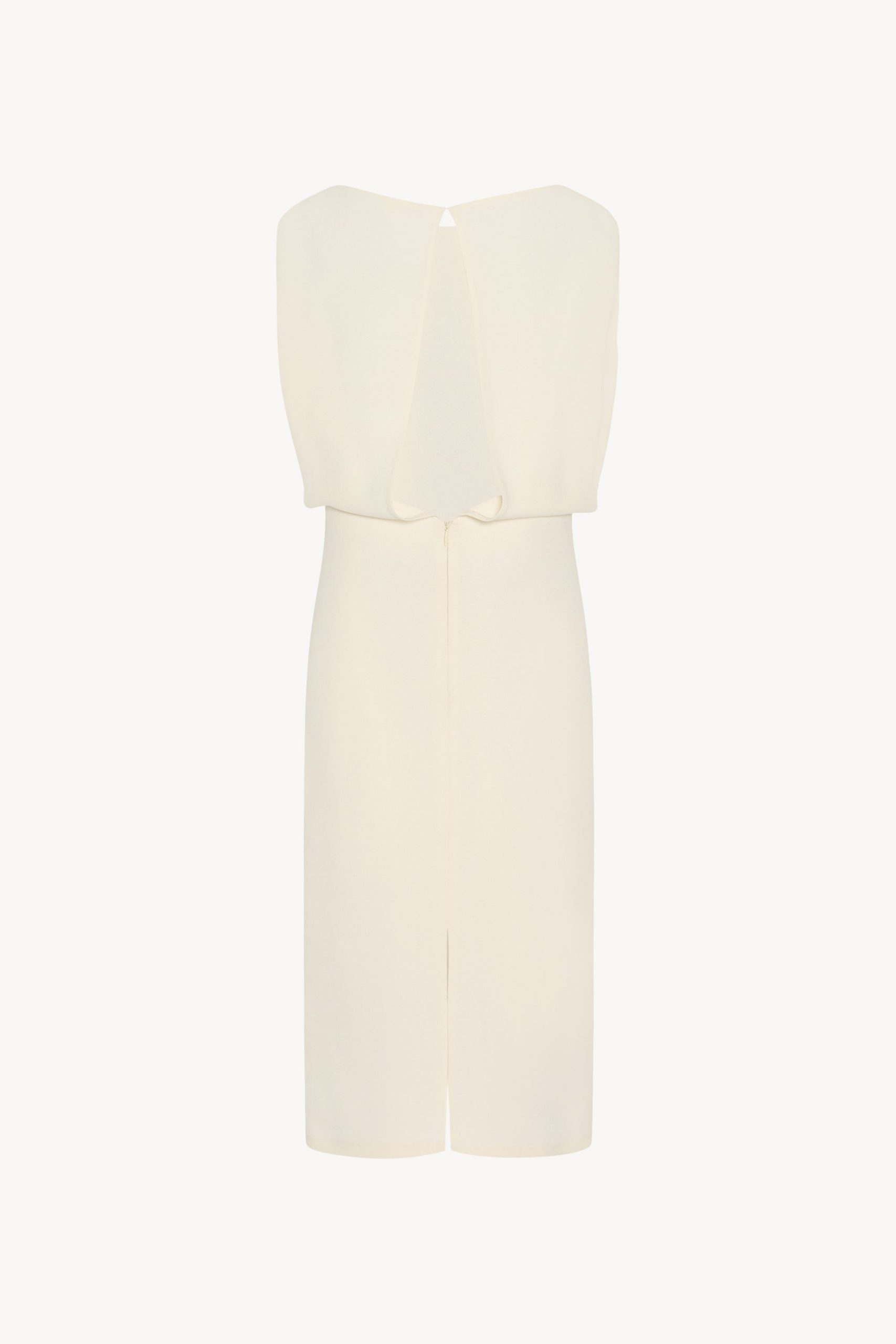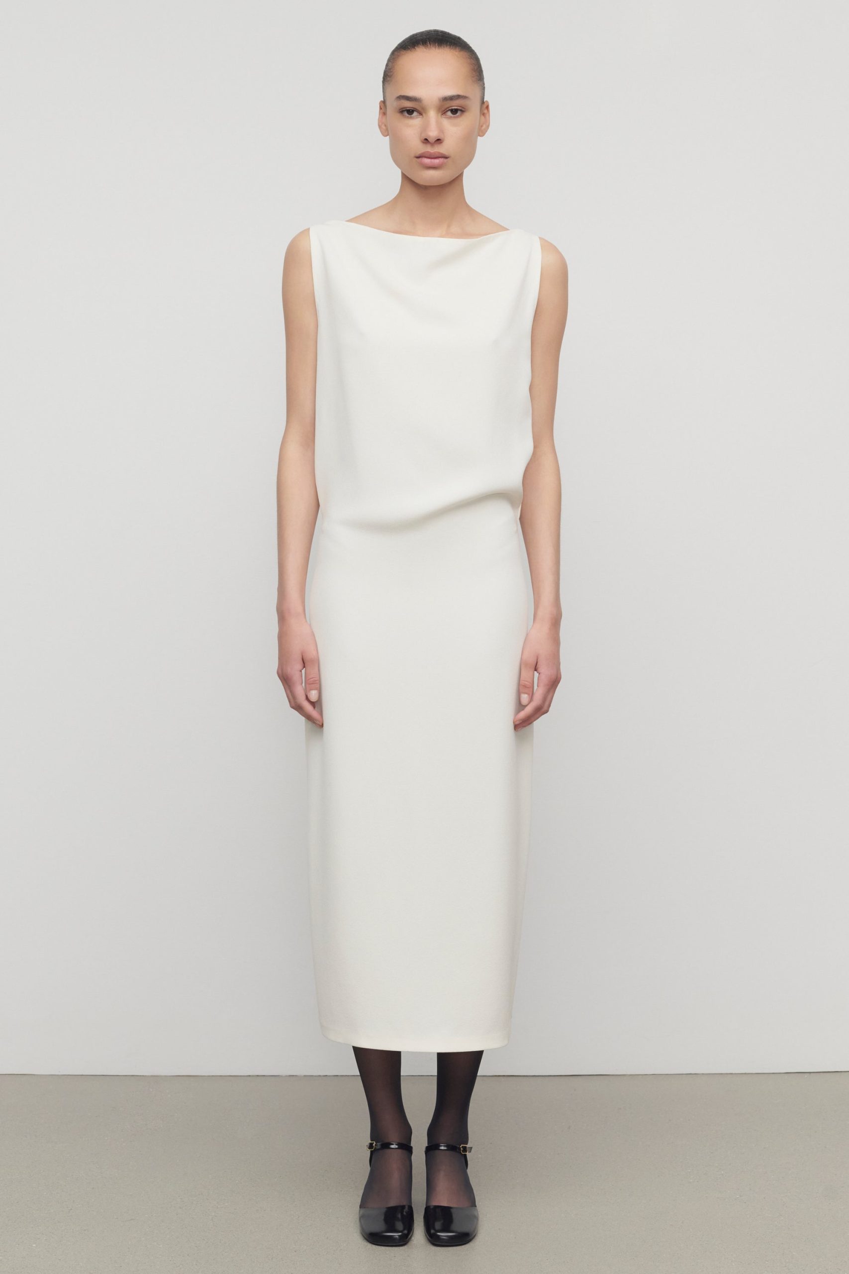 Calf-length column dress in smooth heavyweight silk with open back slit. center back hem vent. and concealed back zip closure with hook & eye at neckline.