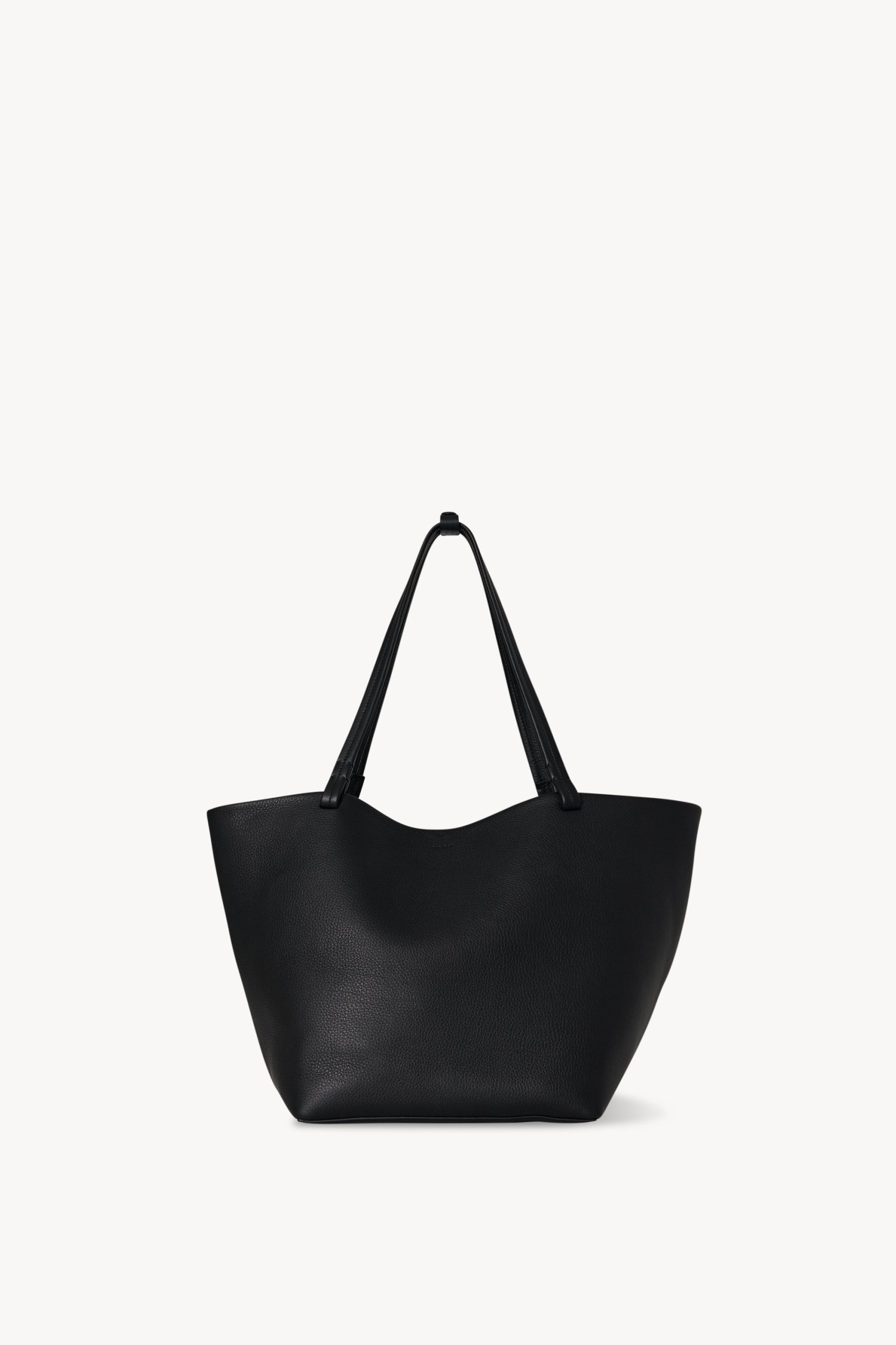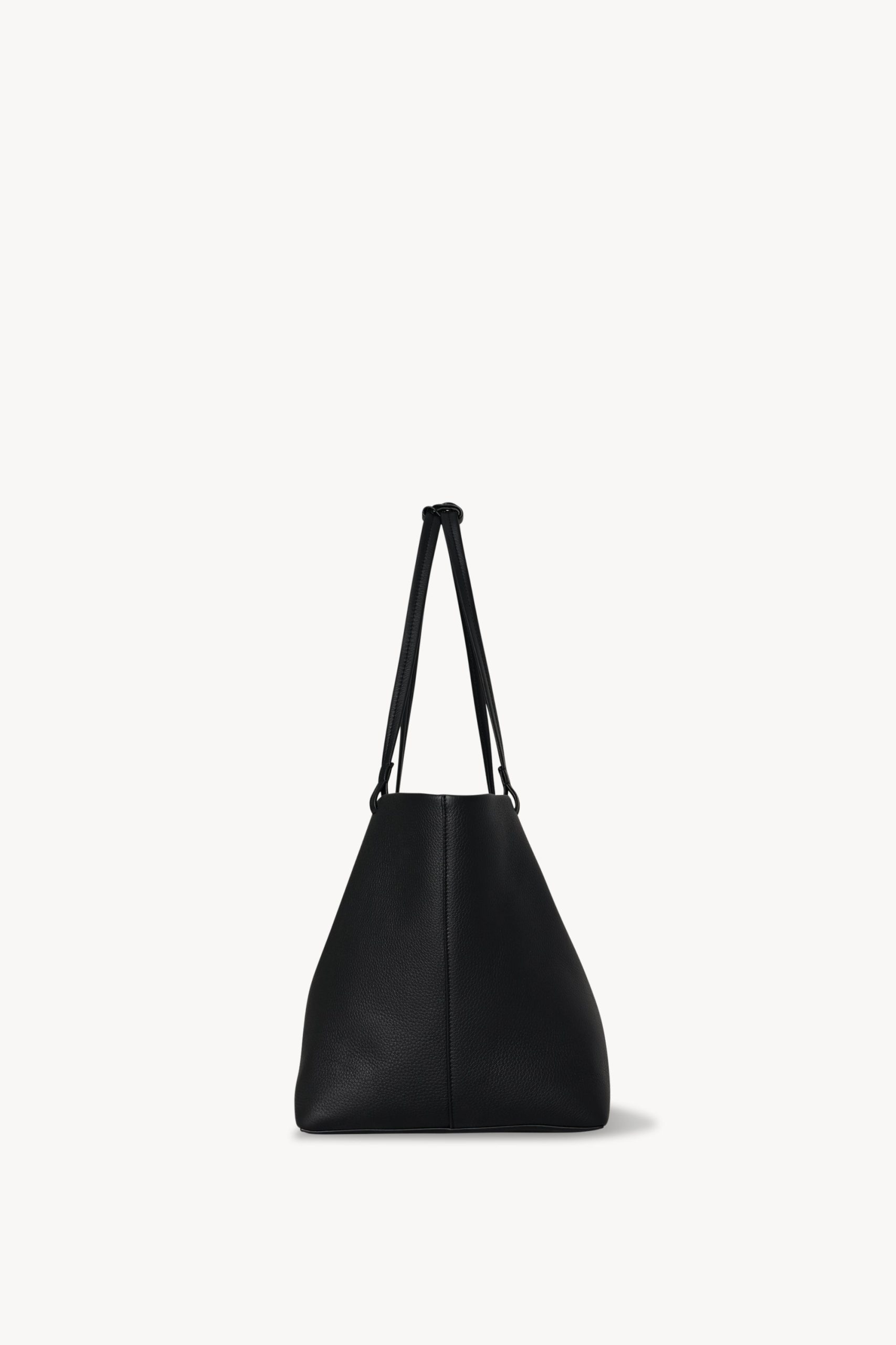 Classic tote bag in grained calfskin leather with interior toggle closure. flat handles. and interior wristlet with adjustable strap.