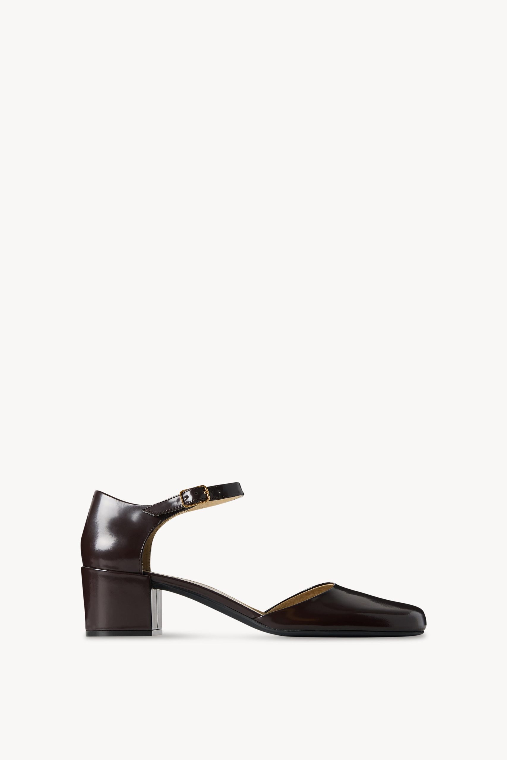 Low-heeled shoe in glossy patent leather with square toe. adjustable buckled ankle strap. and rubber sole.