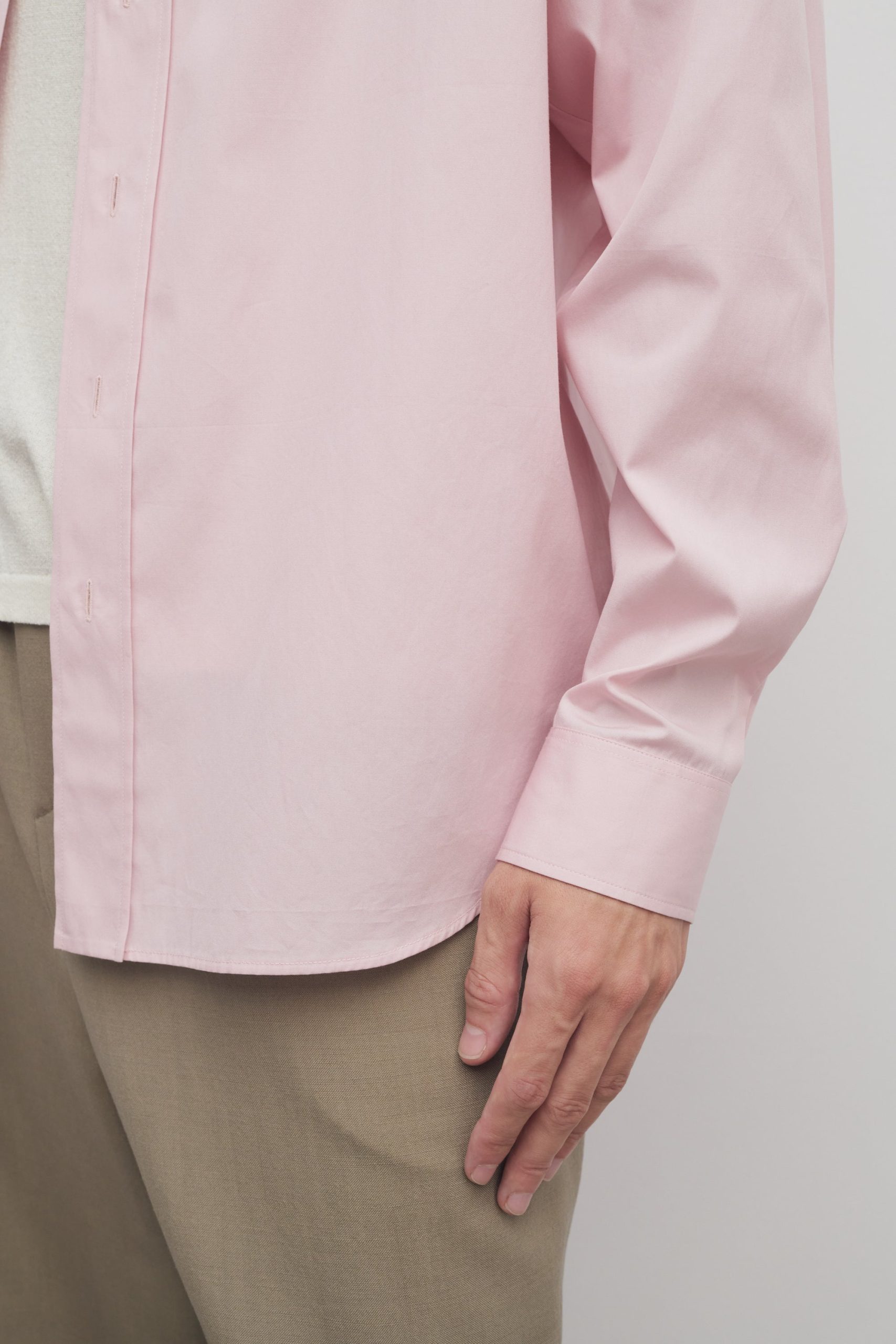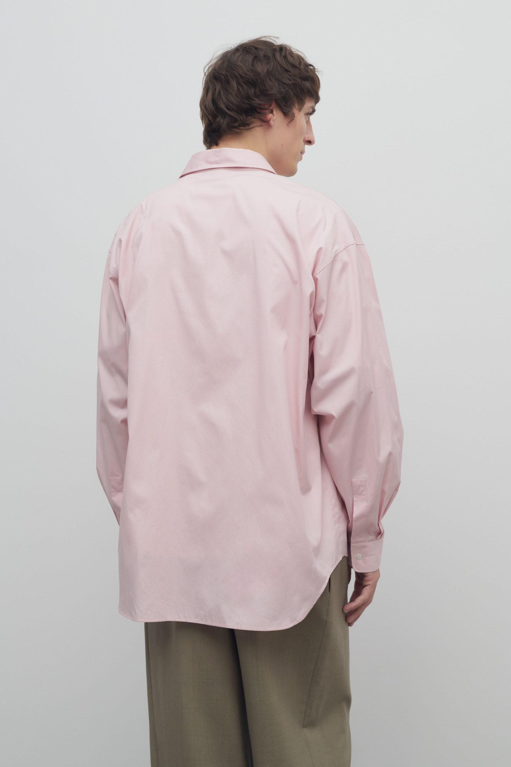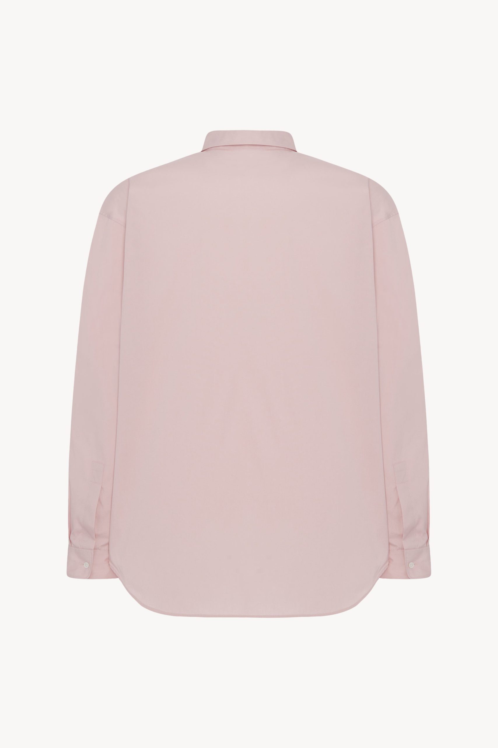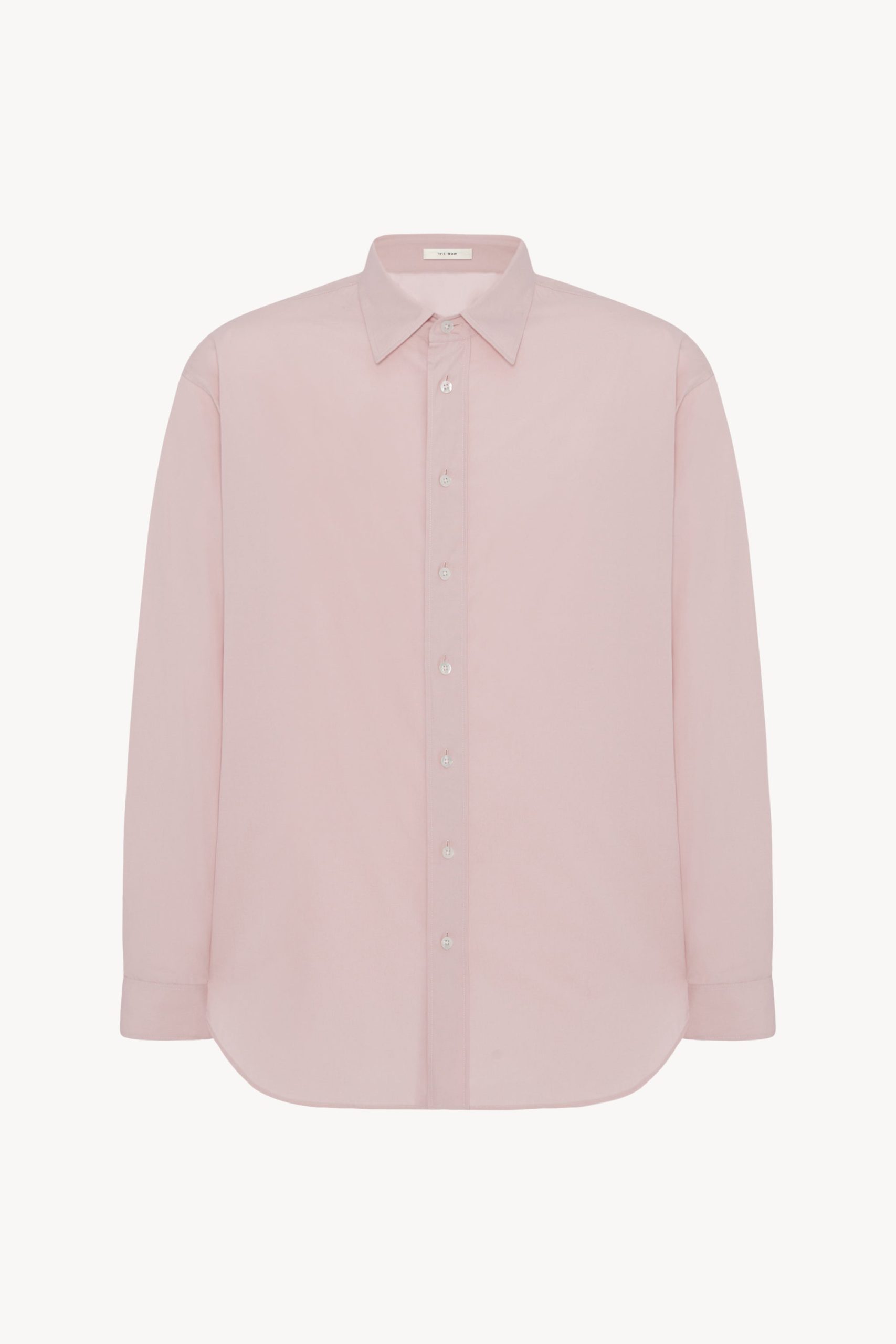 Minimal button-up shirt in classic cotton poplin with relaxed fit. curved hem. and exposed front placket with mother-of-pearl buttons.
