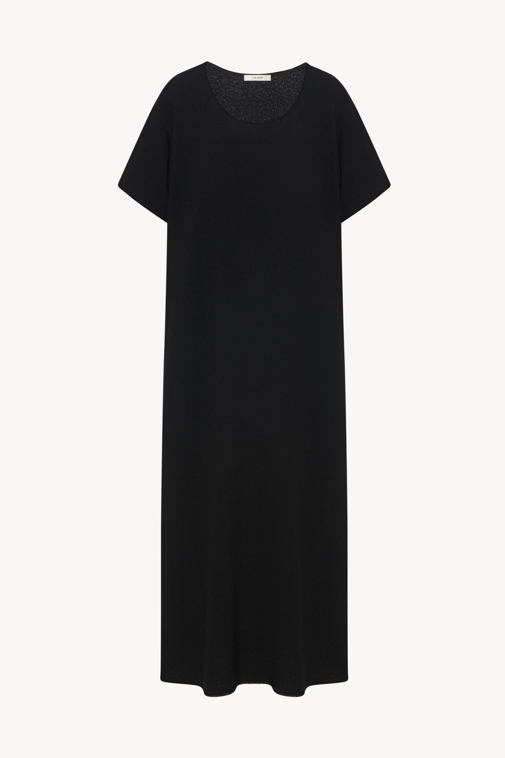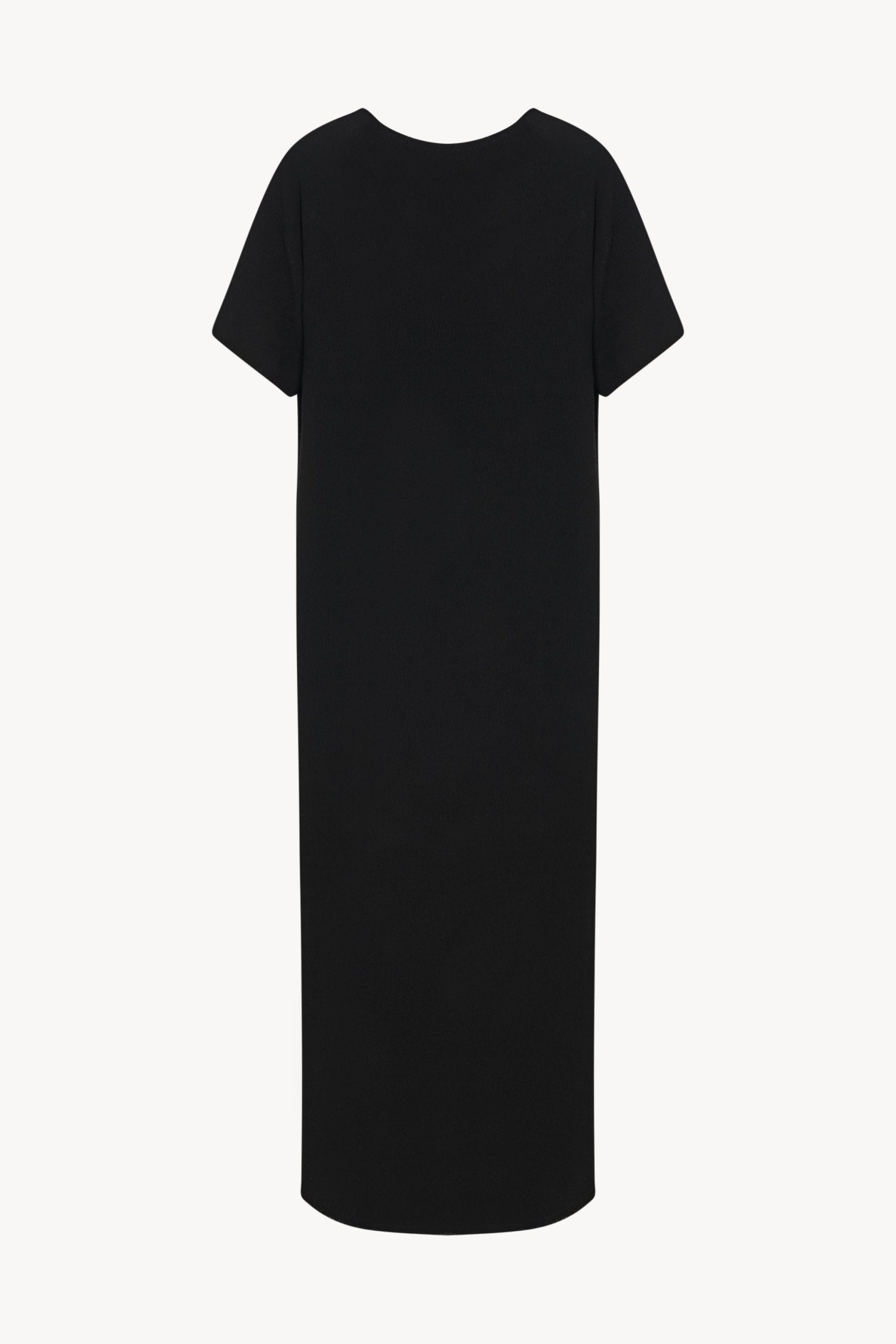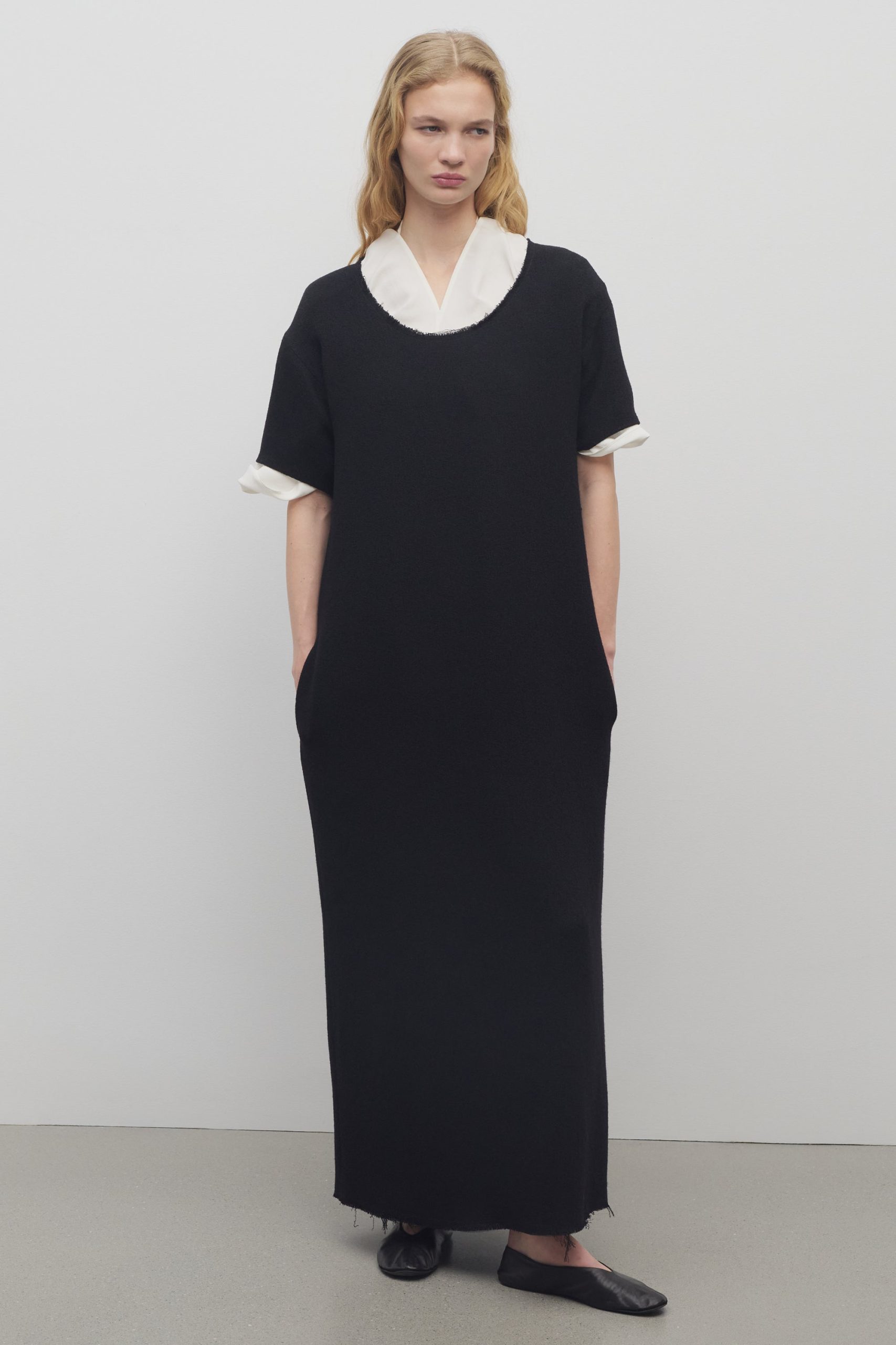 Ankle-length shift dress in textured matte wool crepe with raw finish and relaxed fit.