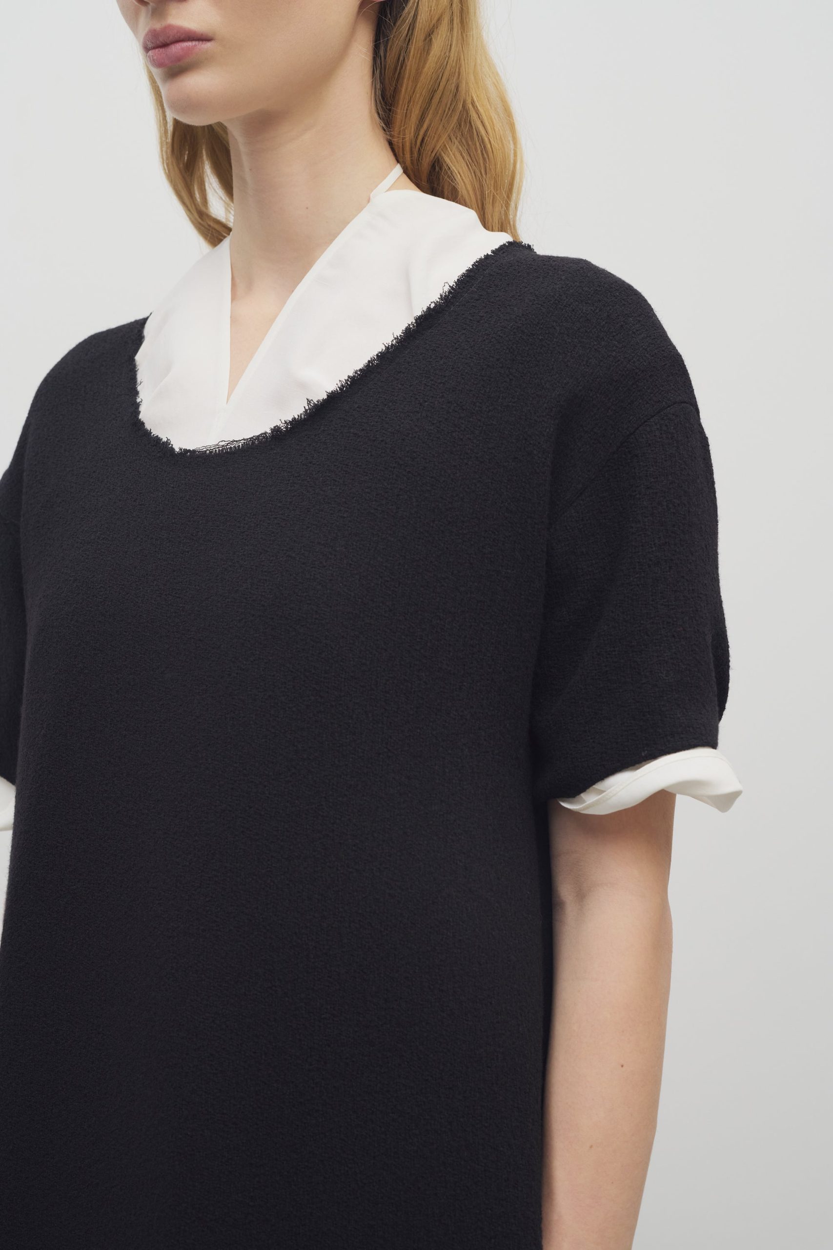 Model is wearing this garment layered over our ‘Mia’ Dress. creating a decolleté collar effect while subtly exposing the sleeve cuffs for added contrast.