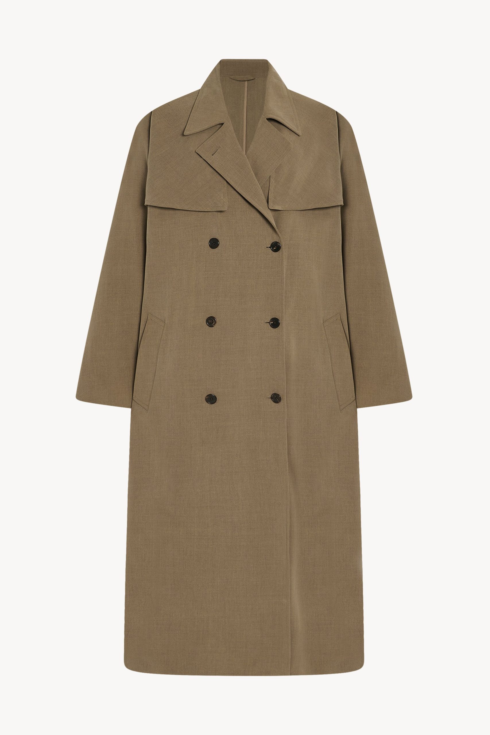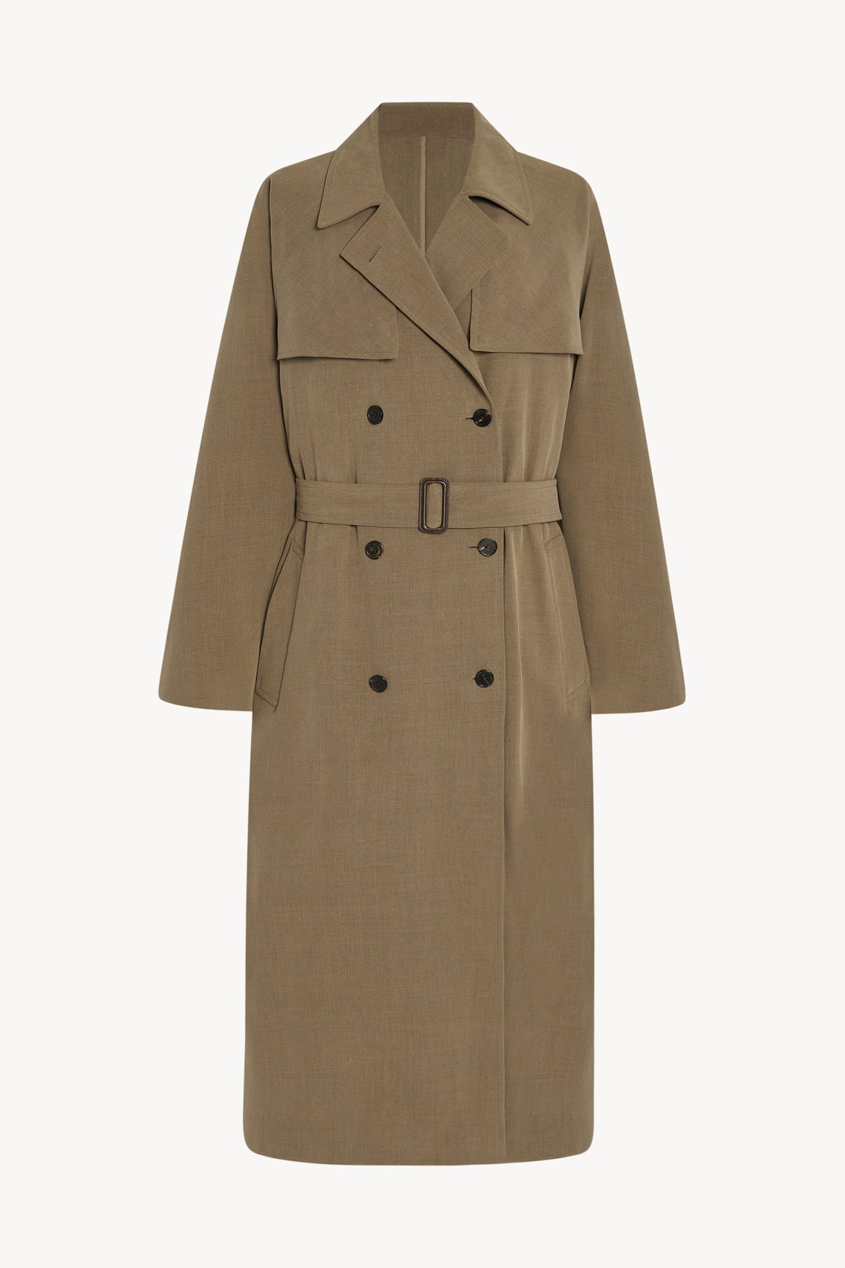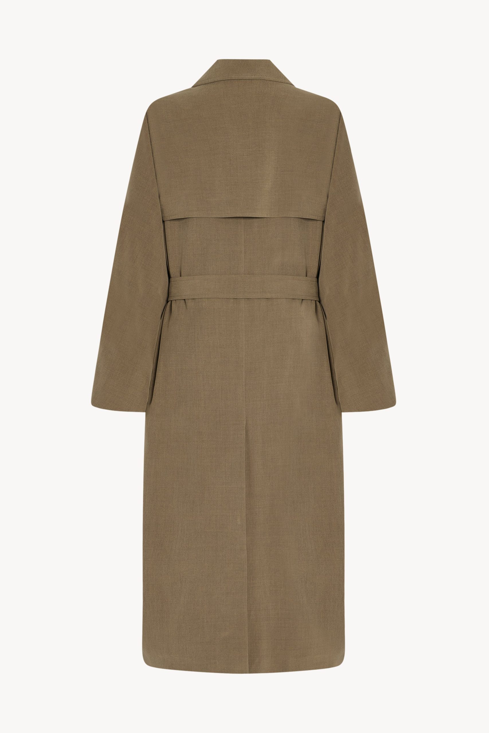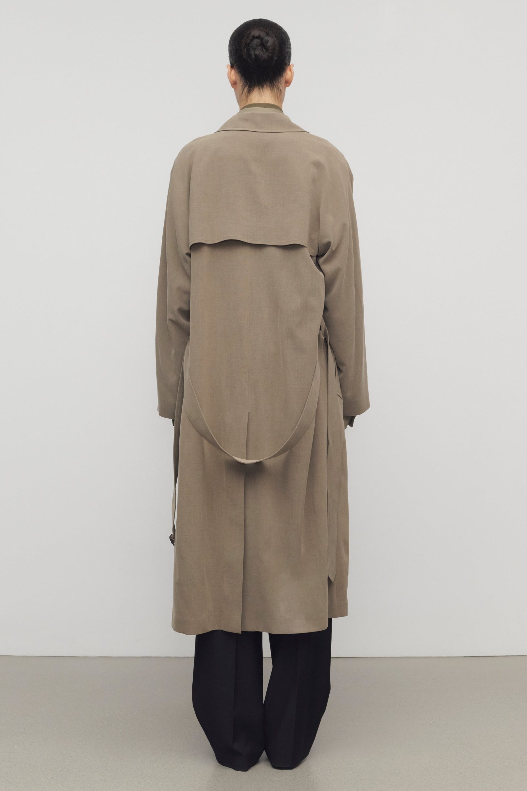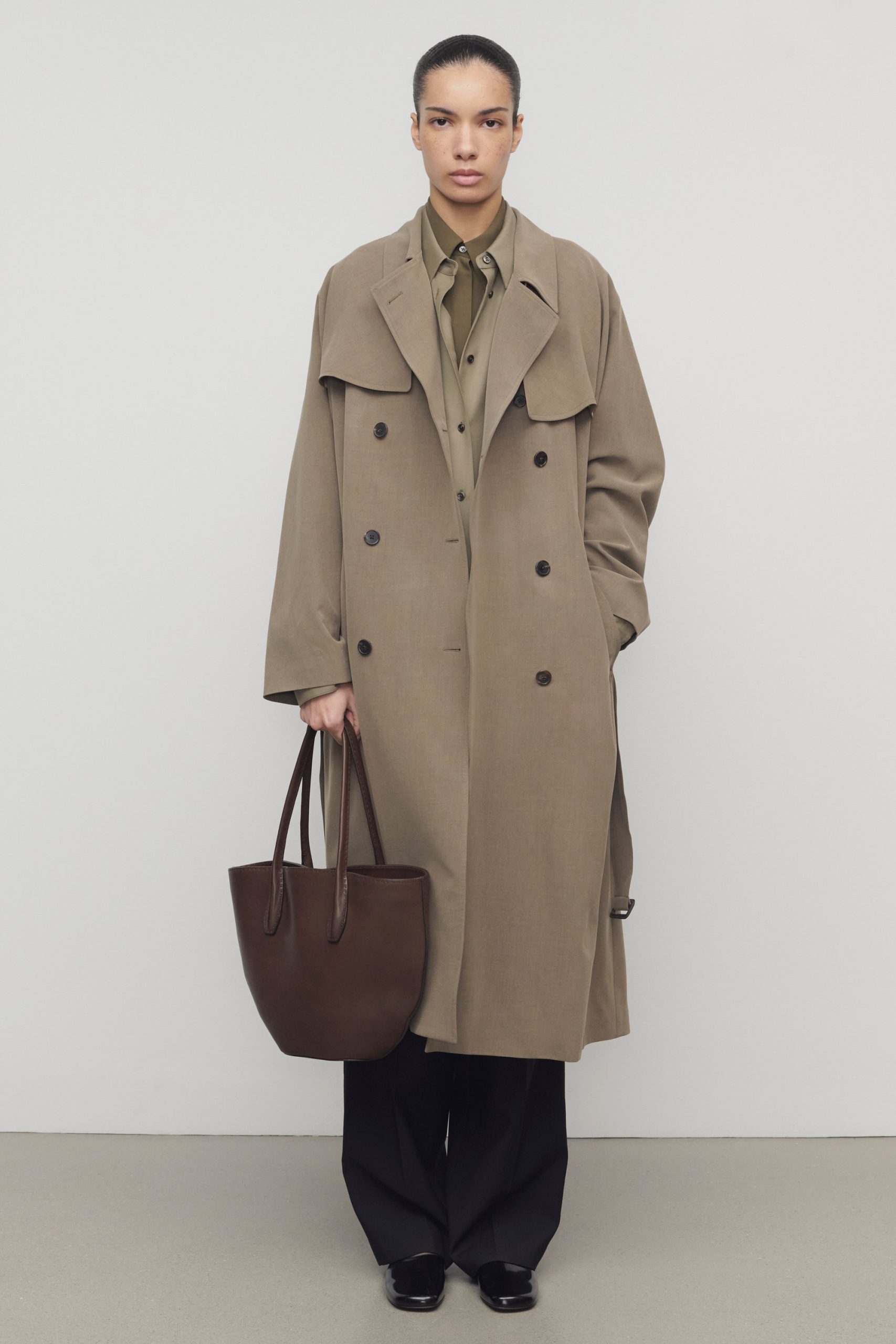 Oversized double-breasted trench coat in refined silk and wool suiting with slant welt pockets. horn button closure. and removable buckle belt.