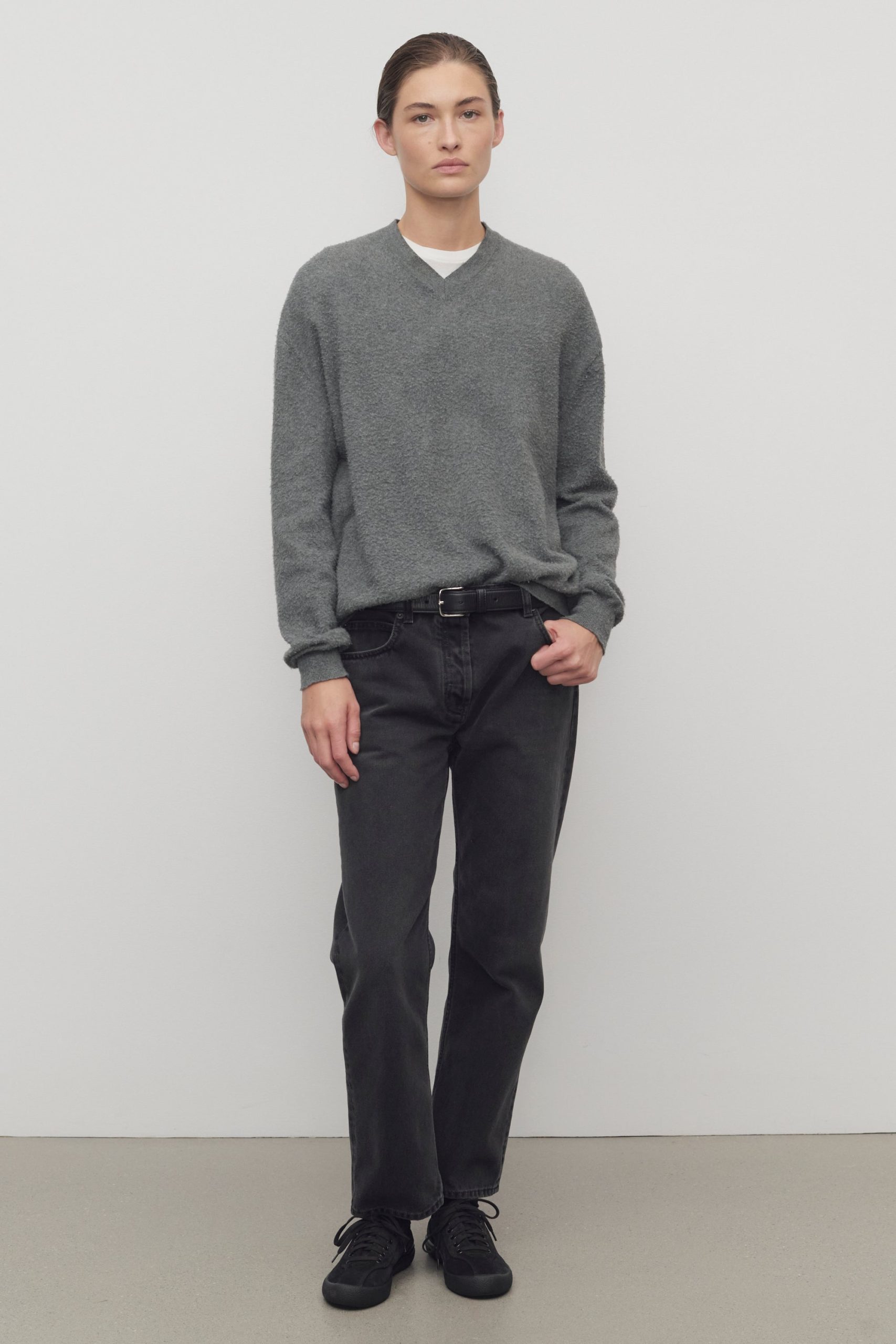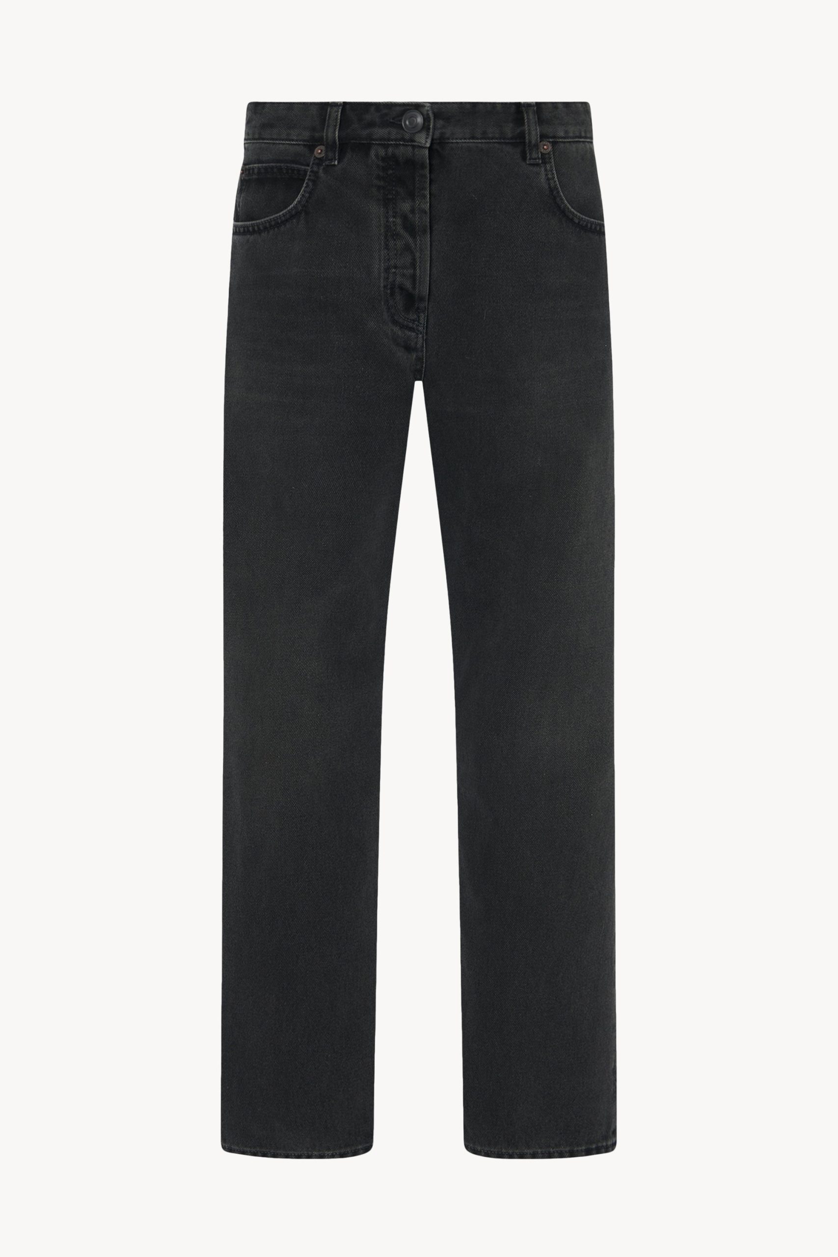 Mid-rise jean in in gently faded cotton denim with slim leg. tonal topstitching. and classic 5-pocket construction.