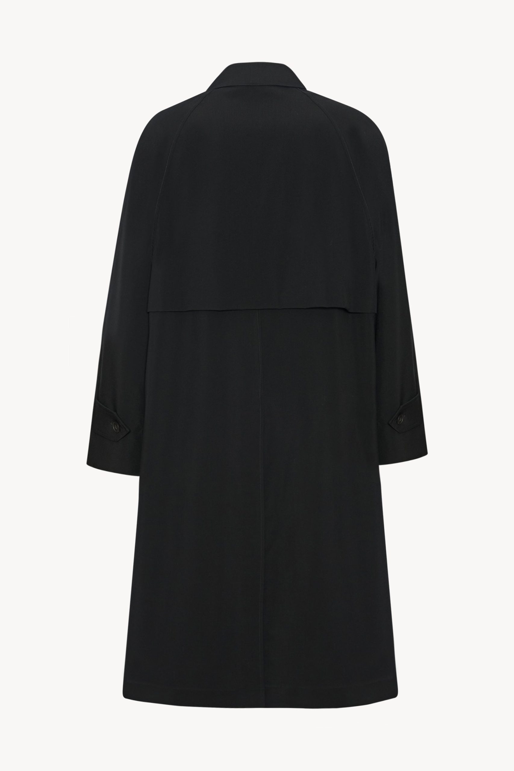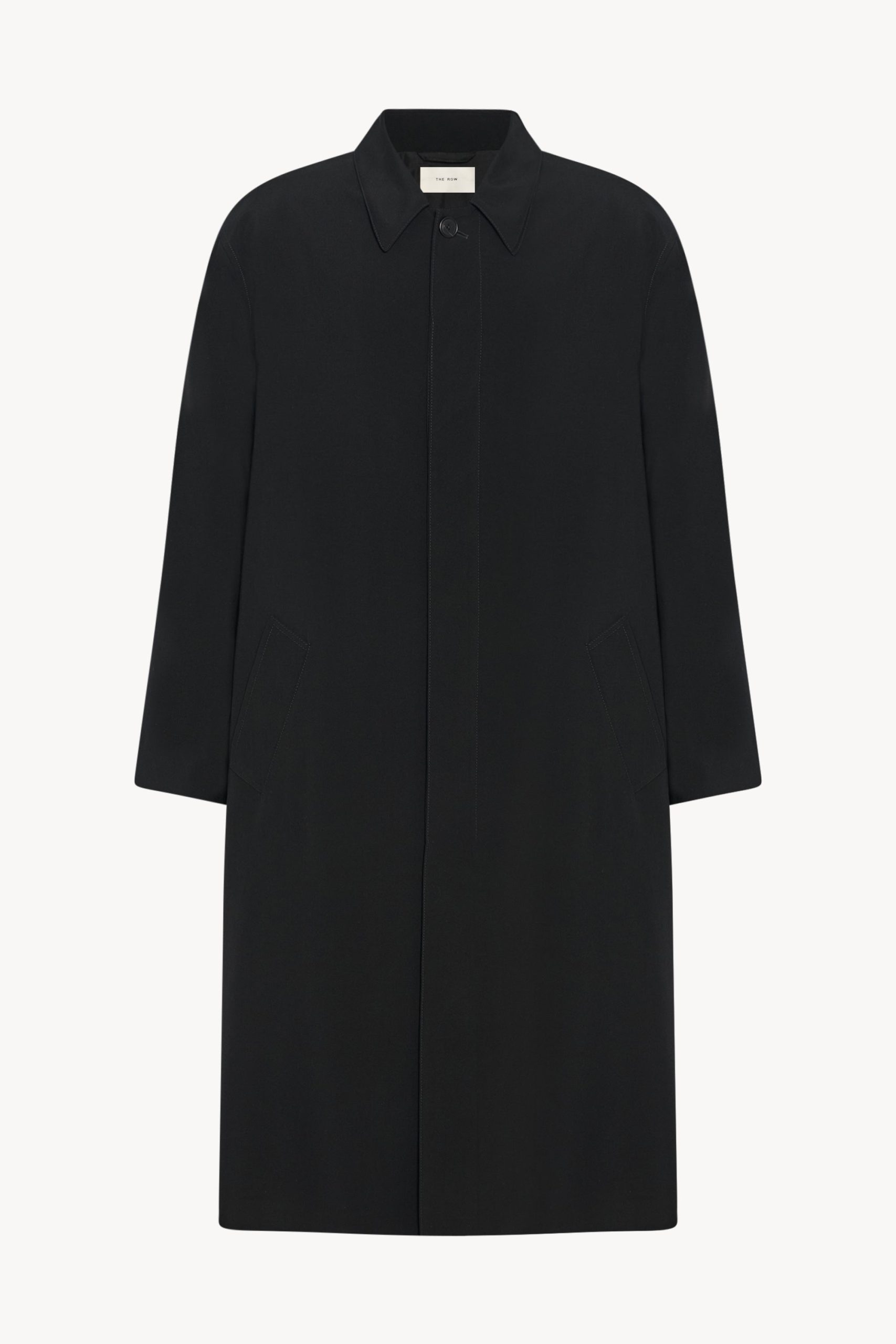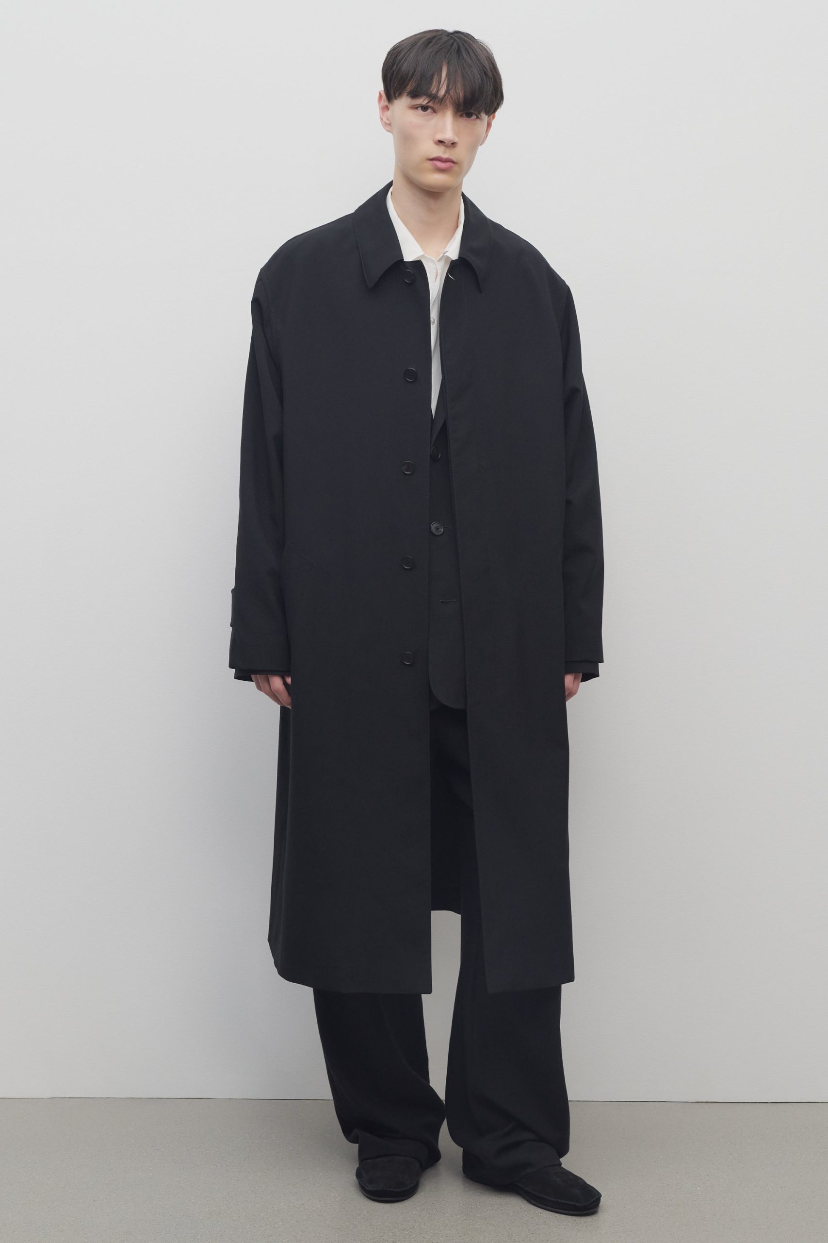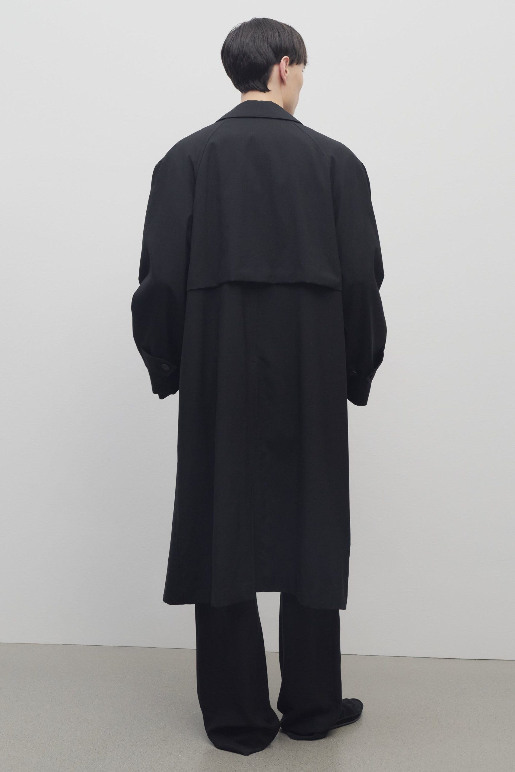 Single-breasted trench coat in crisp tropical wool with back storm flap. front welt pockets. and concealed front placket with horn button closure.