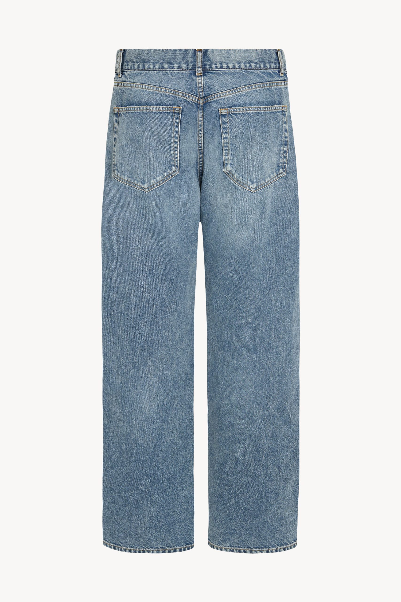 Mid-rise jean in gently faded cotton denim with straight leg. contrast topstitching. and classic 5-pocket construction.