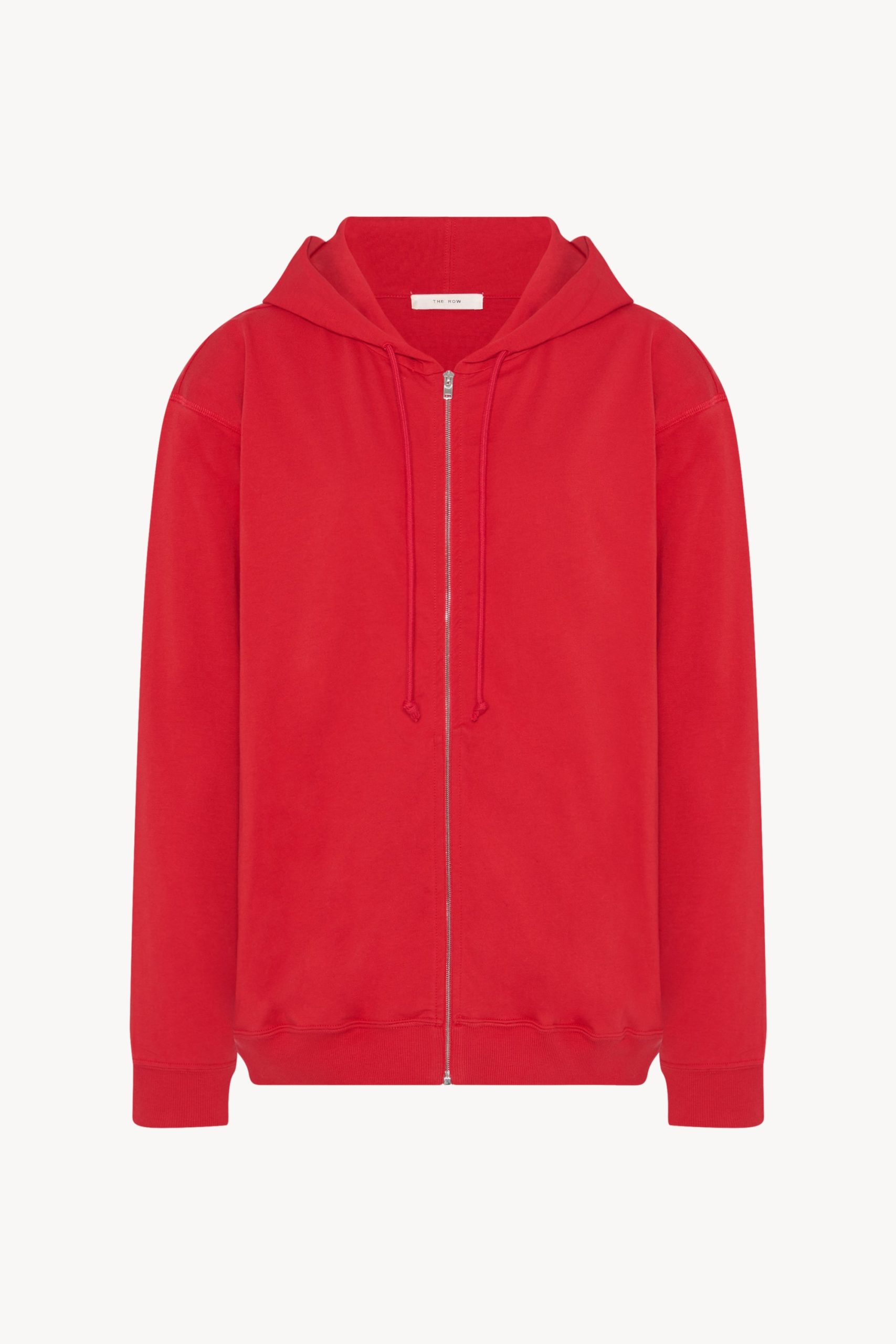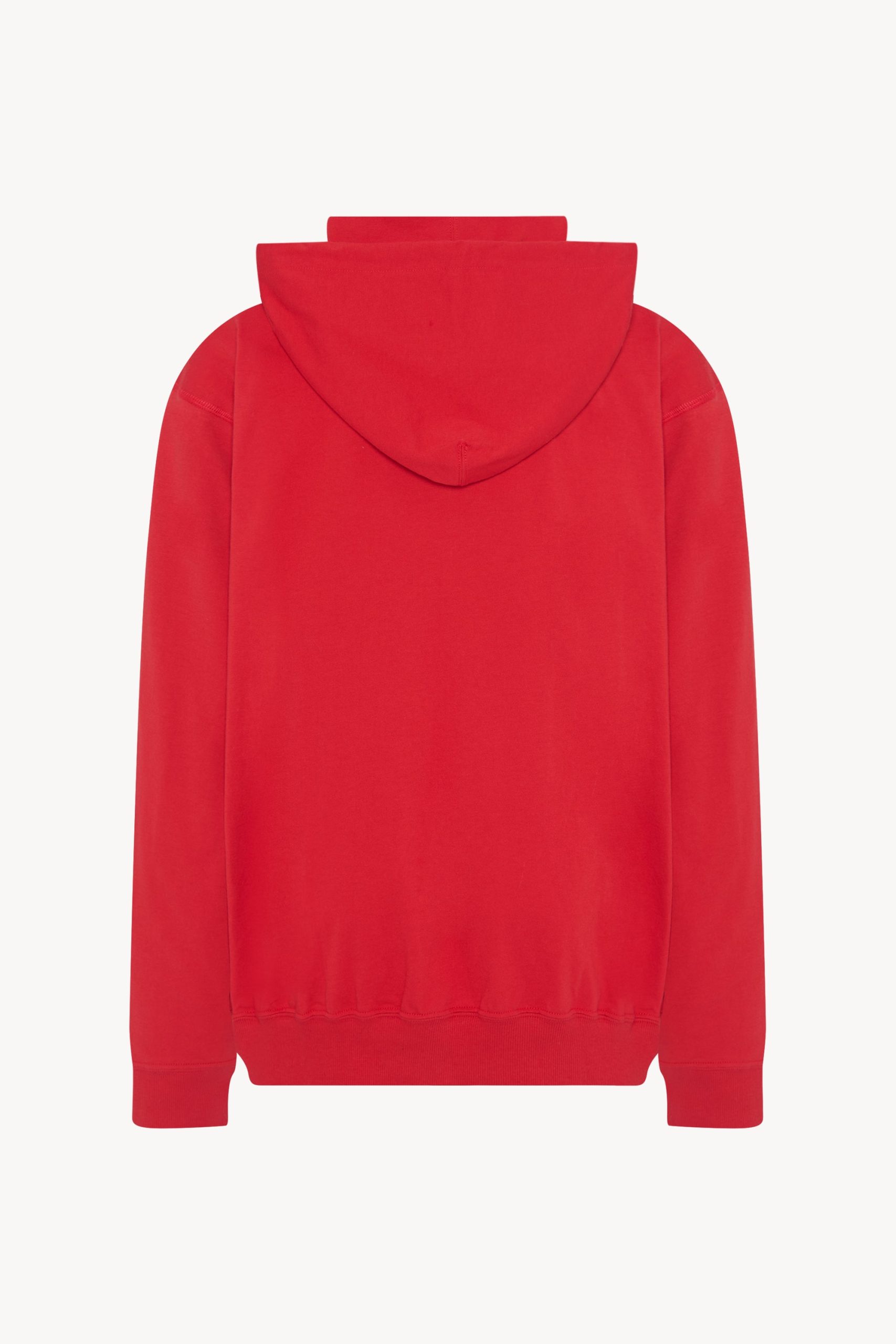 Relaxed hooded sweatshirt in brushed organic cotton jersey with side seam pockets and two-way zipper closure at center front.