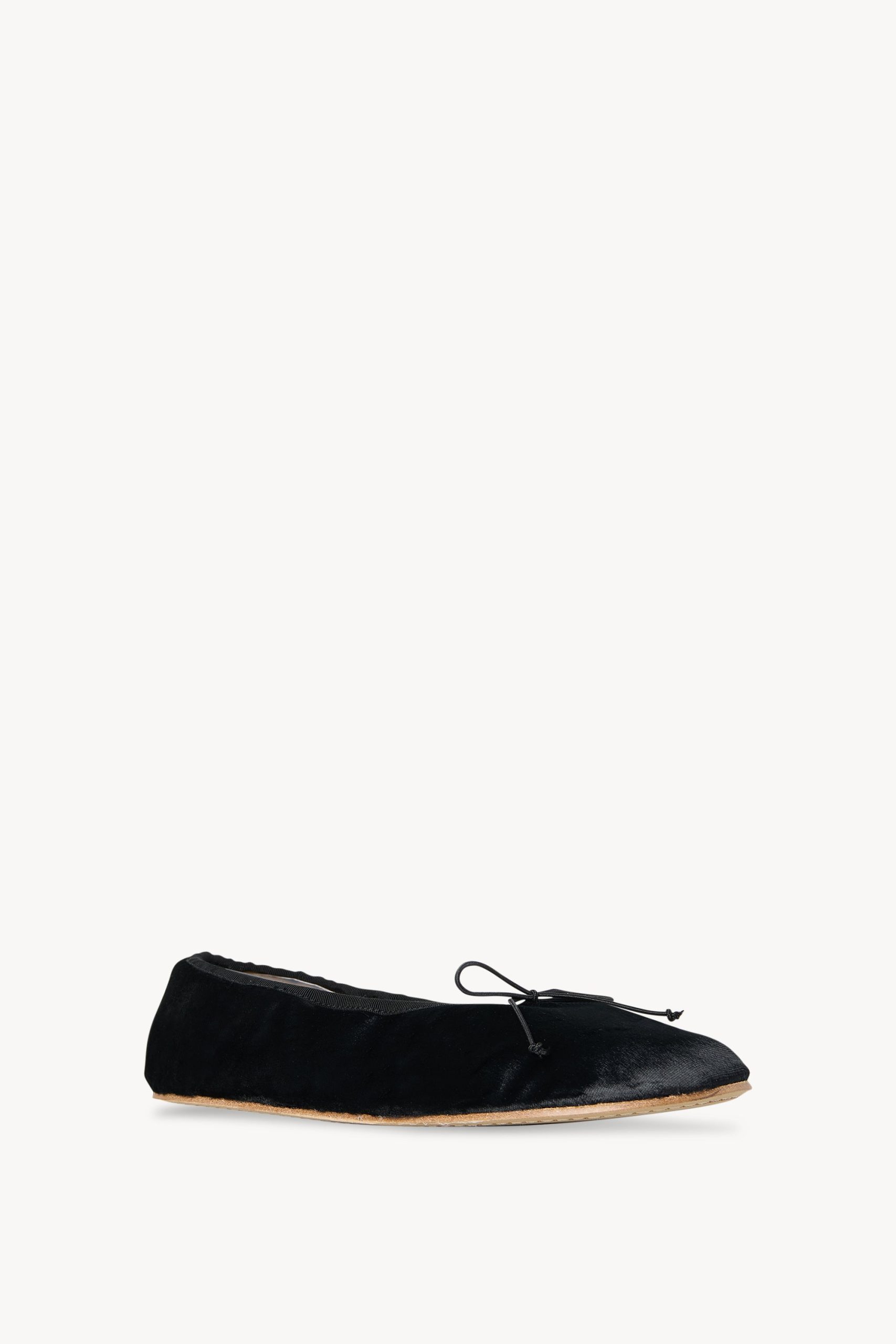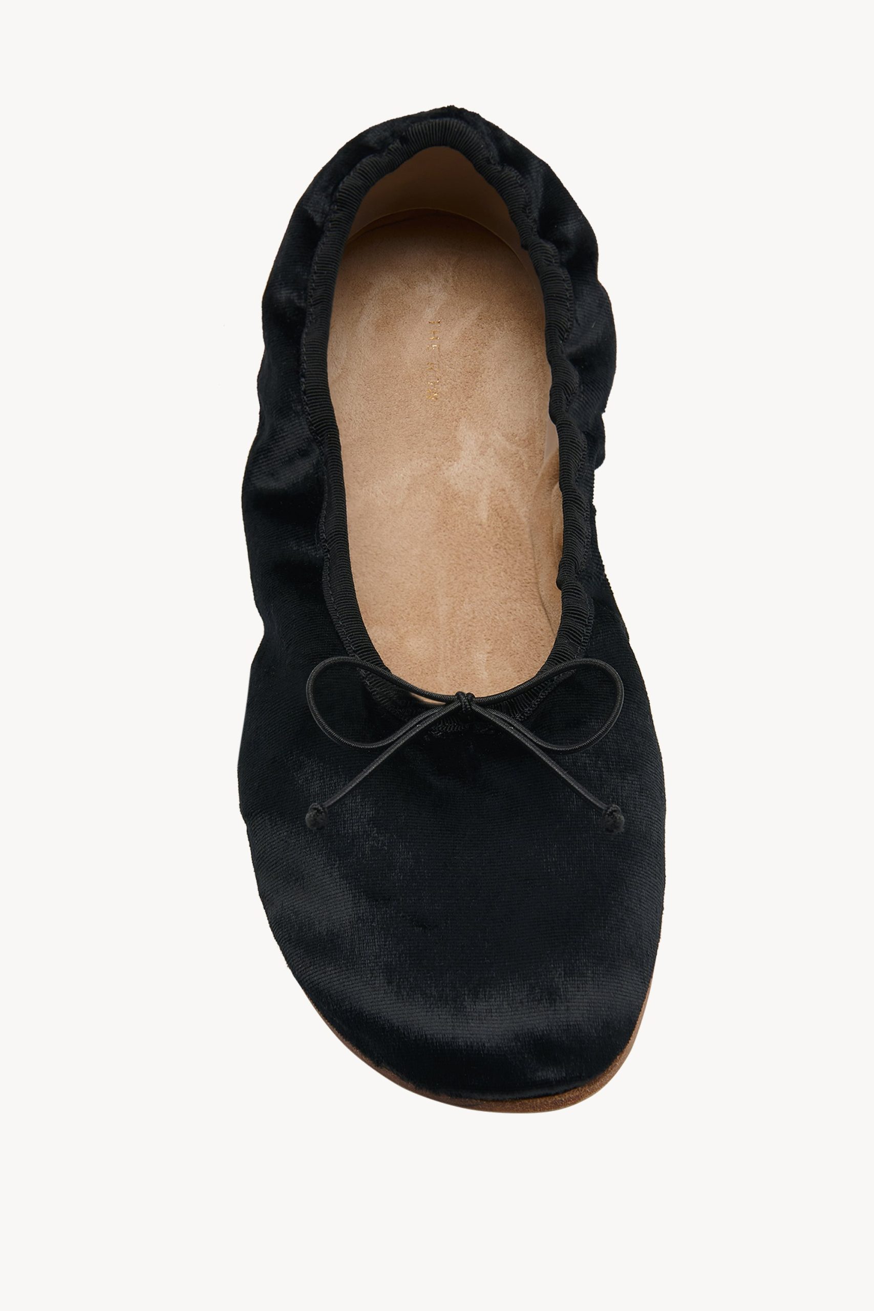 Classic ballet flat in sleek velvet with grosgrain piping. adjustable elastic tie. and flexible leather sole.