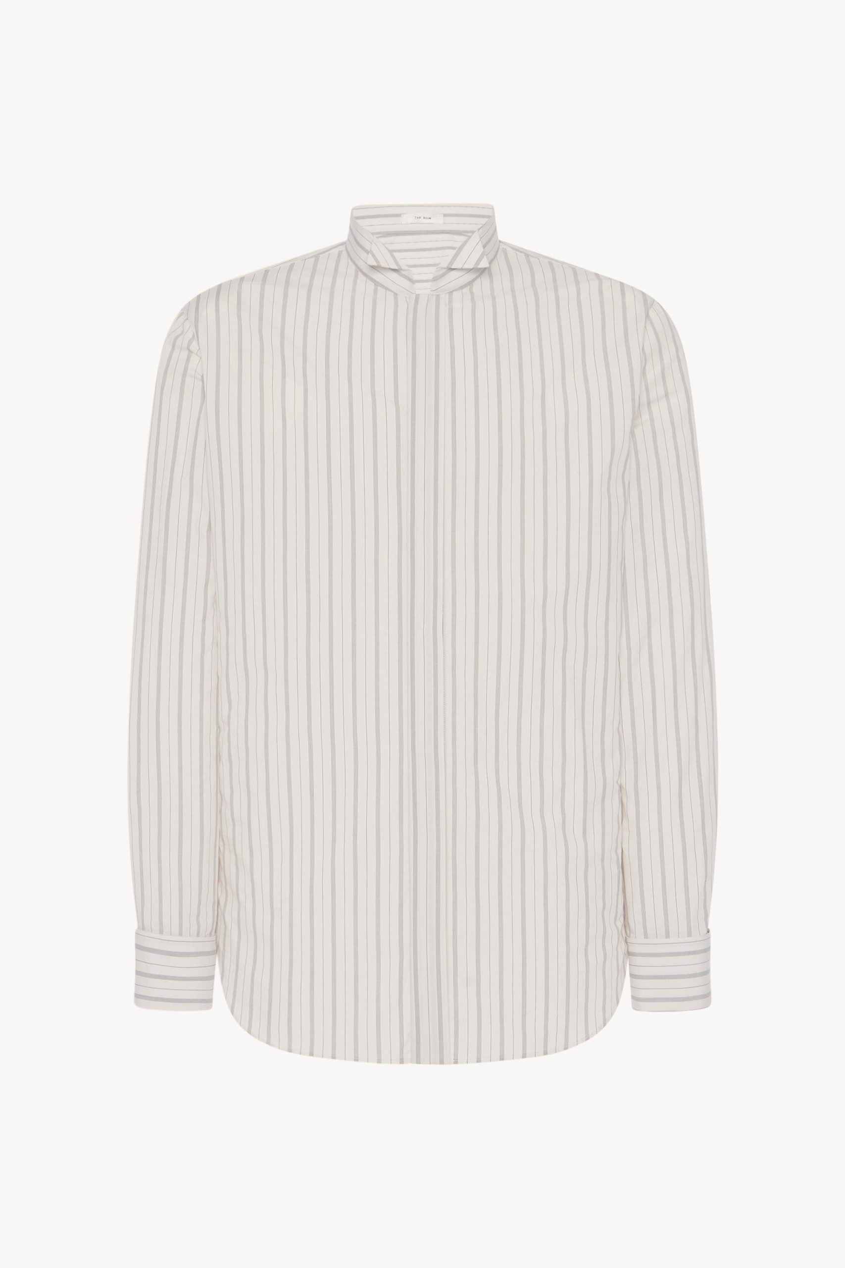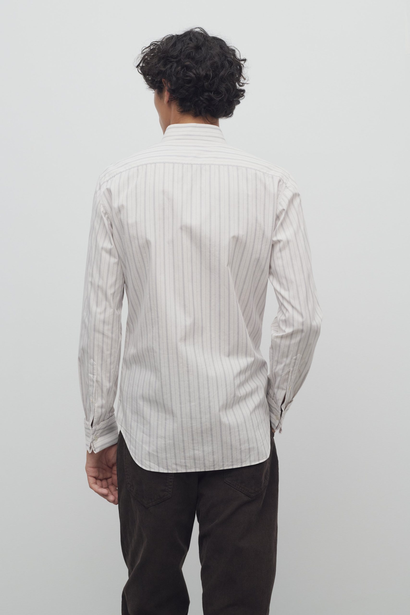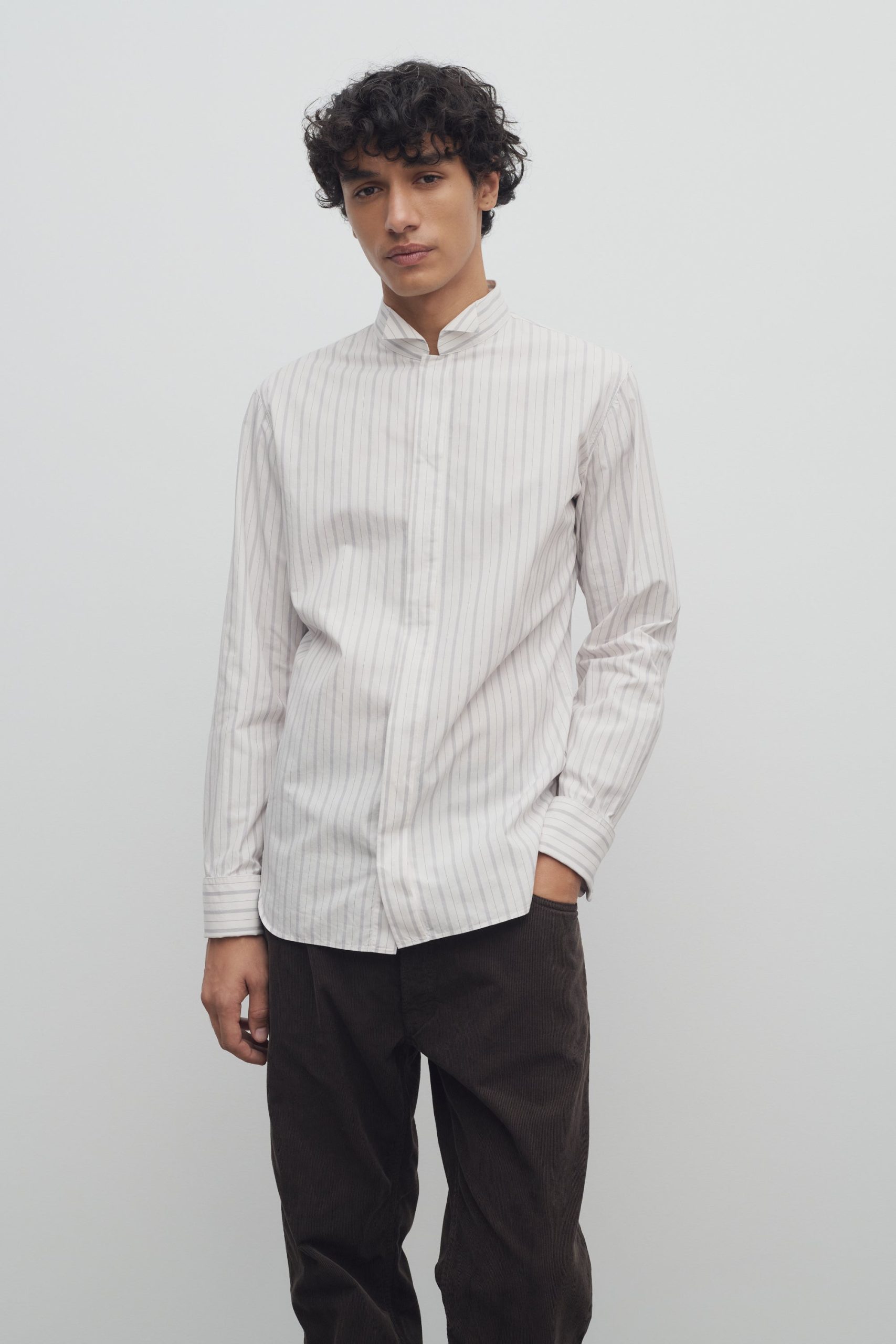 Streamlined button-up shirt in organic cotton poplin with slim fit. wingtip tuxedo collar. and concealed front placket with mother-of-pearl buttons.