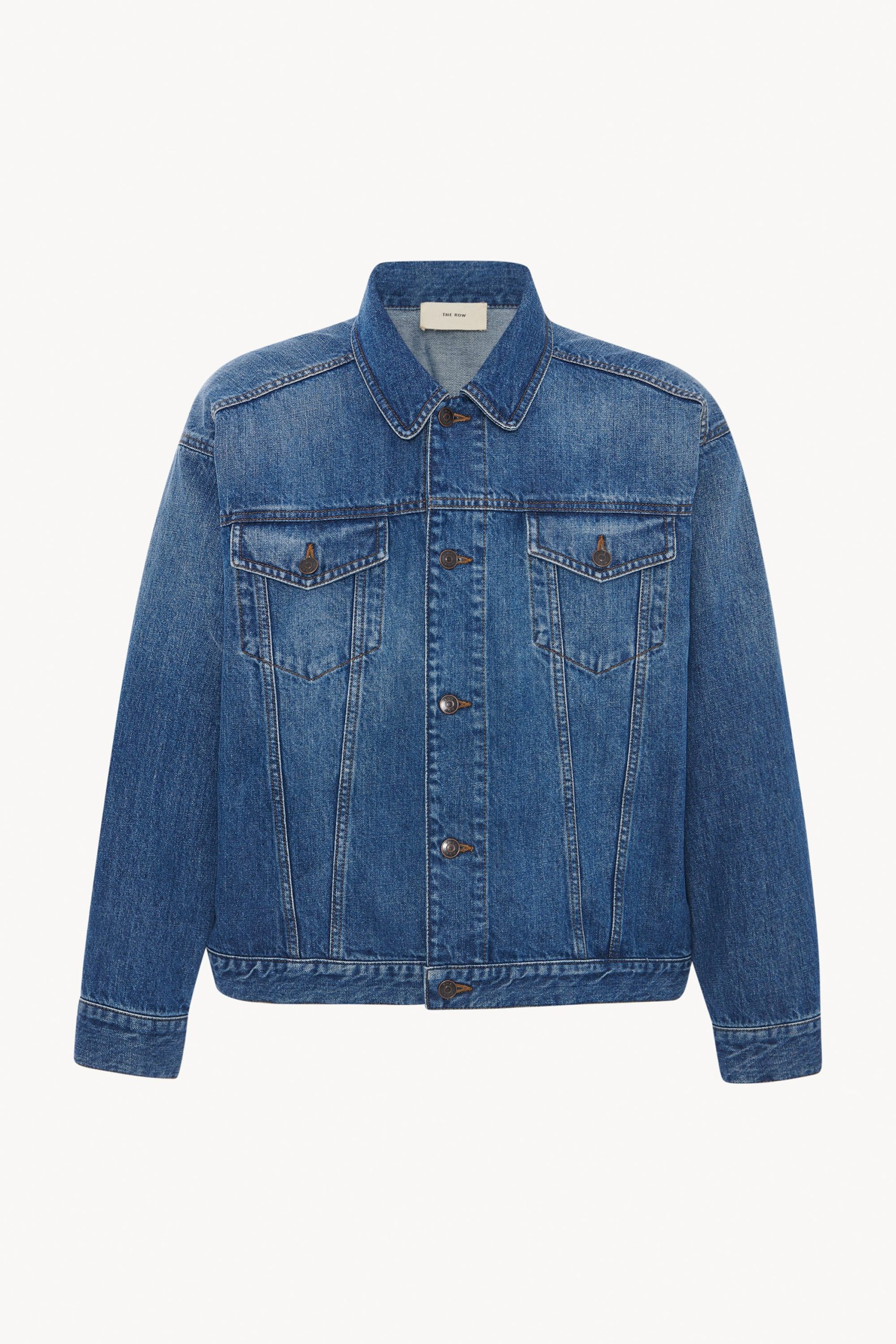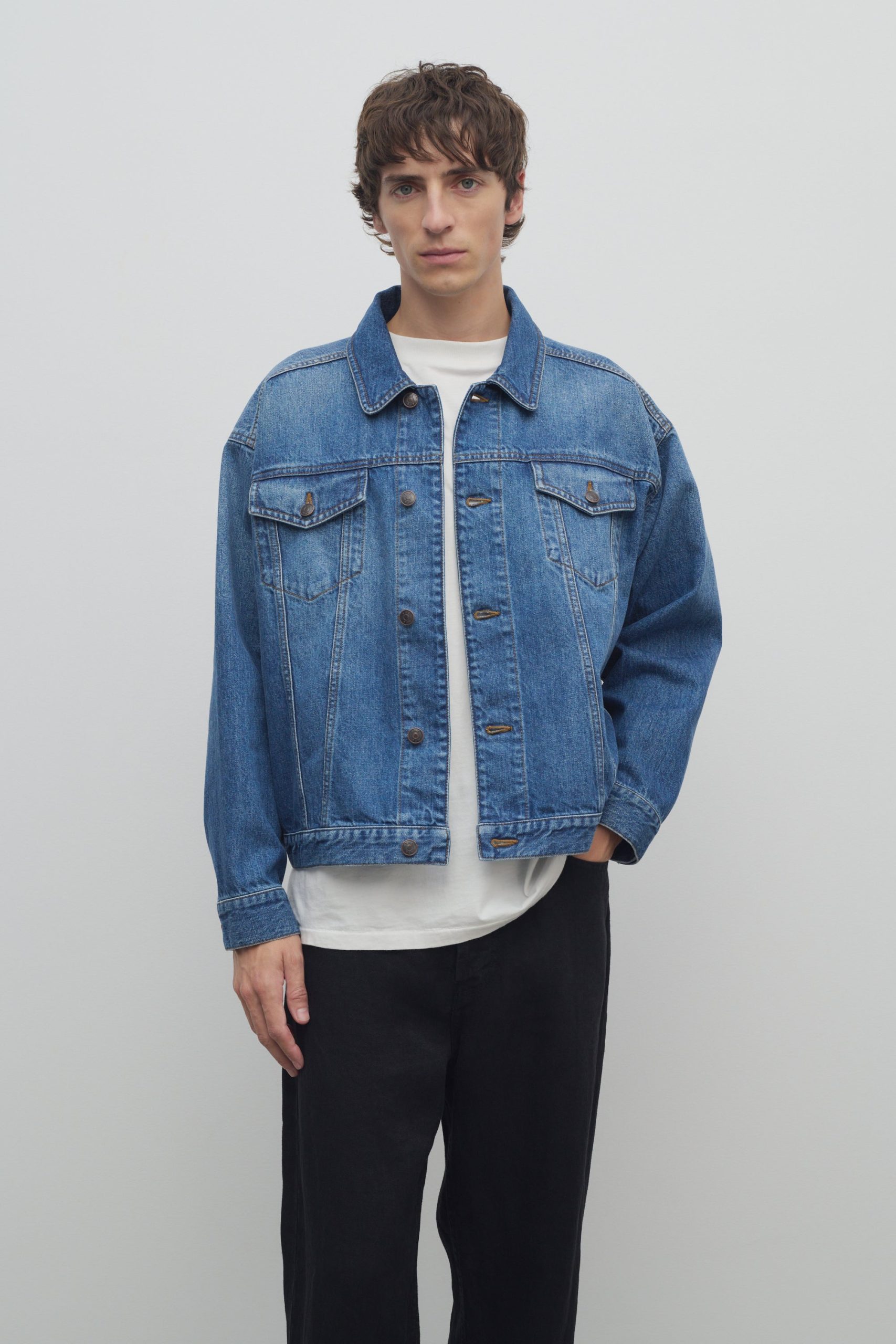 Classic denim jacket in garment treated denim with two front patch pockets. angled front seams. and front button placket.