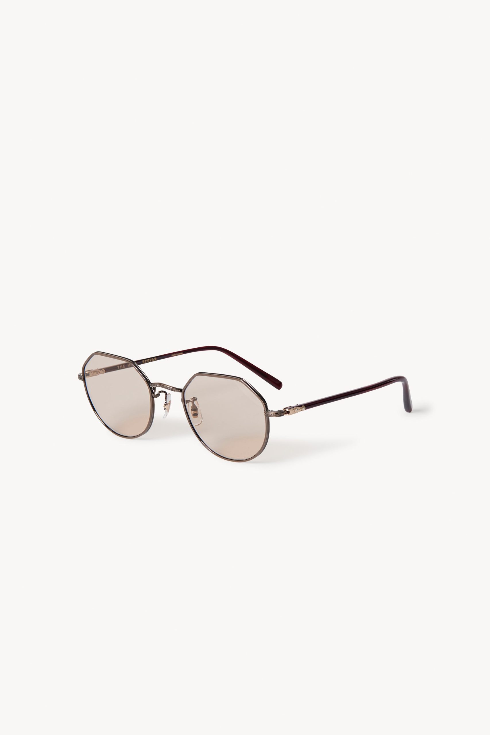 Three-dimensional round sunglasses with curved color lenses and titanium frame.
