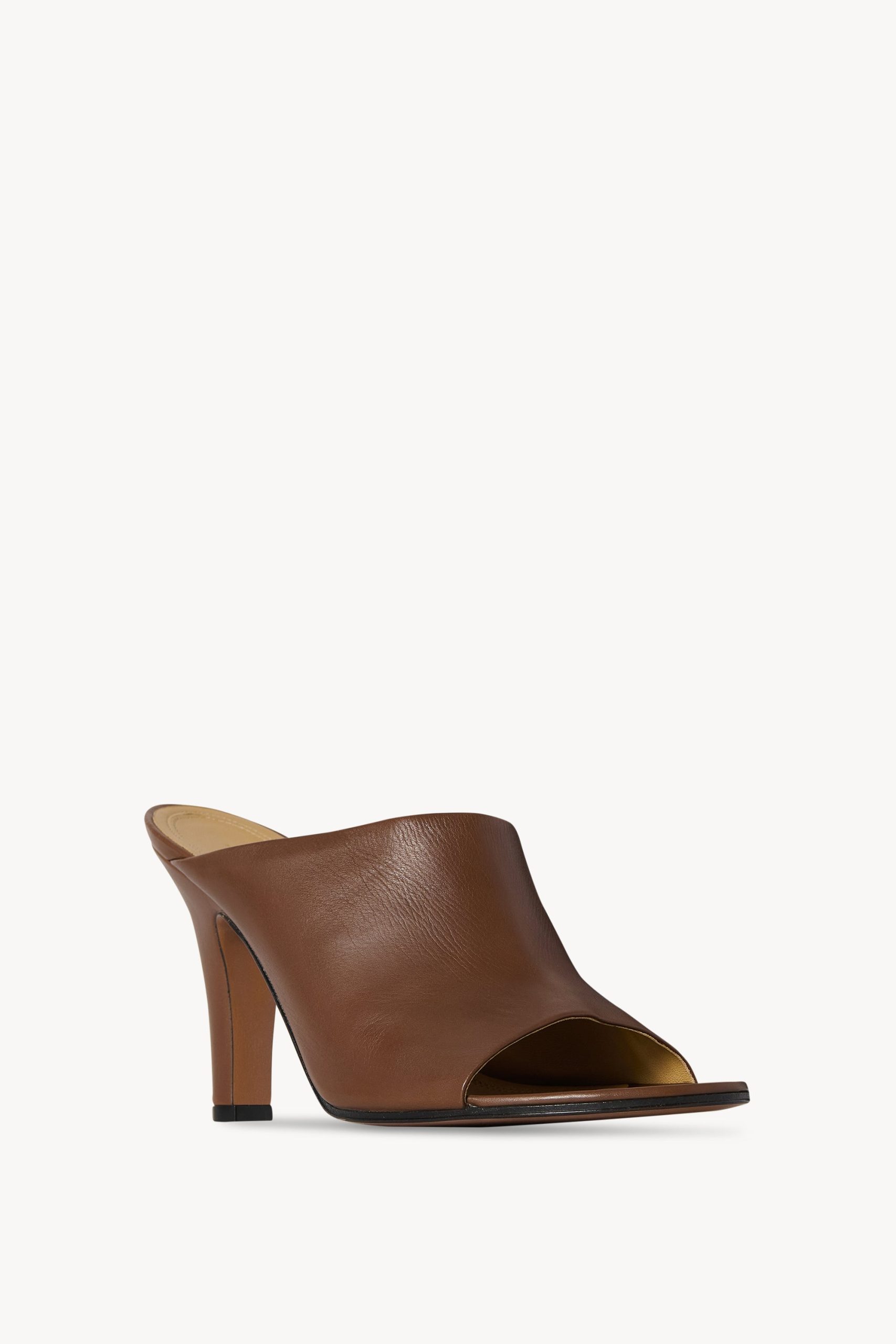 Heeled mule sandal in soft calfskin leather with curved. asymmetrical vamp and nappa leather lining.