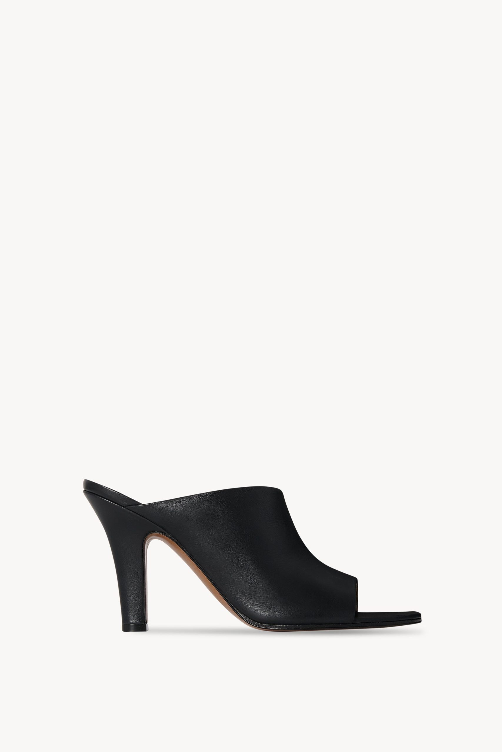 Heeled mule sandal in soft calfskin leather with curved. asymmetrical vamp and nappa leather lining.