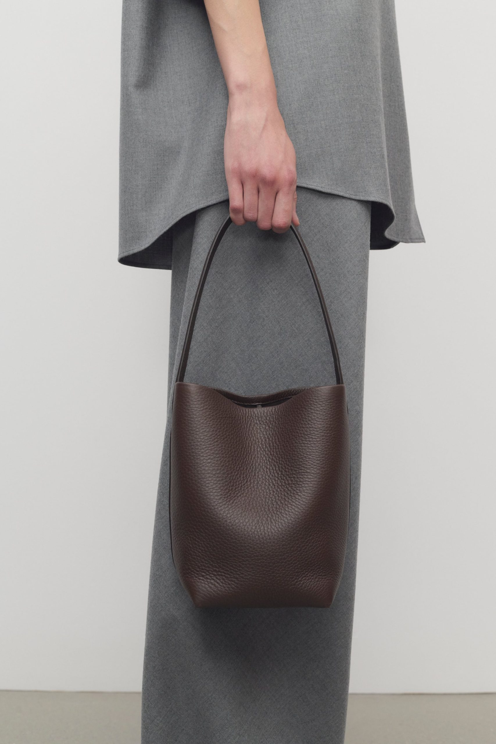 Classic tote bag in textured calfskin leather with interior tie closure and flat handle.