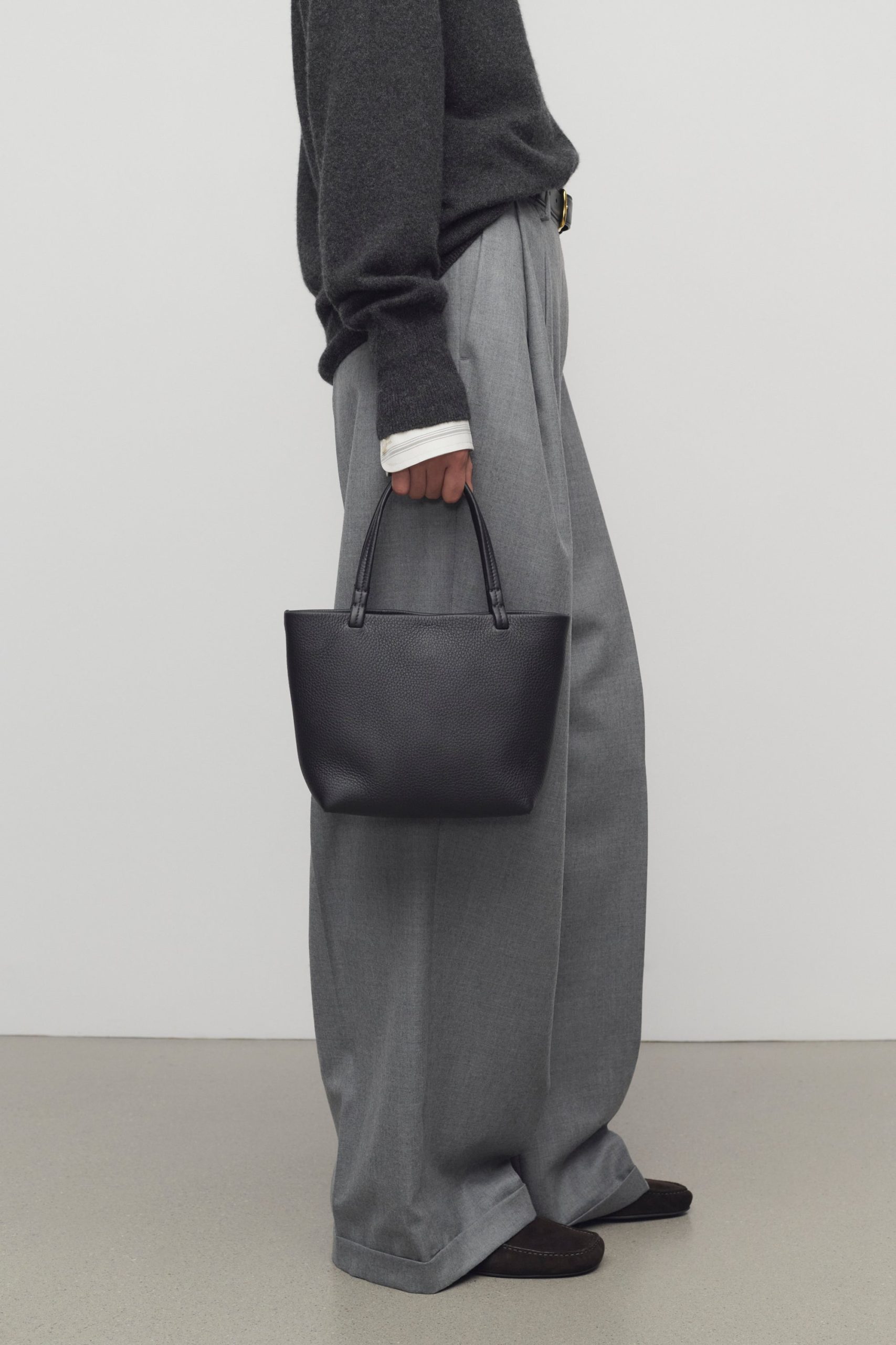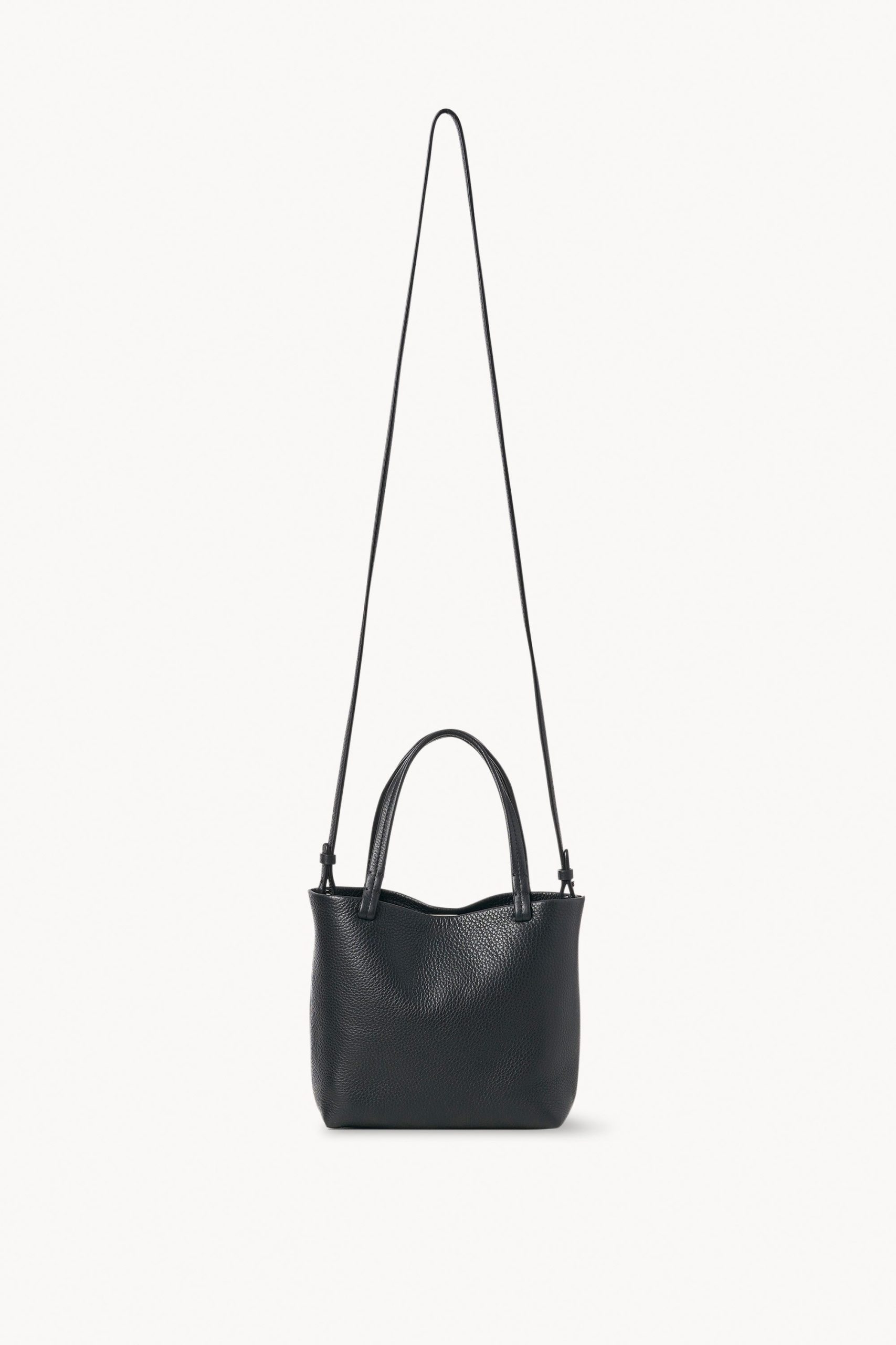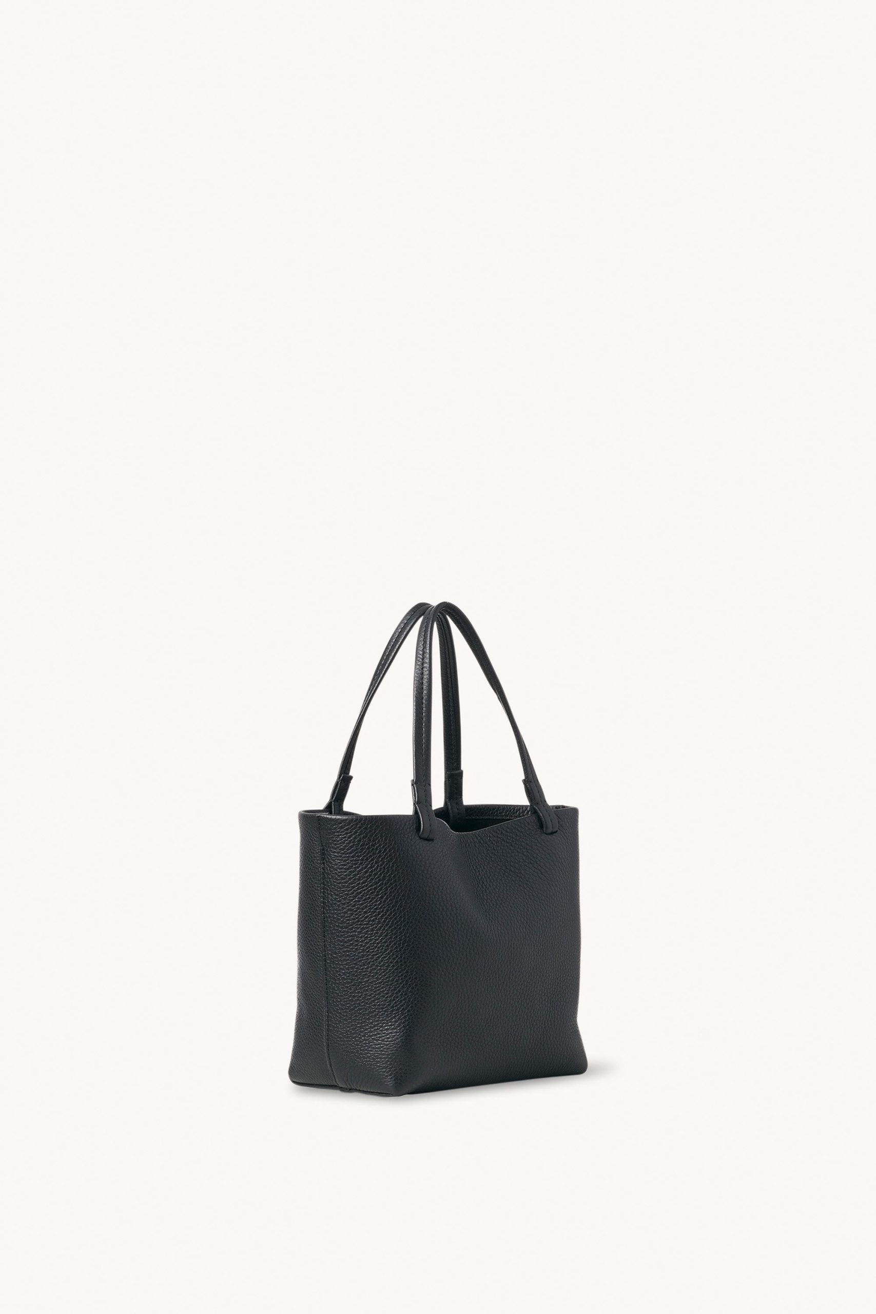 Small classic tote bag in grained calfskin leather with interior toggle closure and flat handles.