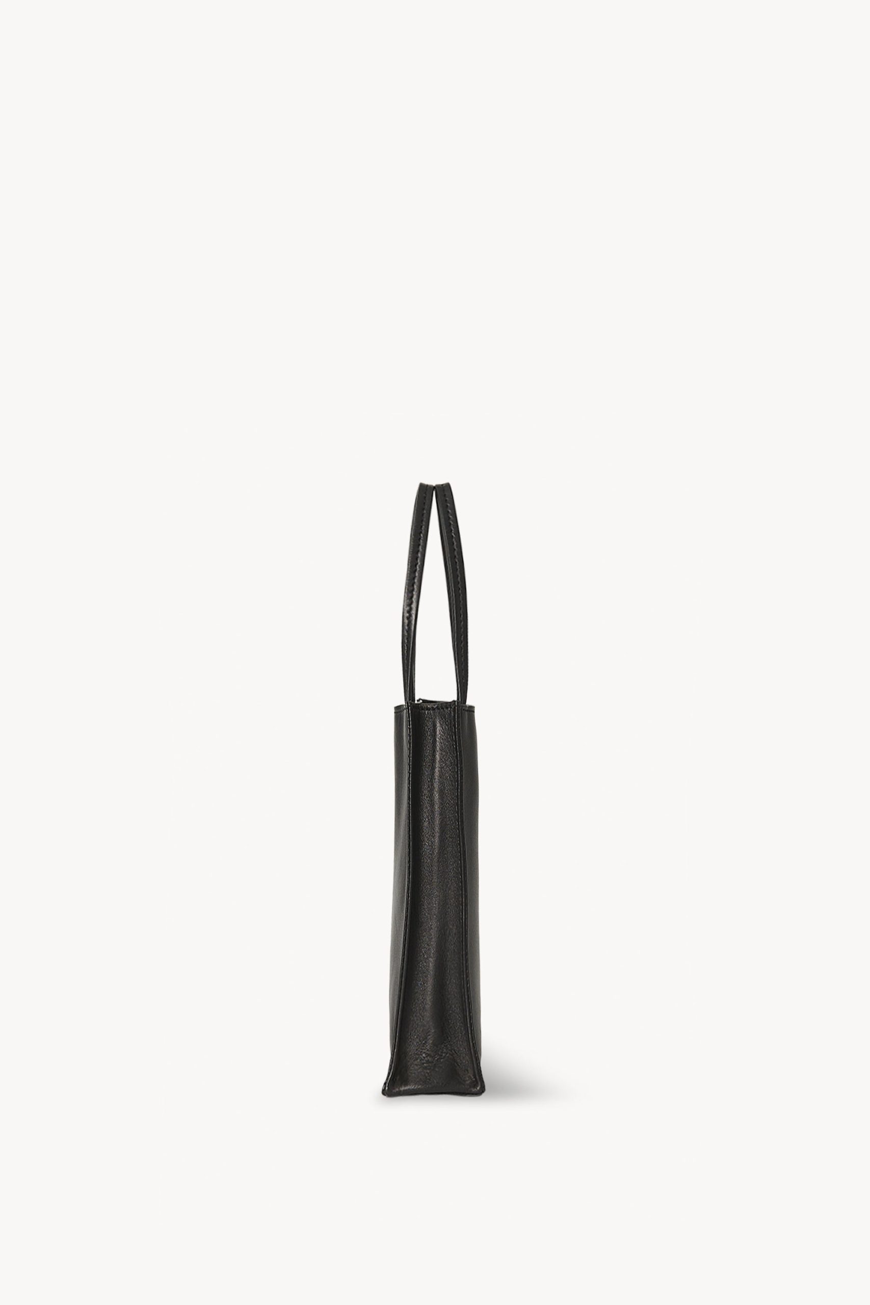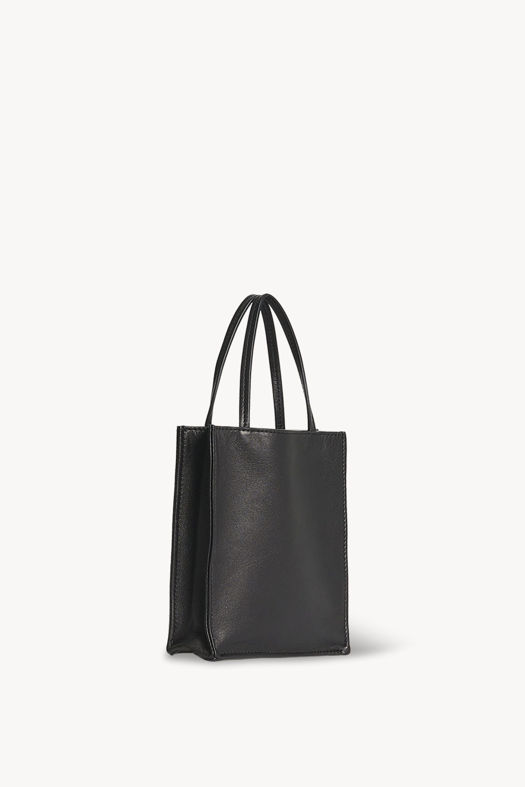 Compact mini tote in smooth nappa leather with stitched top handles and single interior pocket.