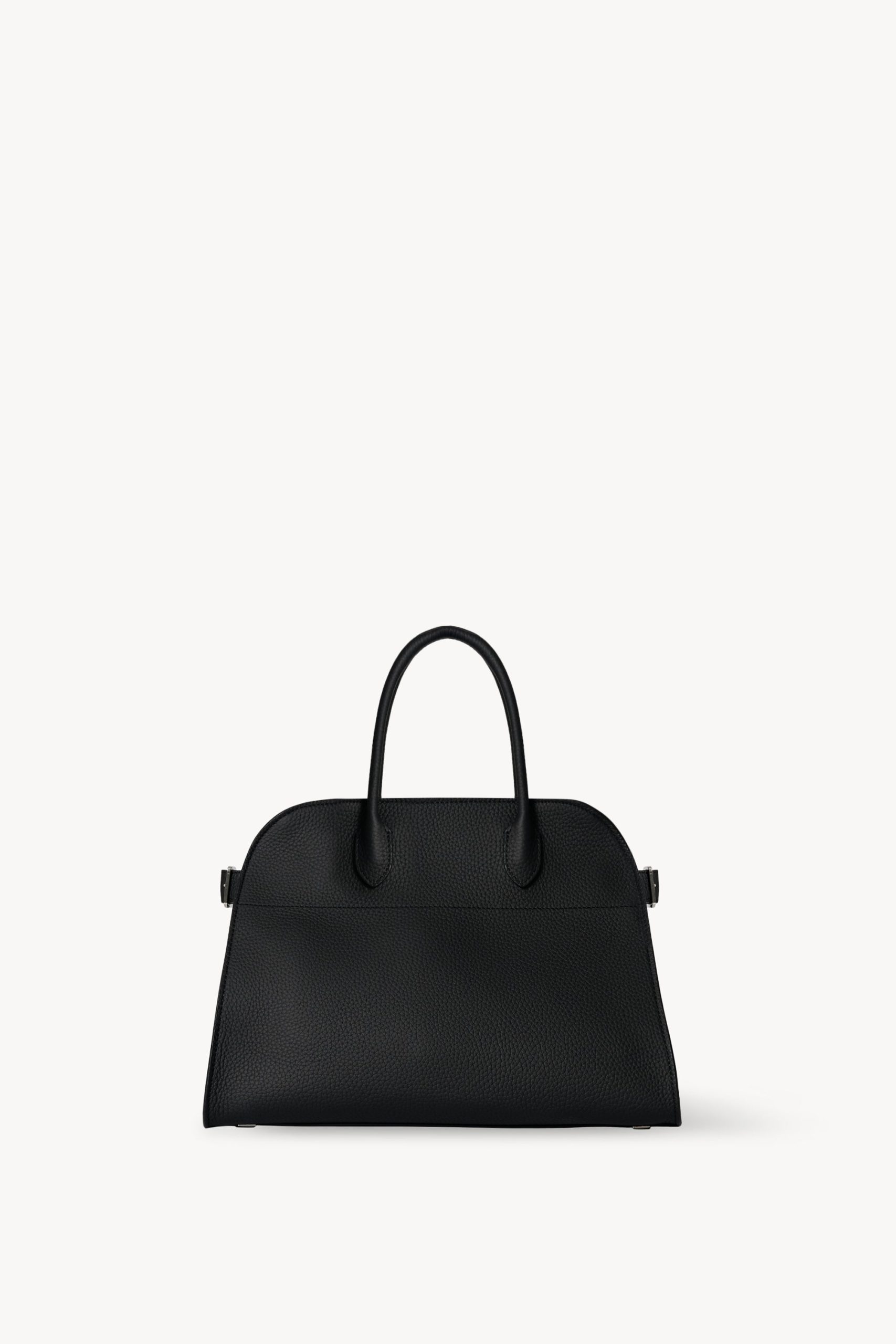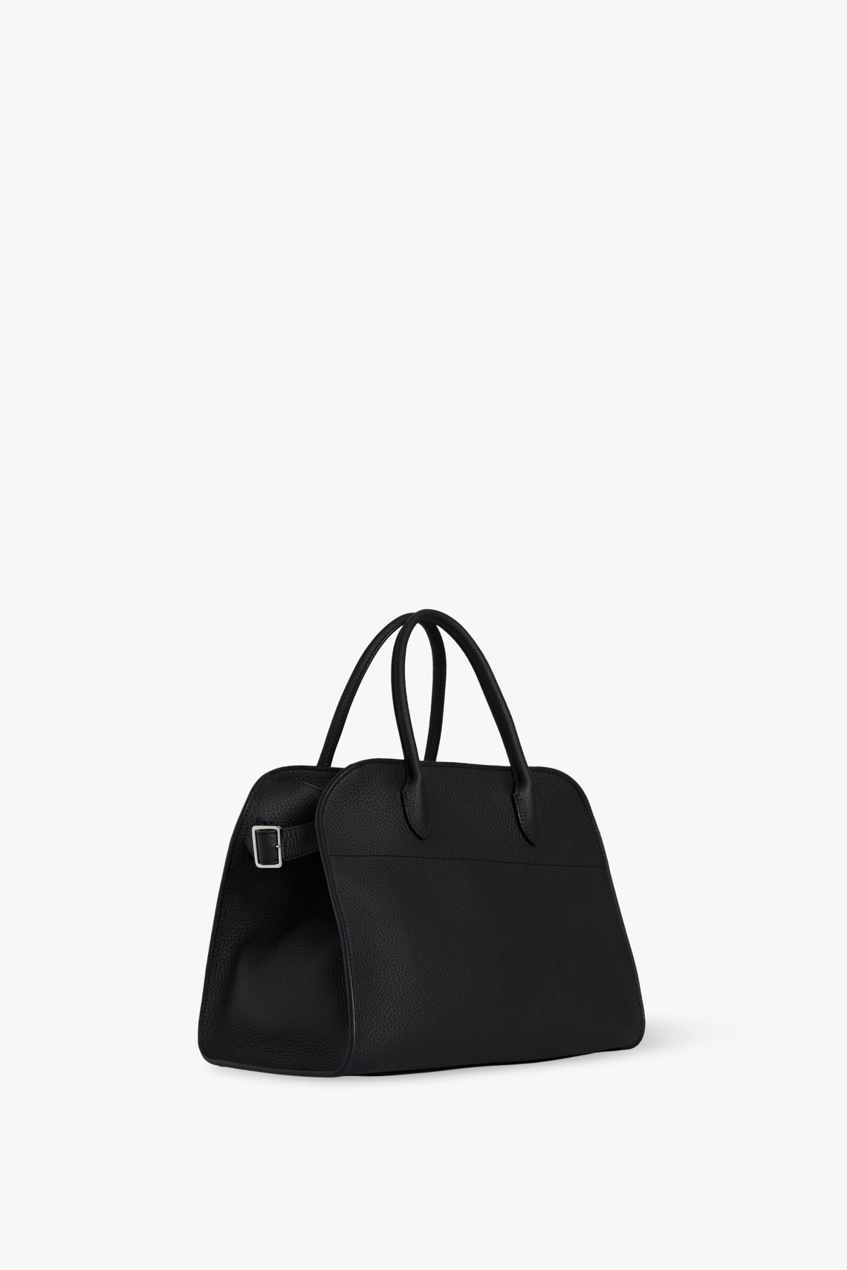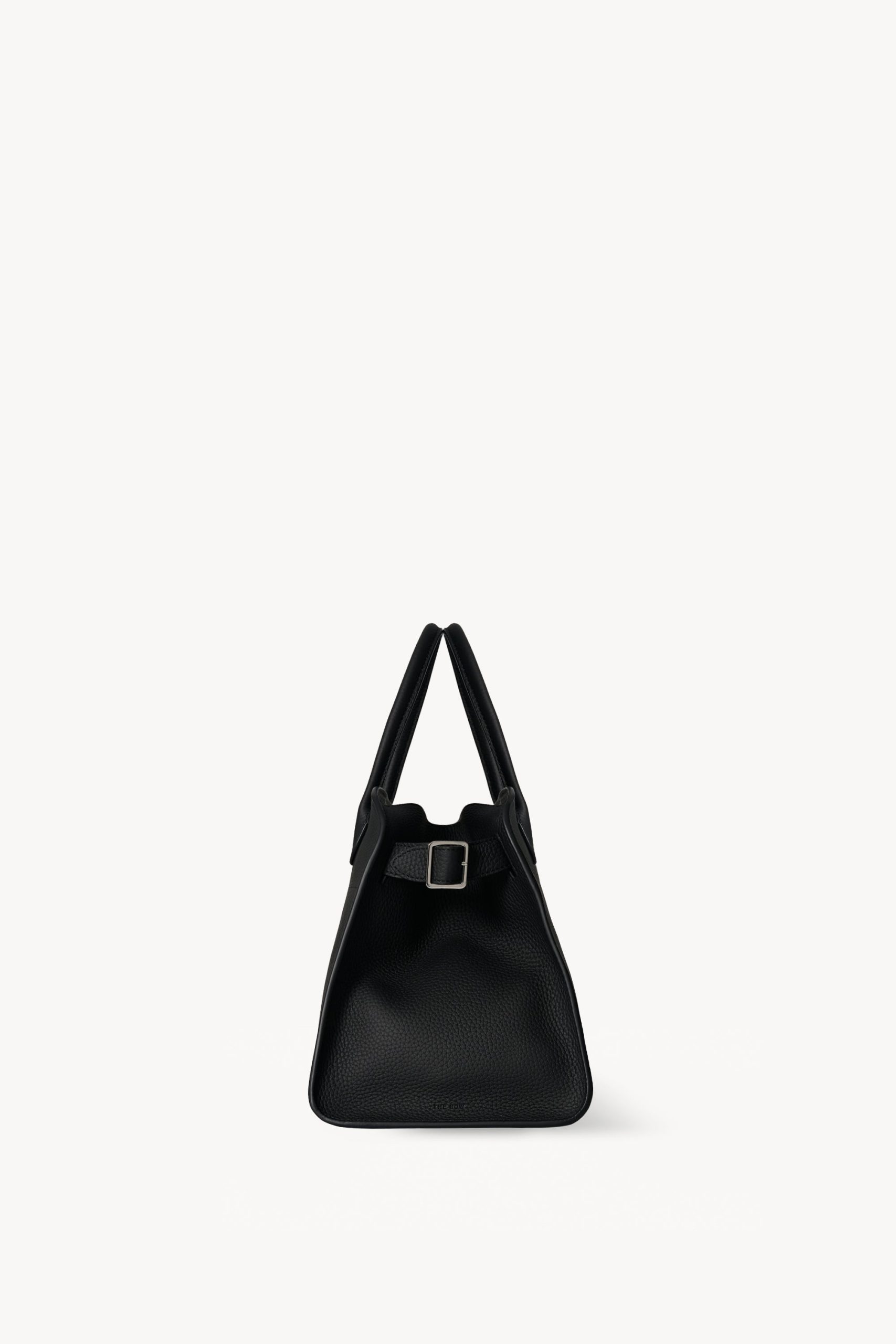 Softly structured top-handle bag in matte grained calfskin leather with belted gusseted side panels and interior toggle closure.