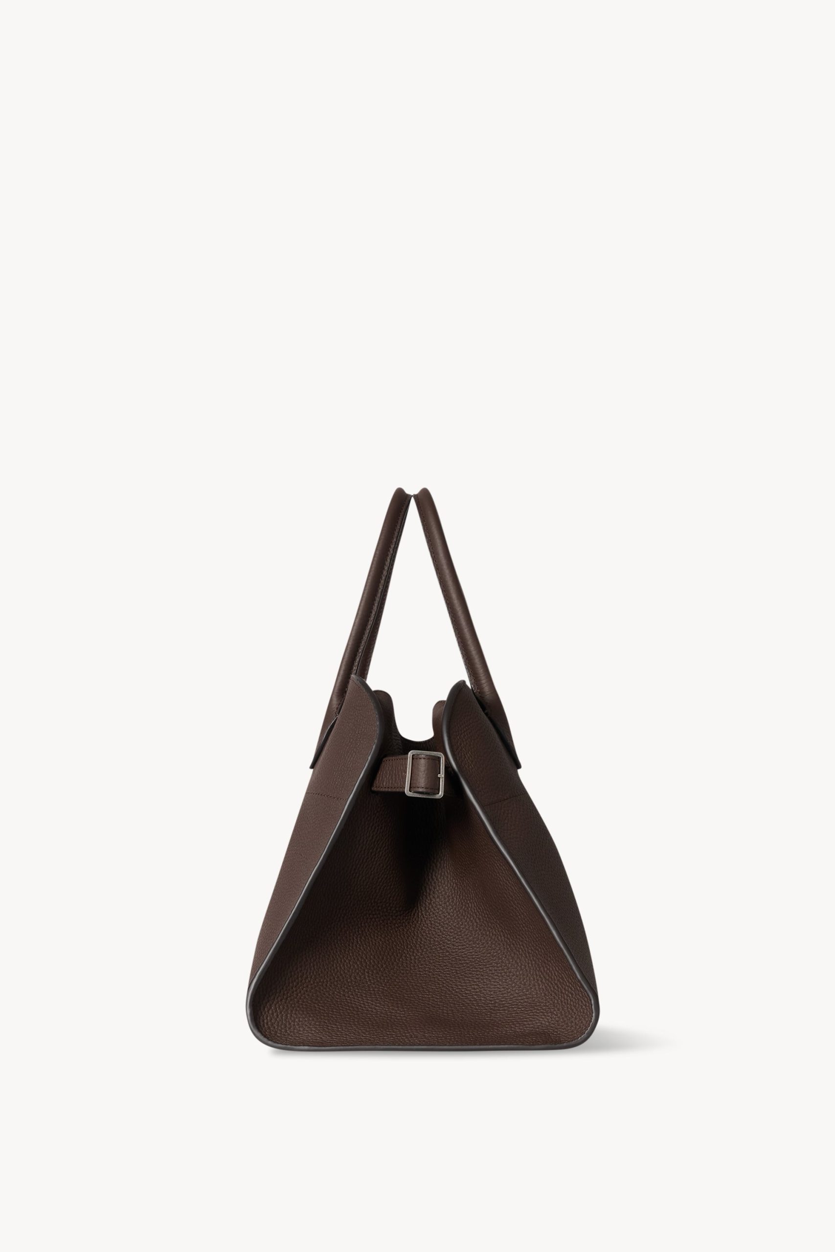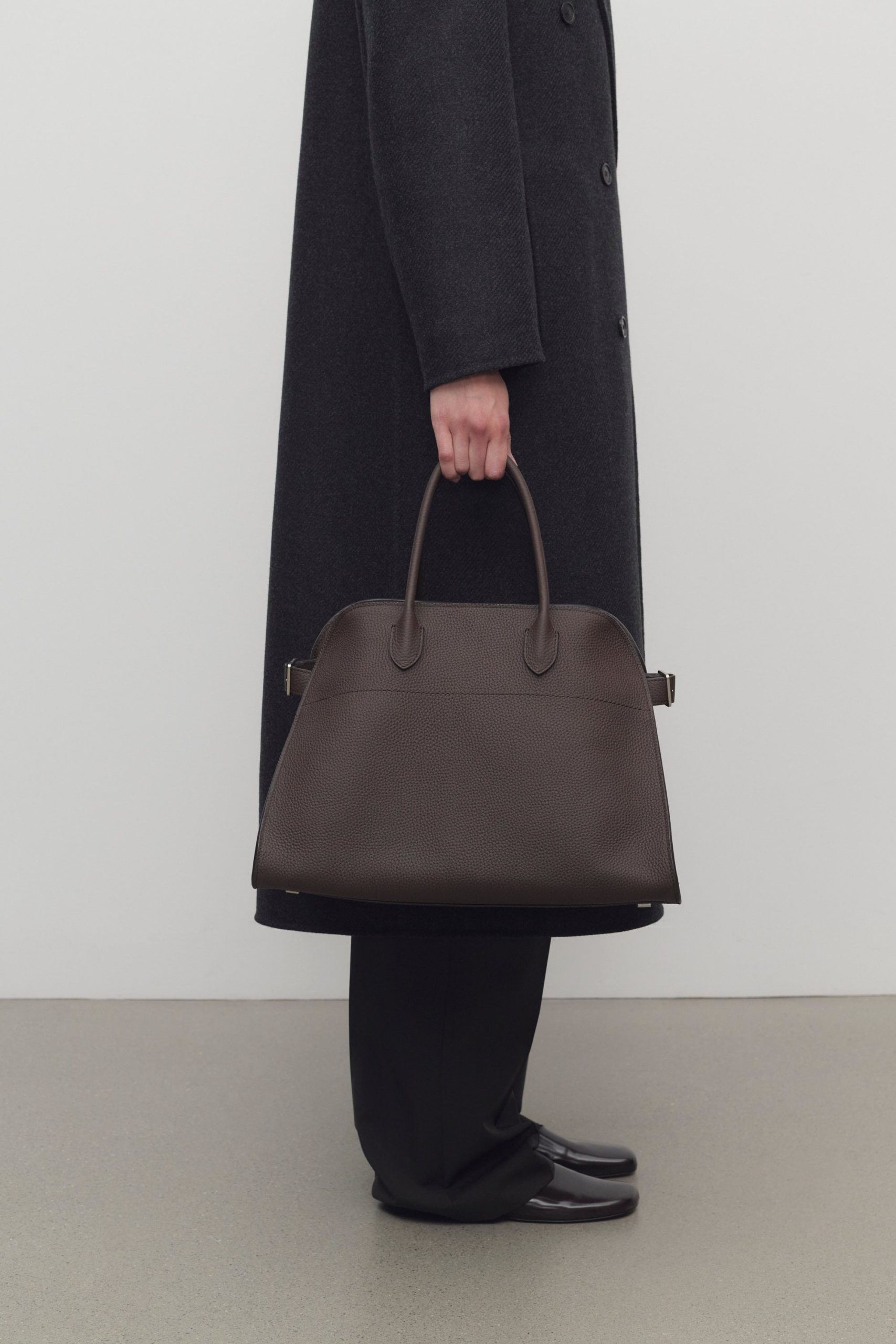 Softly structured top-handle bag in matte grained calfskin leather with belted gusseted side panels and interior toggle closure.