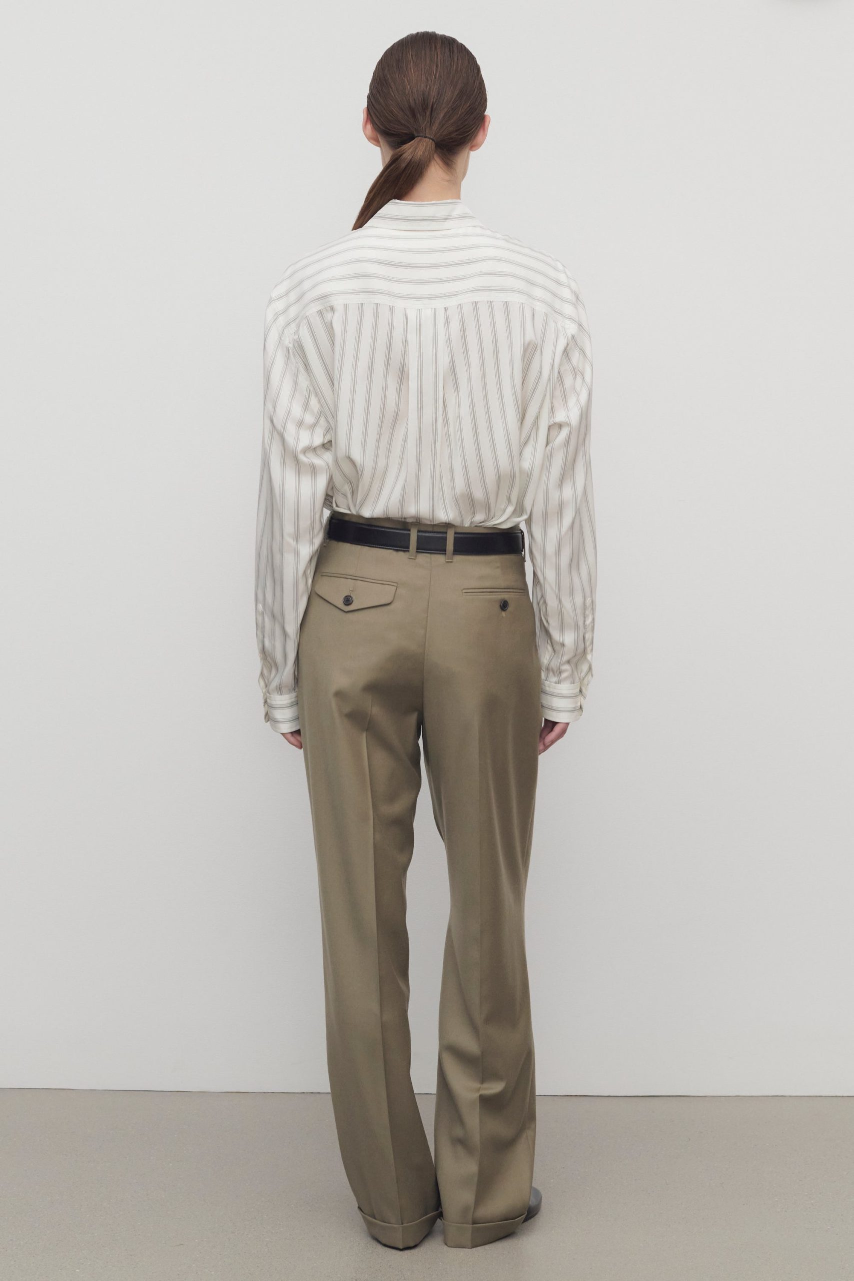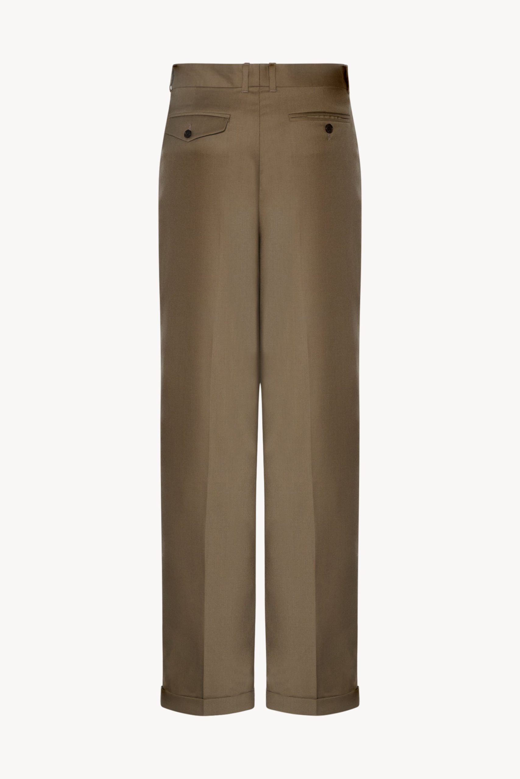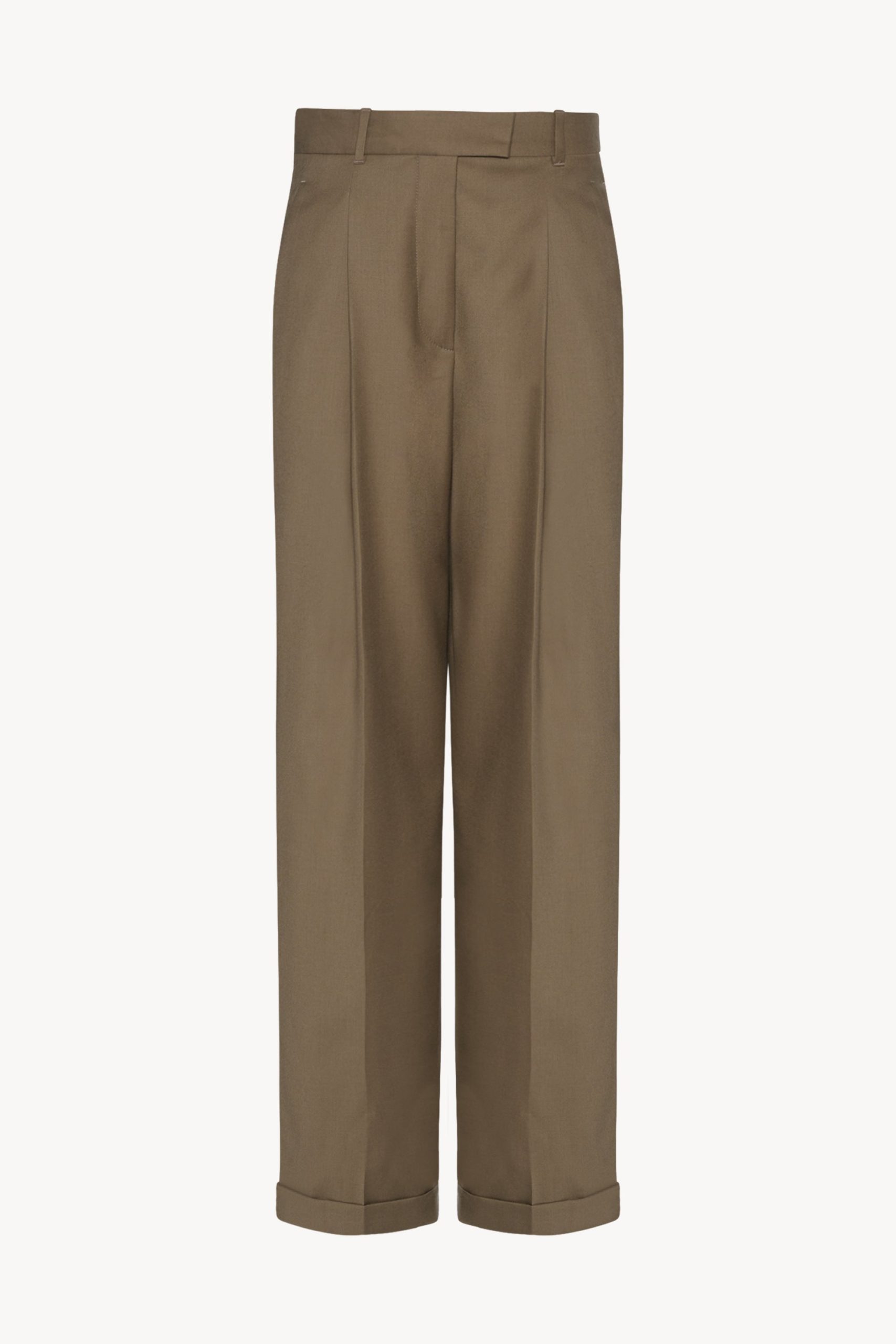 High-rise tailored trouser in virgin wool flannel with stitched front pleats. straight leg with rolled hem. and slanted side pockets.