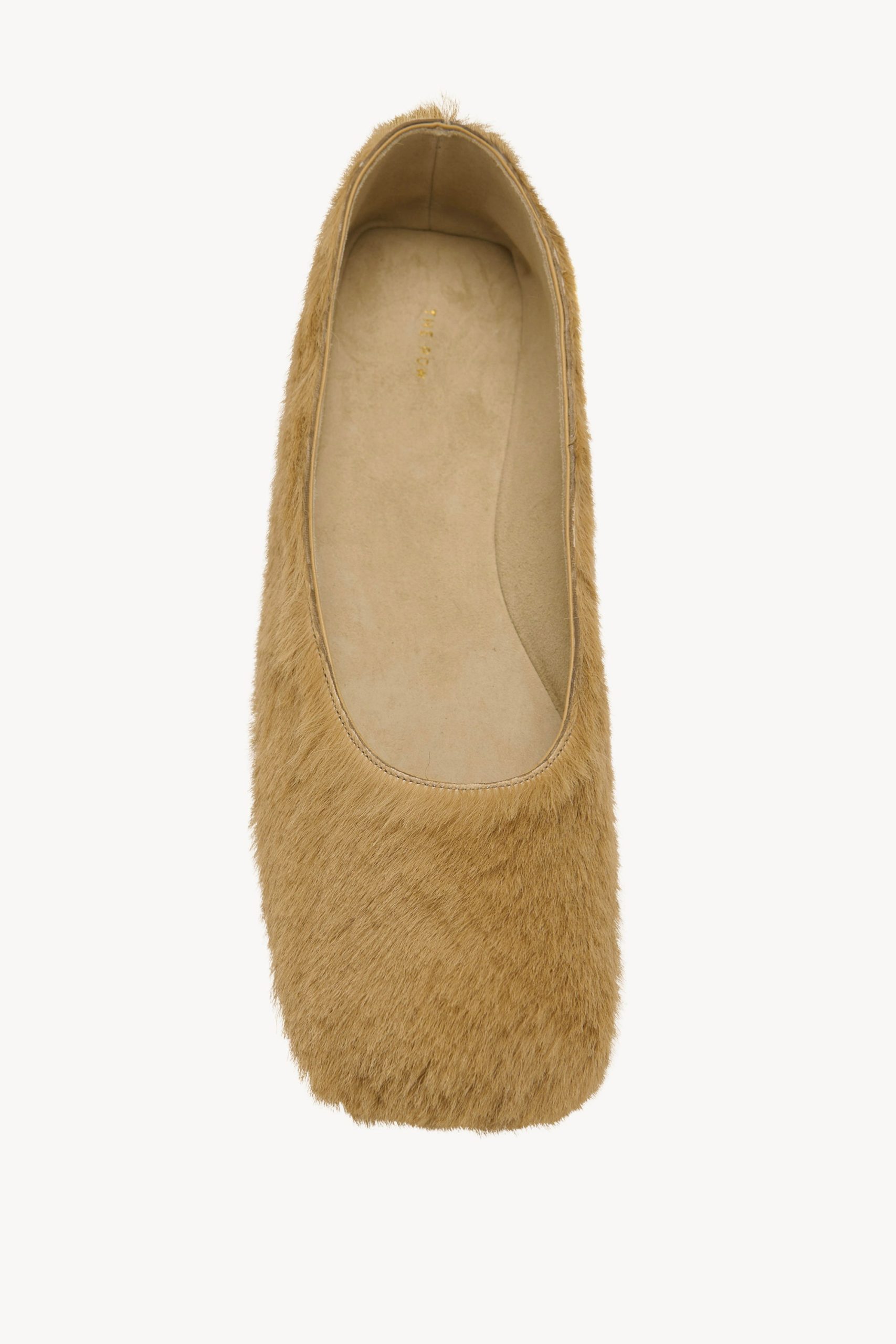 Minimal ballet flat in textured pony hair leather with squared toe and leather sole.