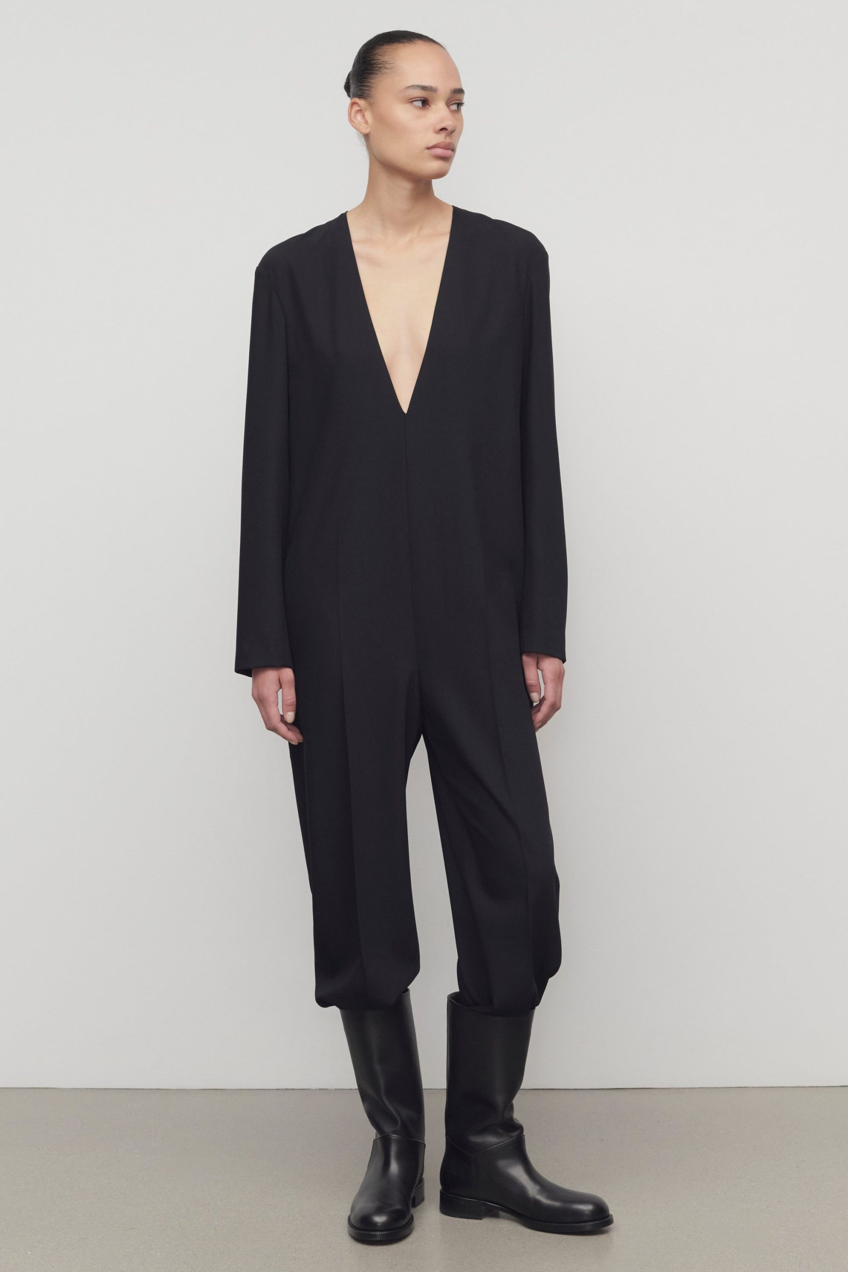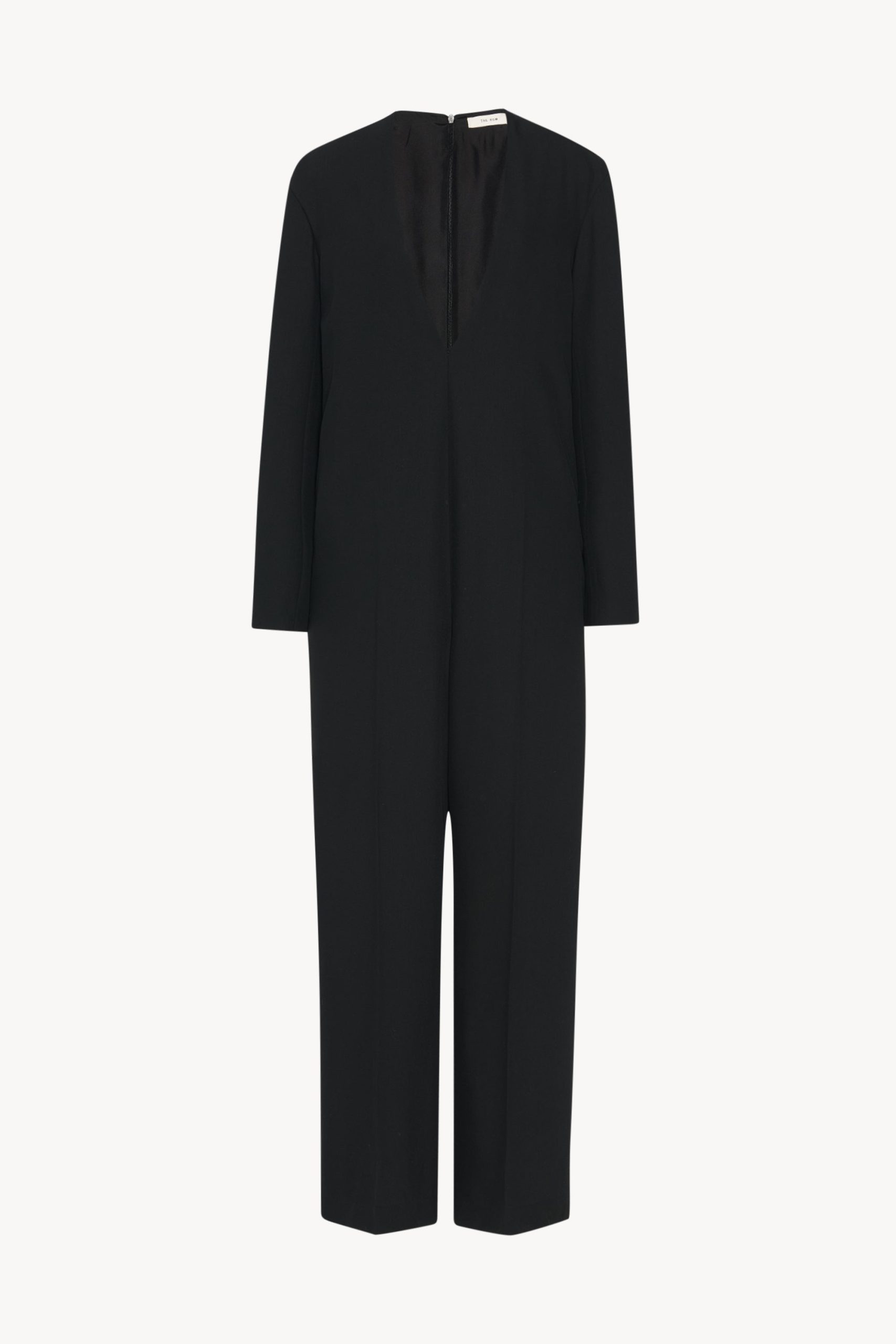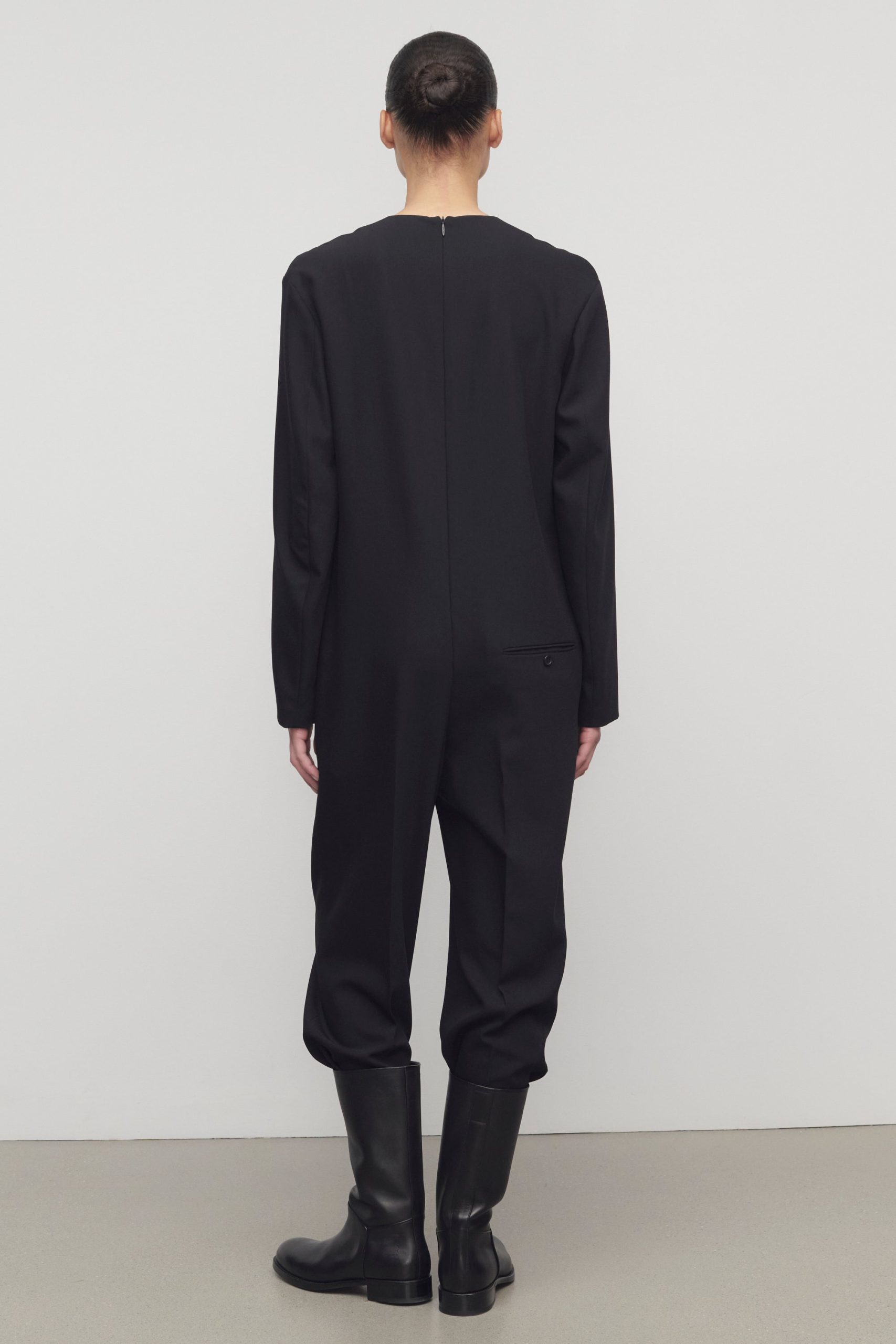 Relaxed tailored jumpsuit in smooth virgin wool gabardine with creased leg. side seam pockets. and center back zip closure.