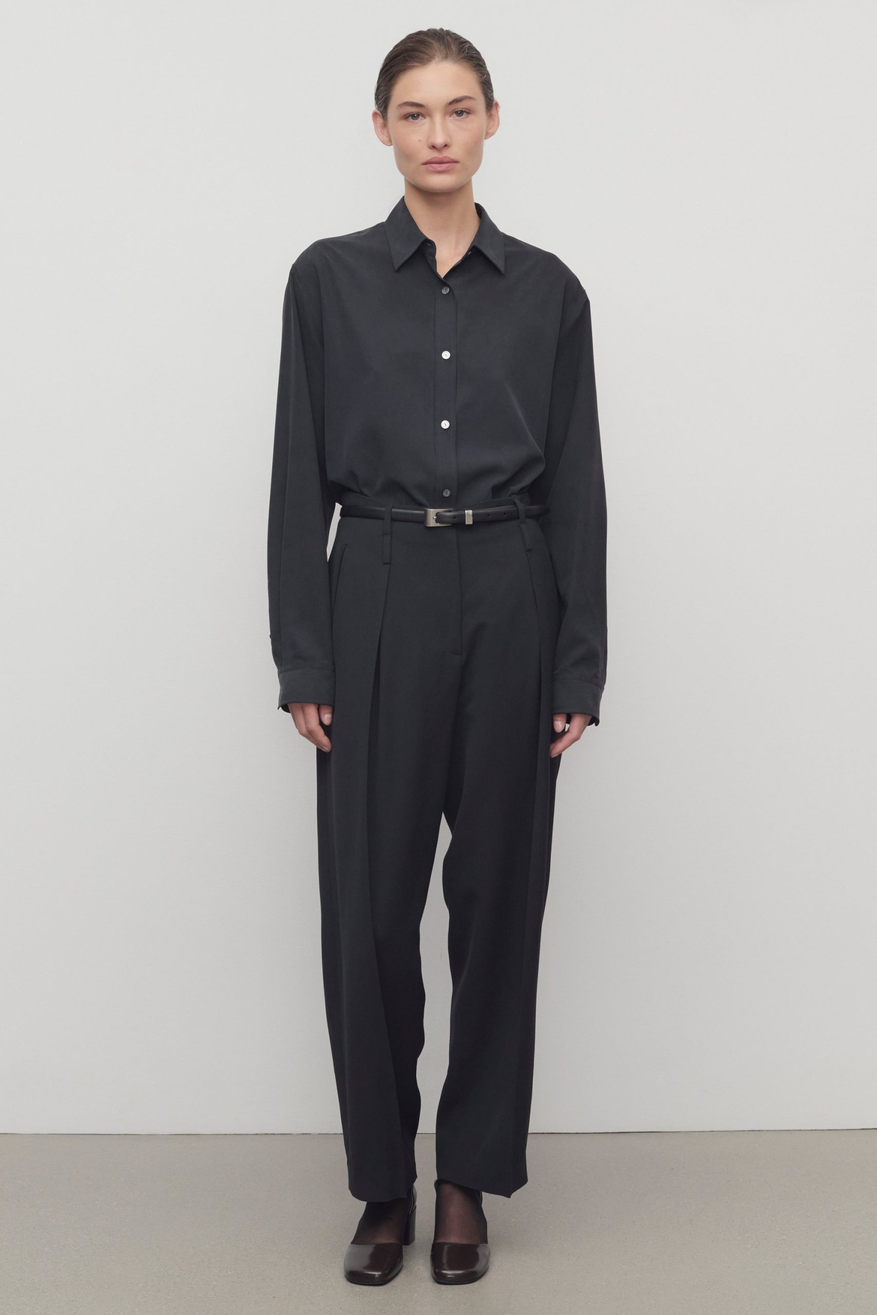 High-rise tailored trouser in lightweight silk twill with tapered hem. pressed front and back creases. and side welt pockets.
