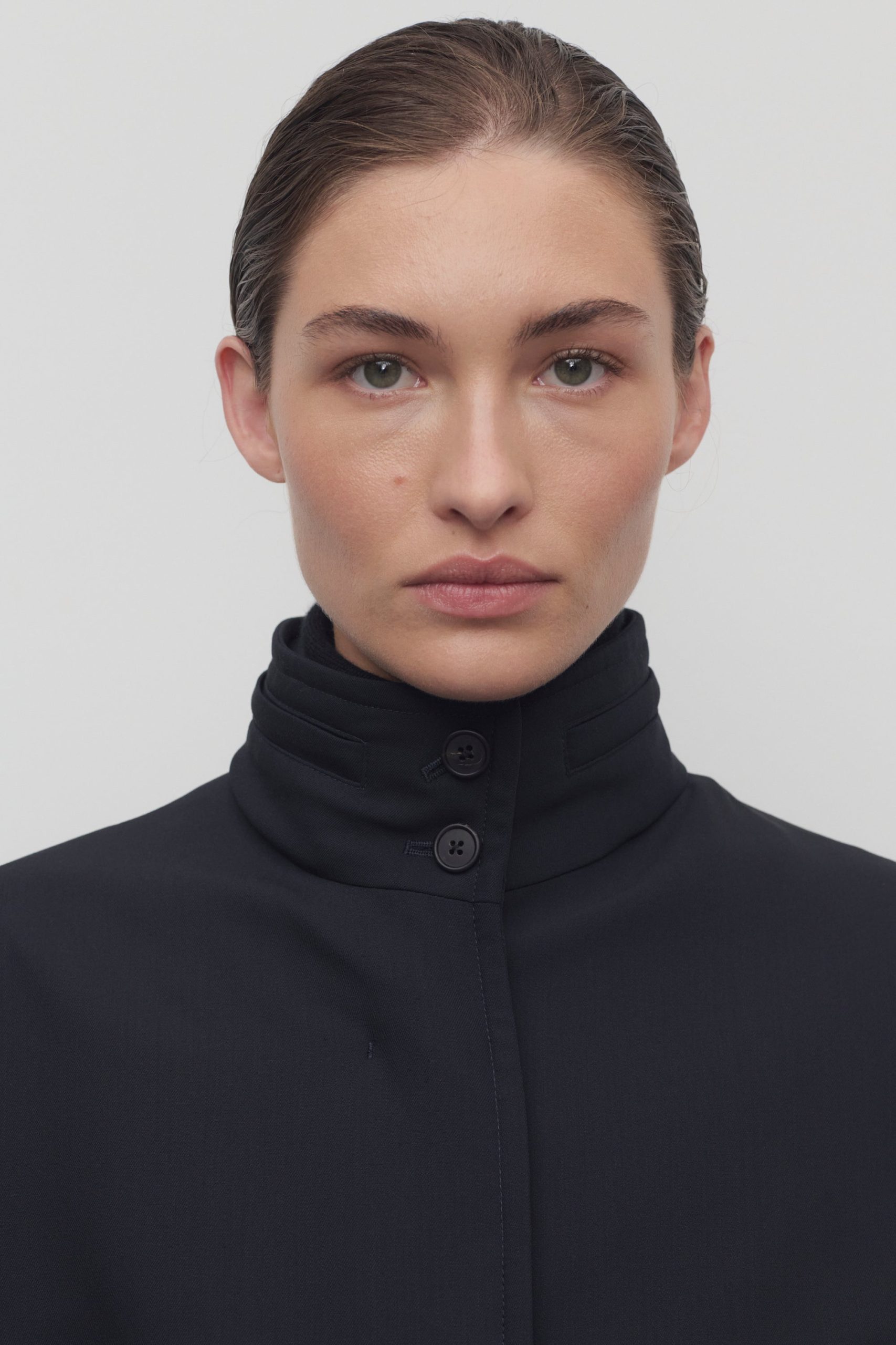 Technical jacket in smooth virgin wool gabardine with concealable hood at collar. adjustable interior drawstring waistband. and concealed front placket with zipper and button closures.