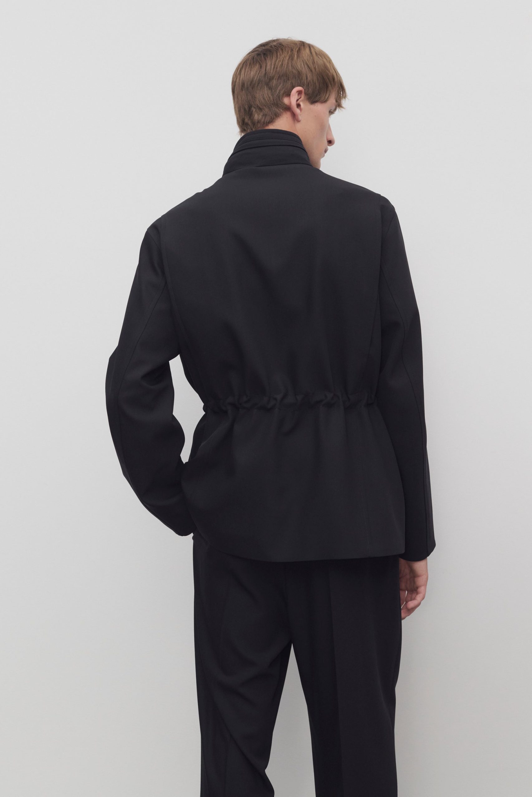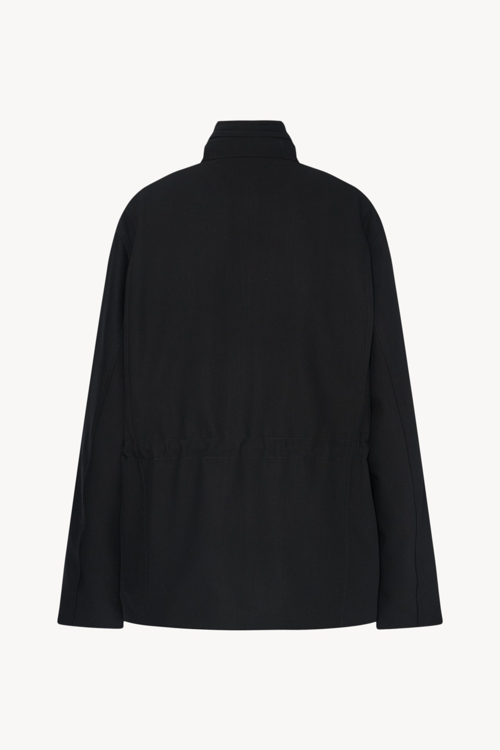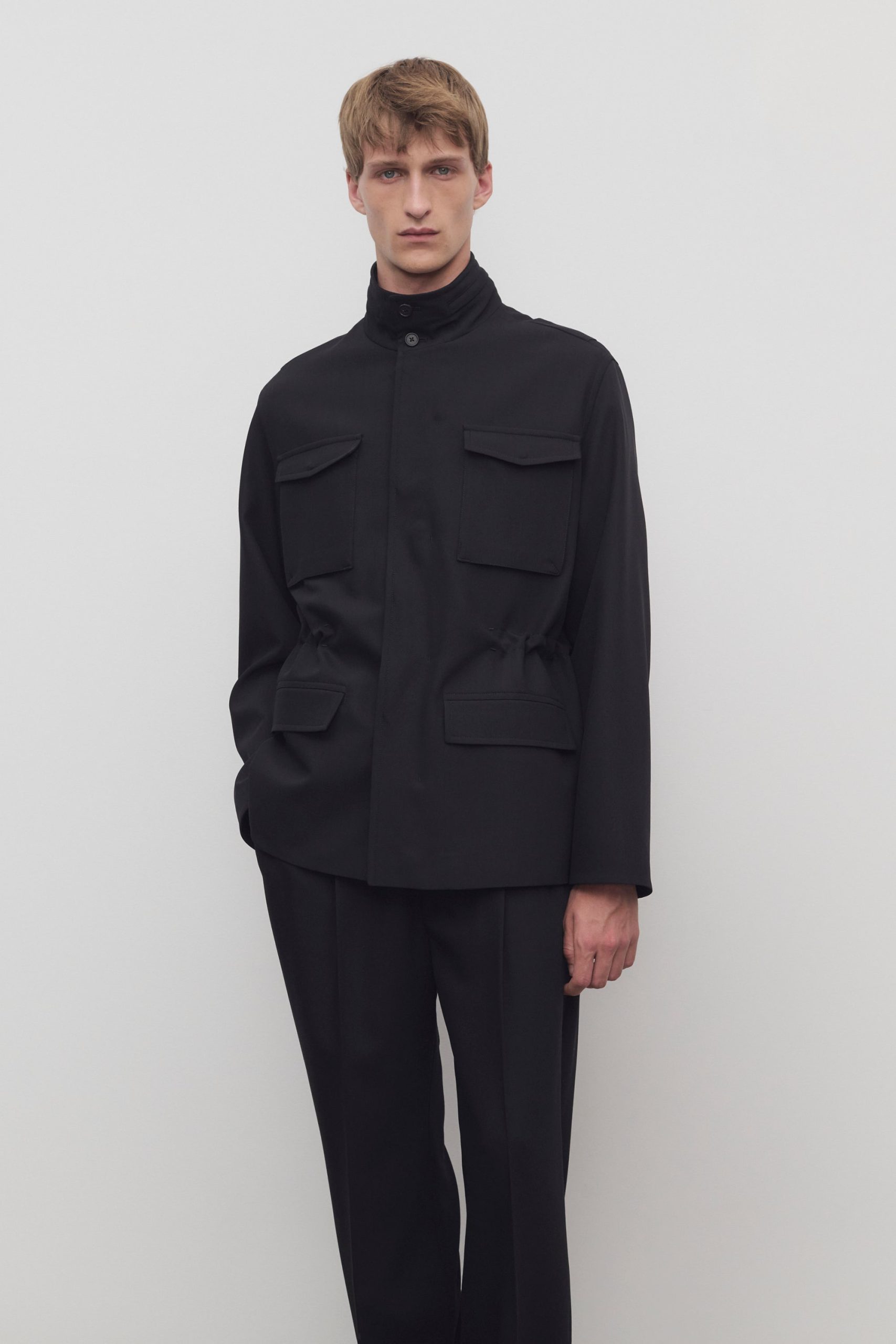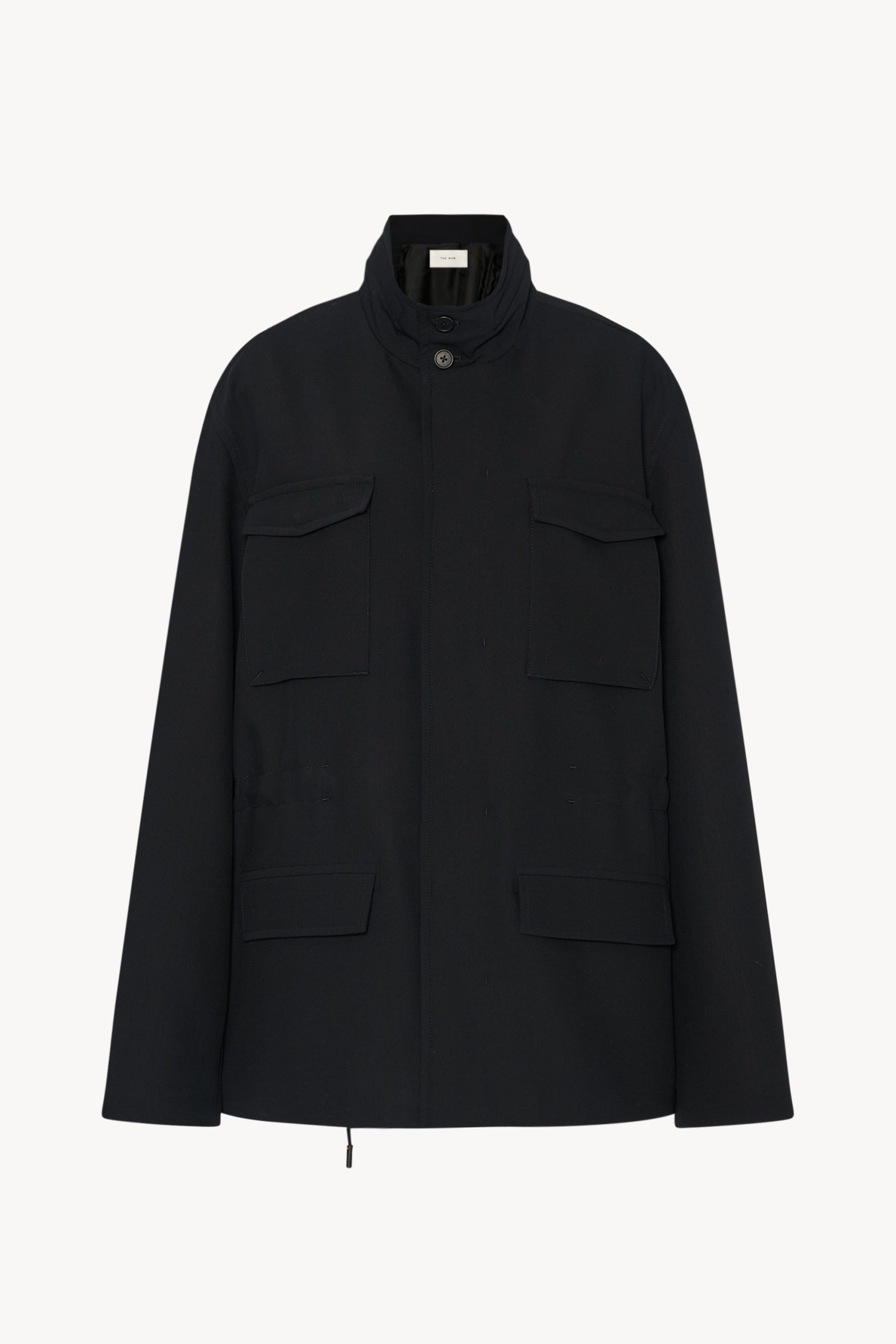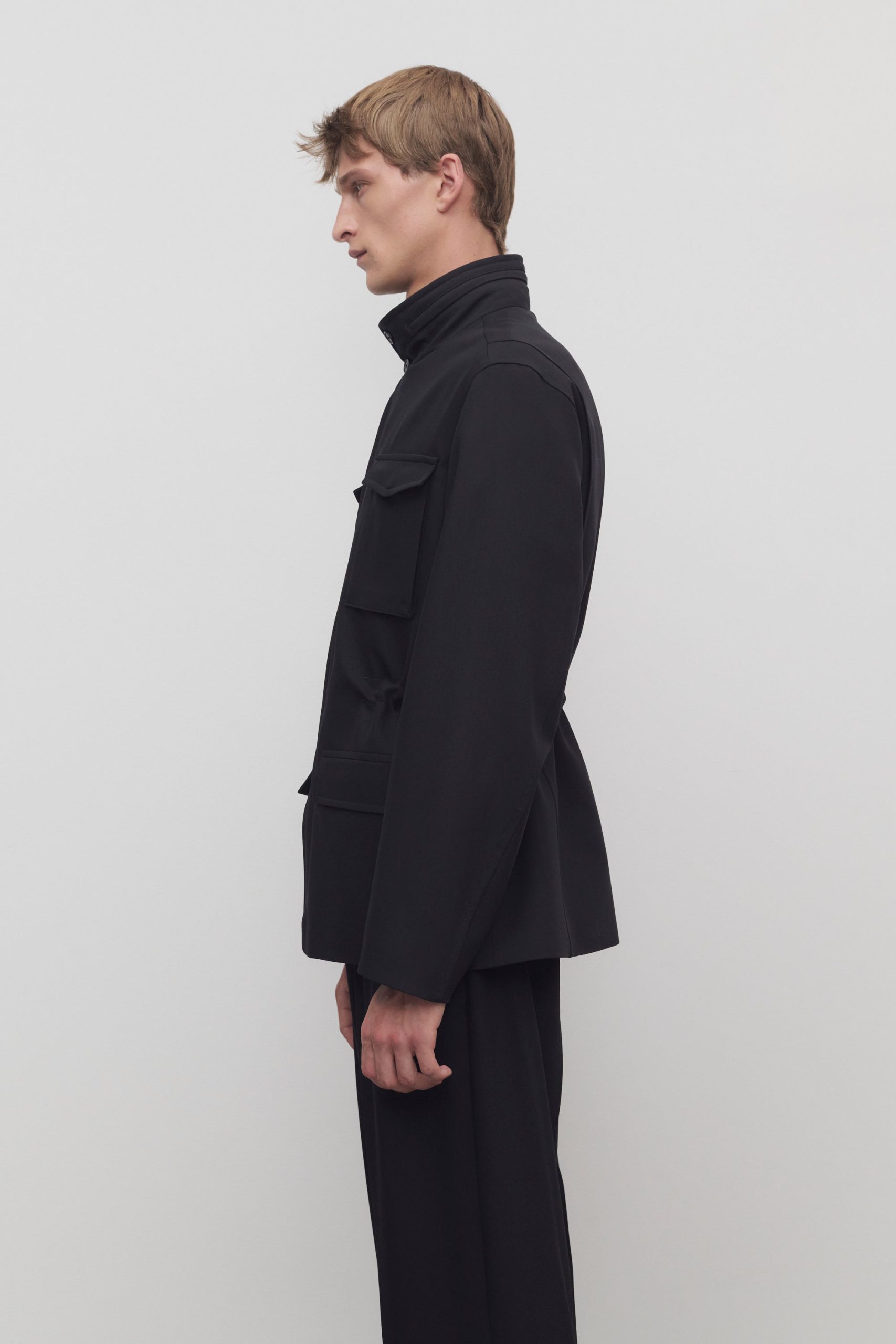 Streamlined field jacket in smooth virgin wool gabardine with concealable nylon hood at collar. front flap and patch pockets. and concealed front placket with zipper and horn button closure.
