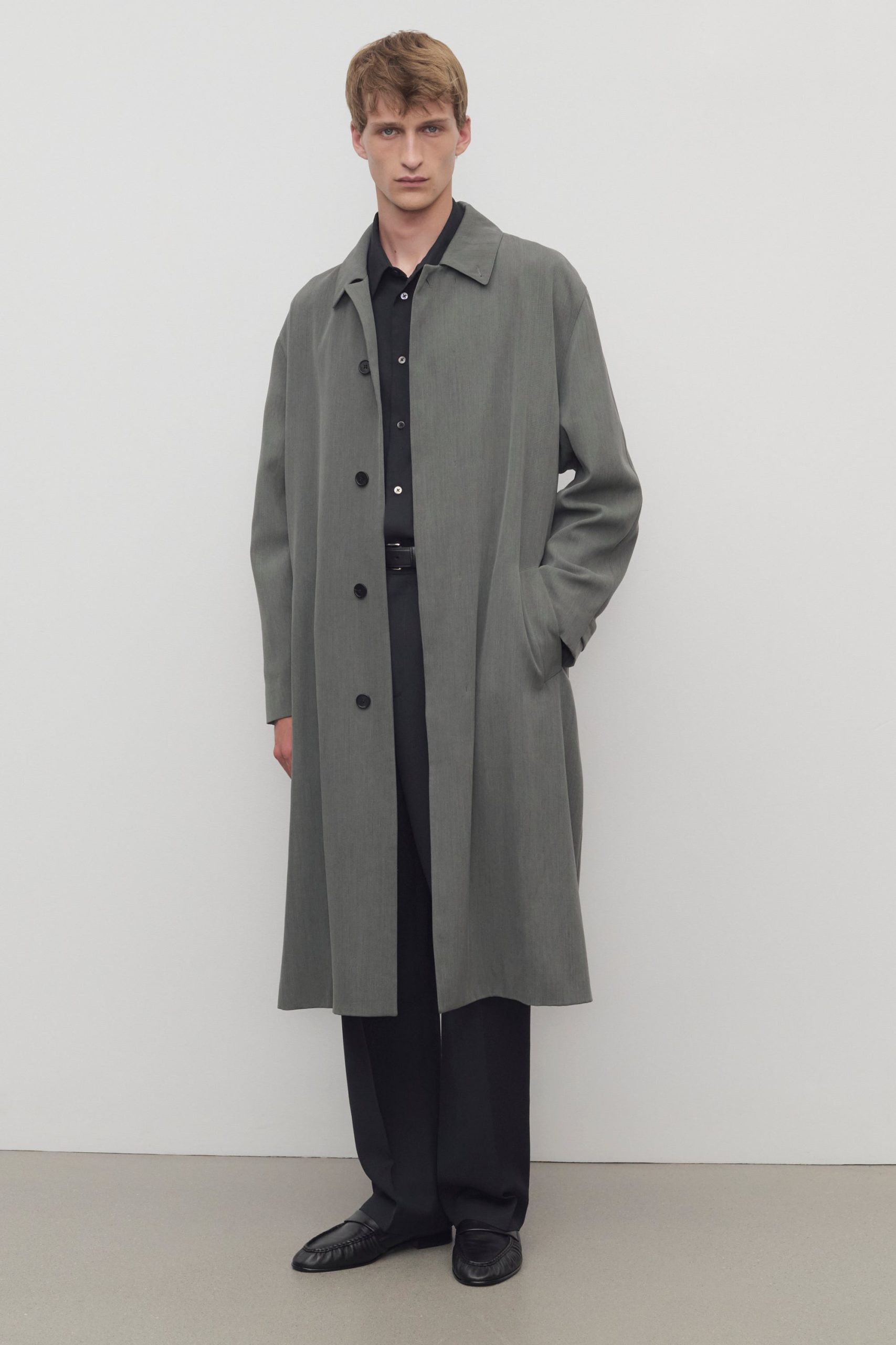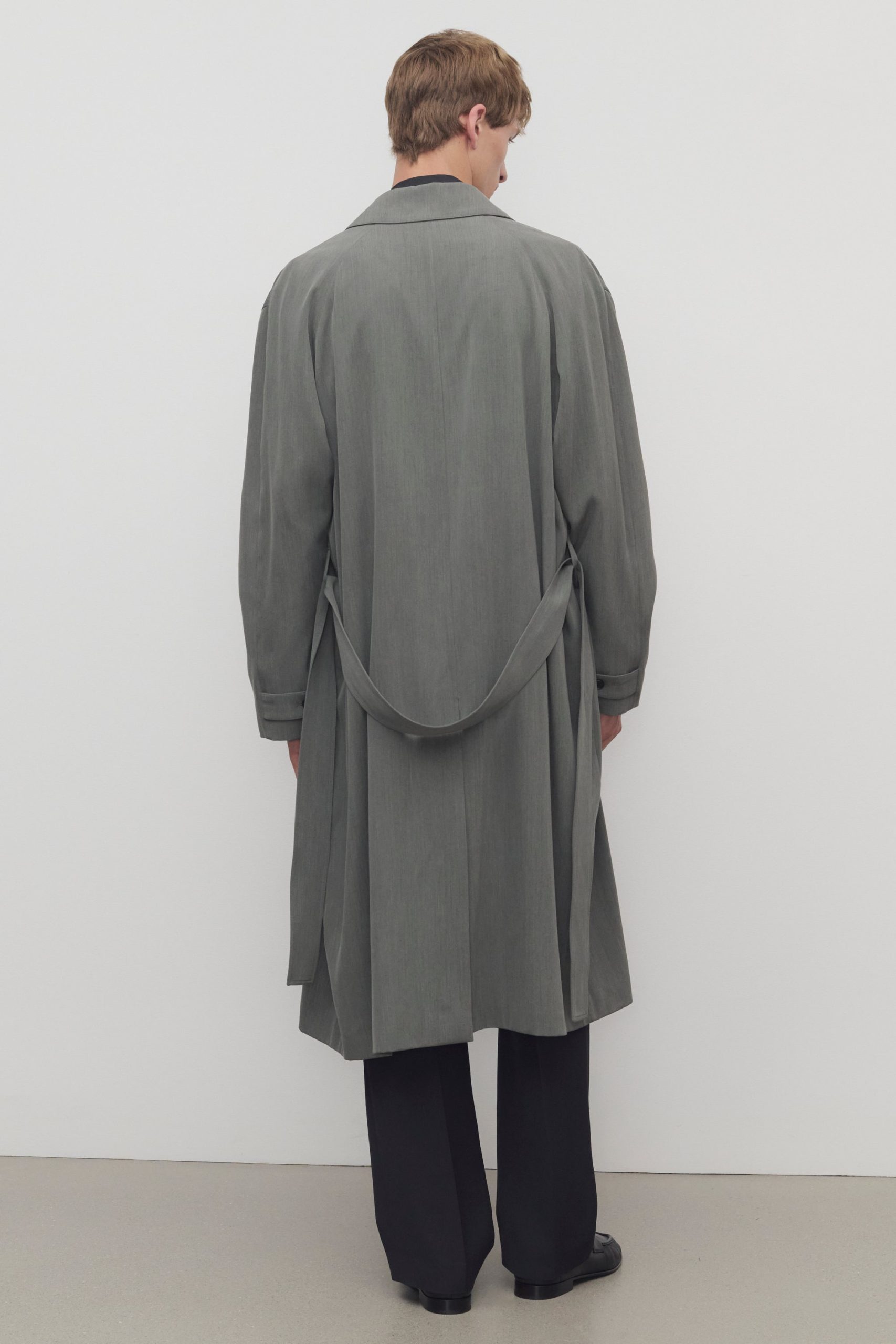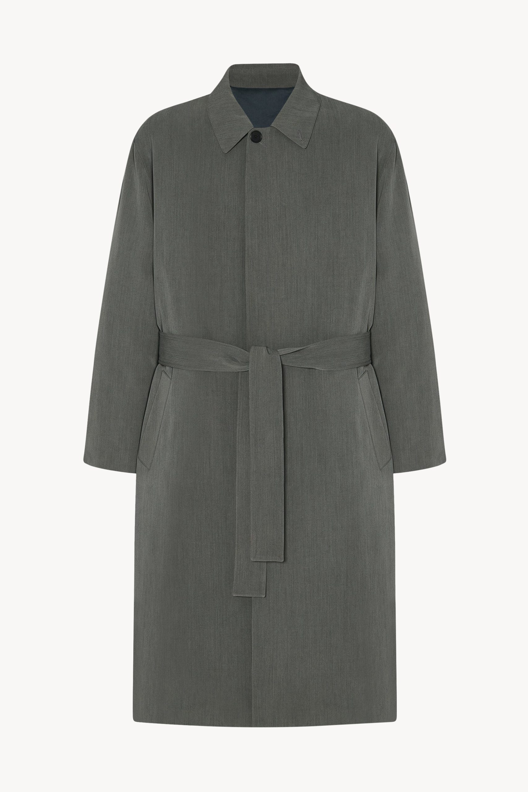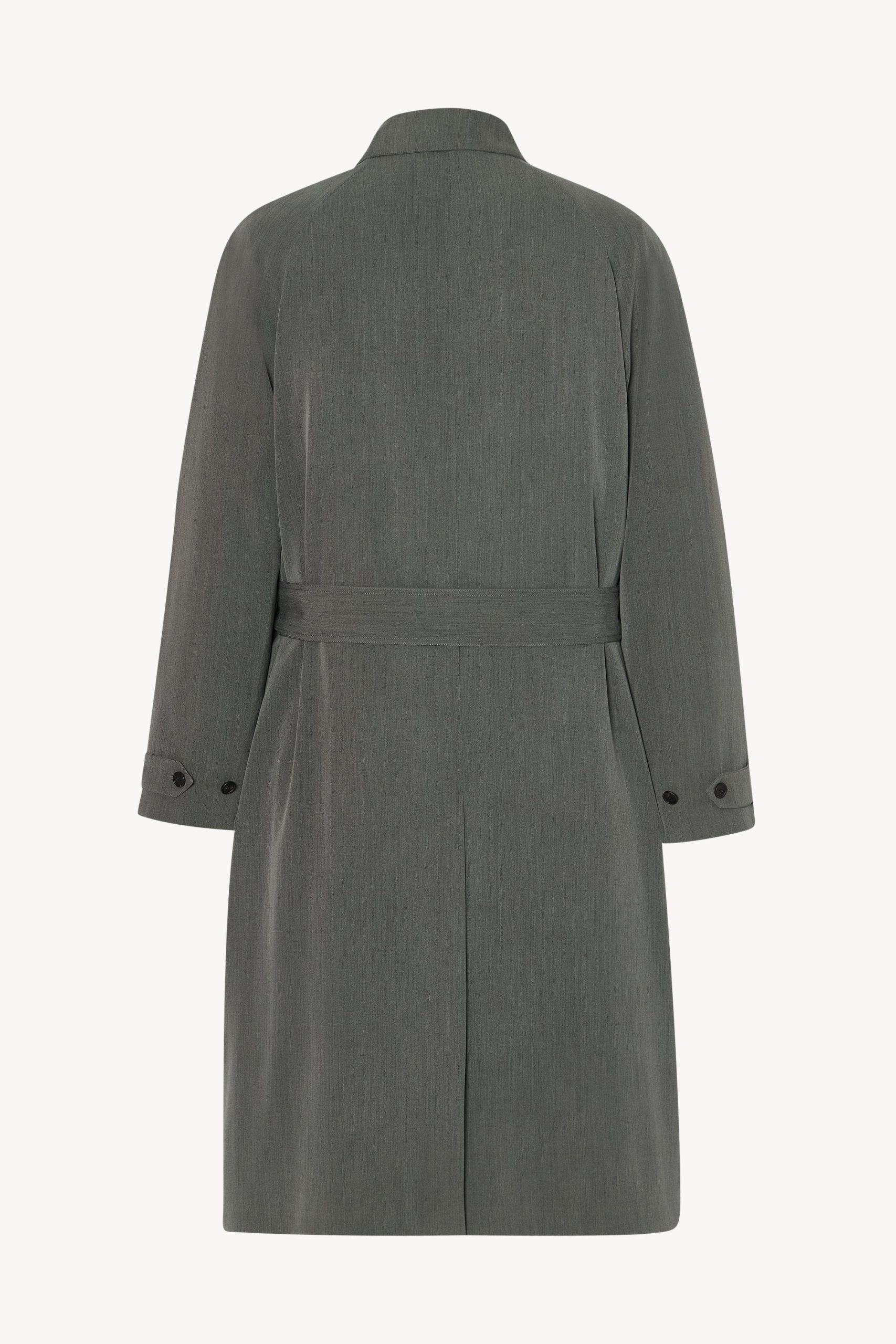 Single-breasted trench coat in double-faced silk and wool with removable belt. slant welt pockets. and concealed front placket with button closure.