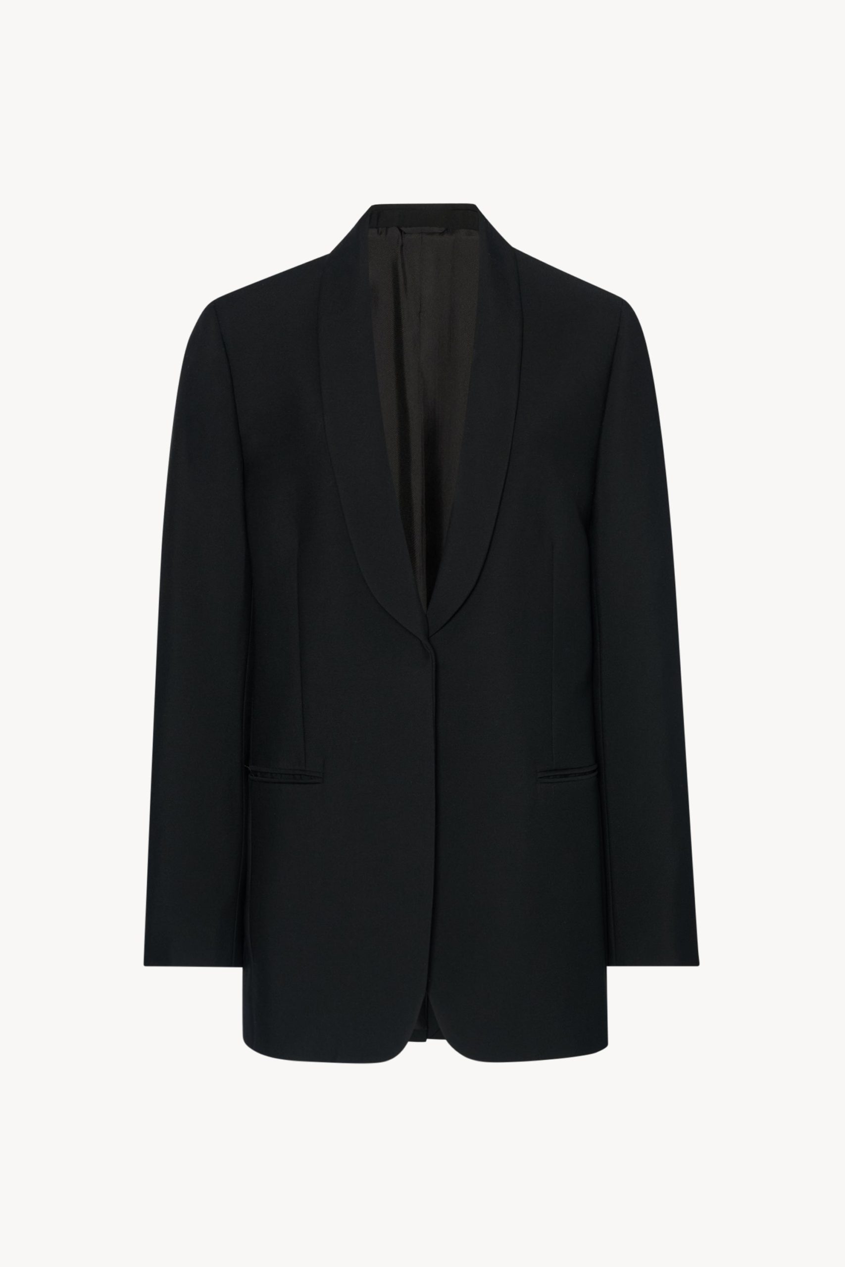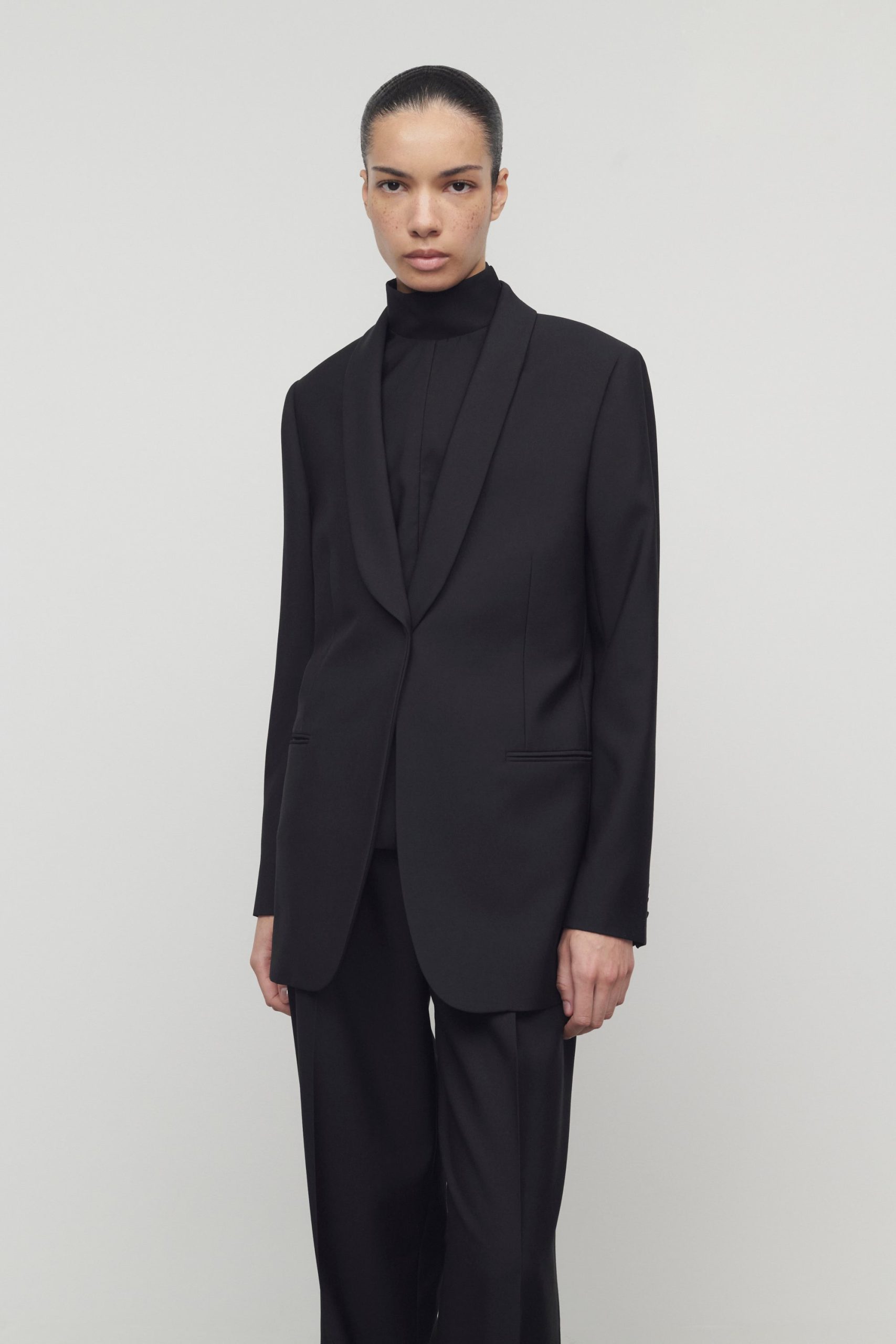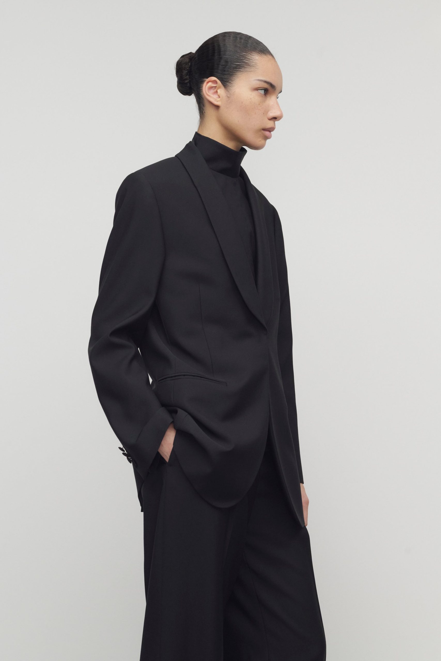 Single-breasted tuxedo jacket in fluid virgin wool with shawl lapel. front welt pockets. and interior satin ribbon closure.