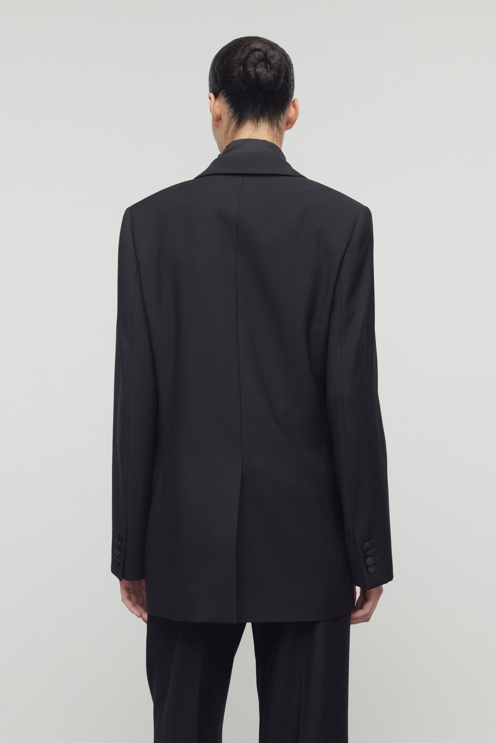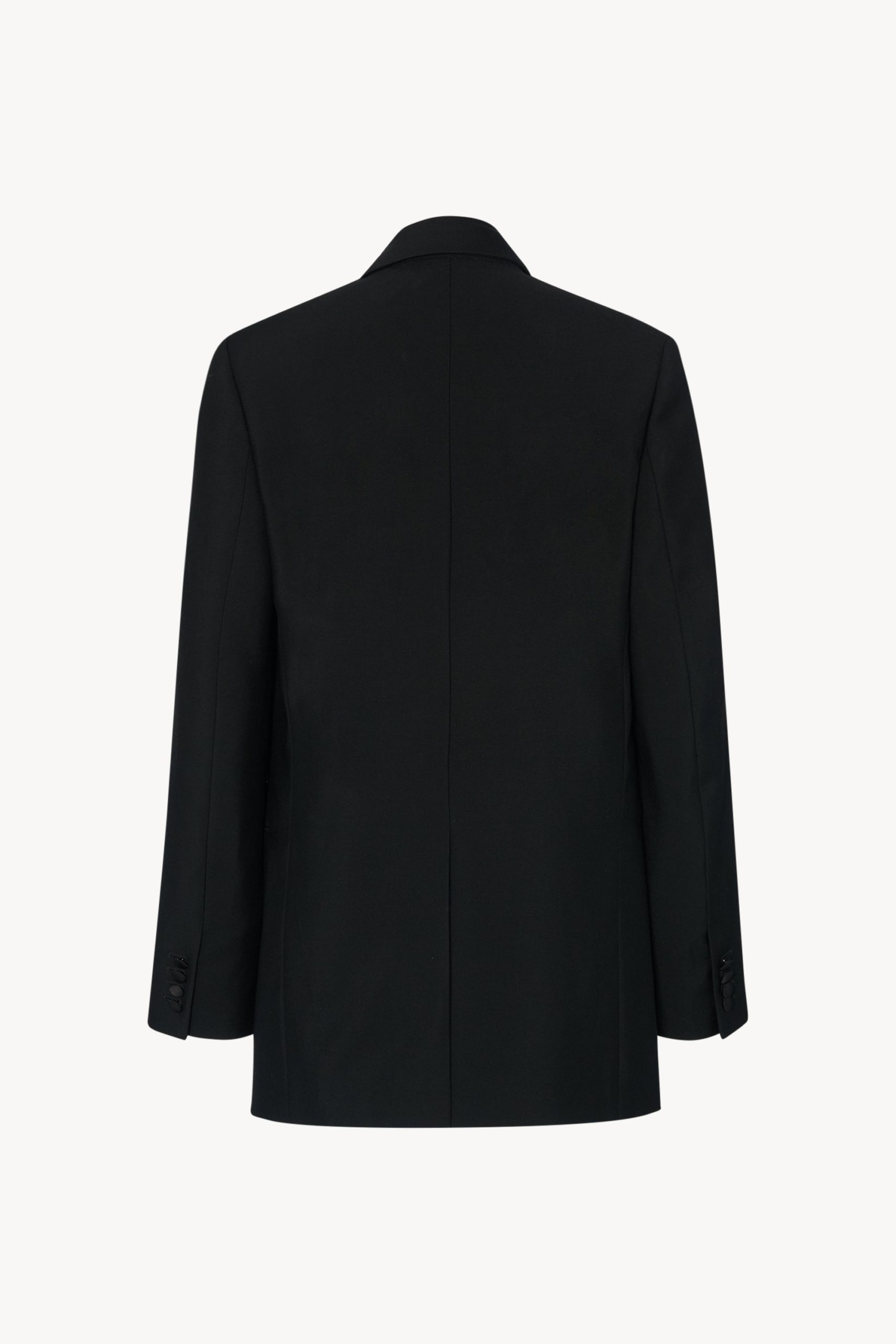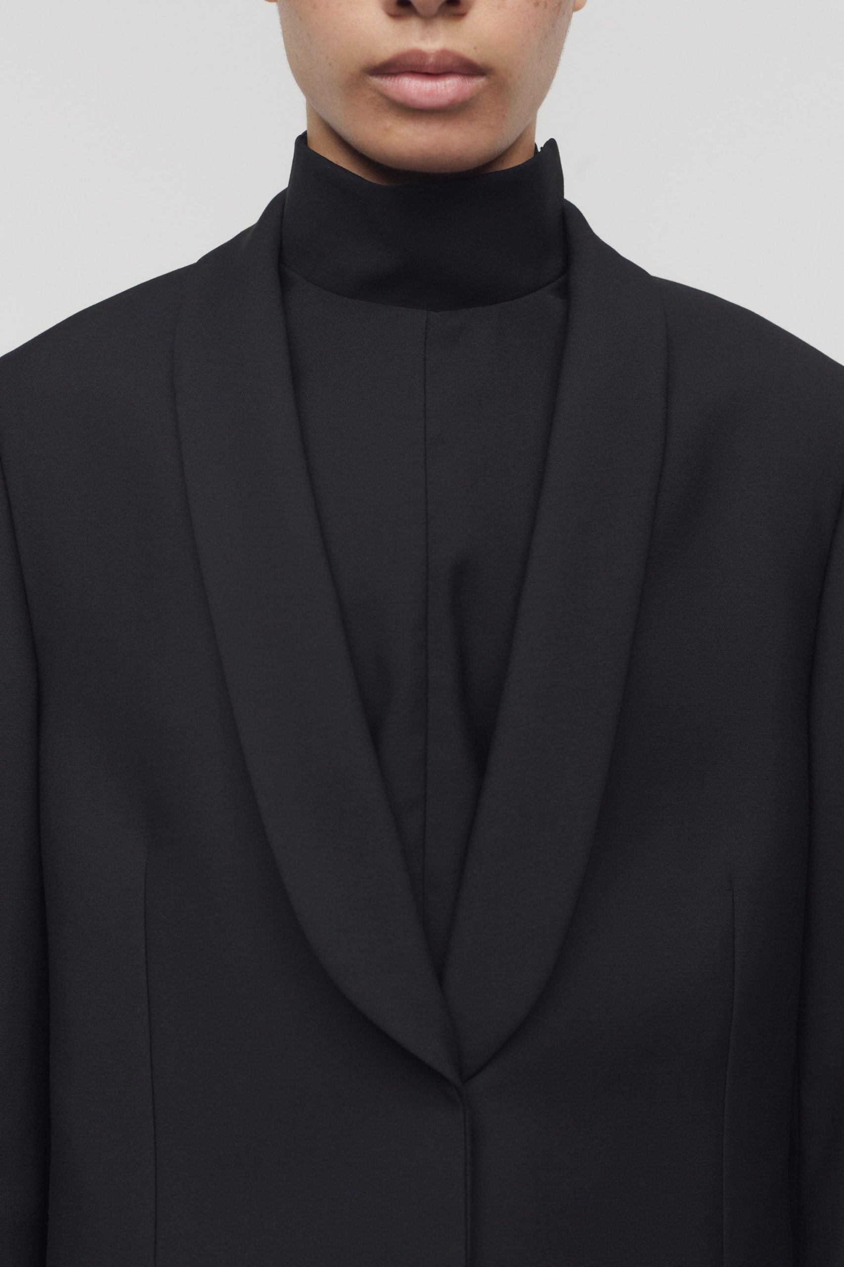 Single-breasted tuxedo jacket in fluid virgin wool with shawl lapel. front welt pockets. and interior satin ribbon closure.