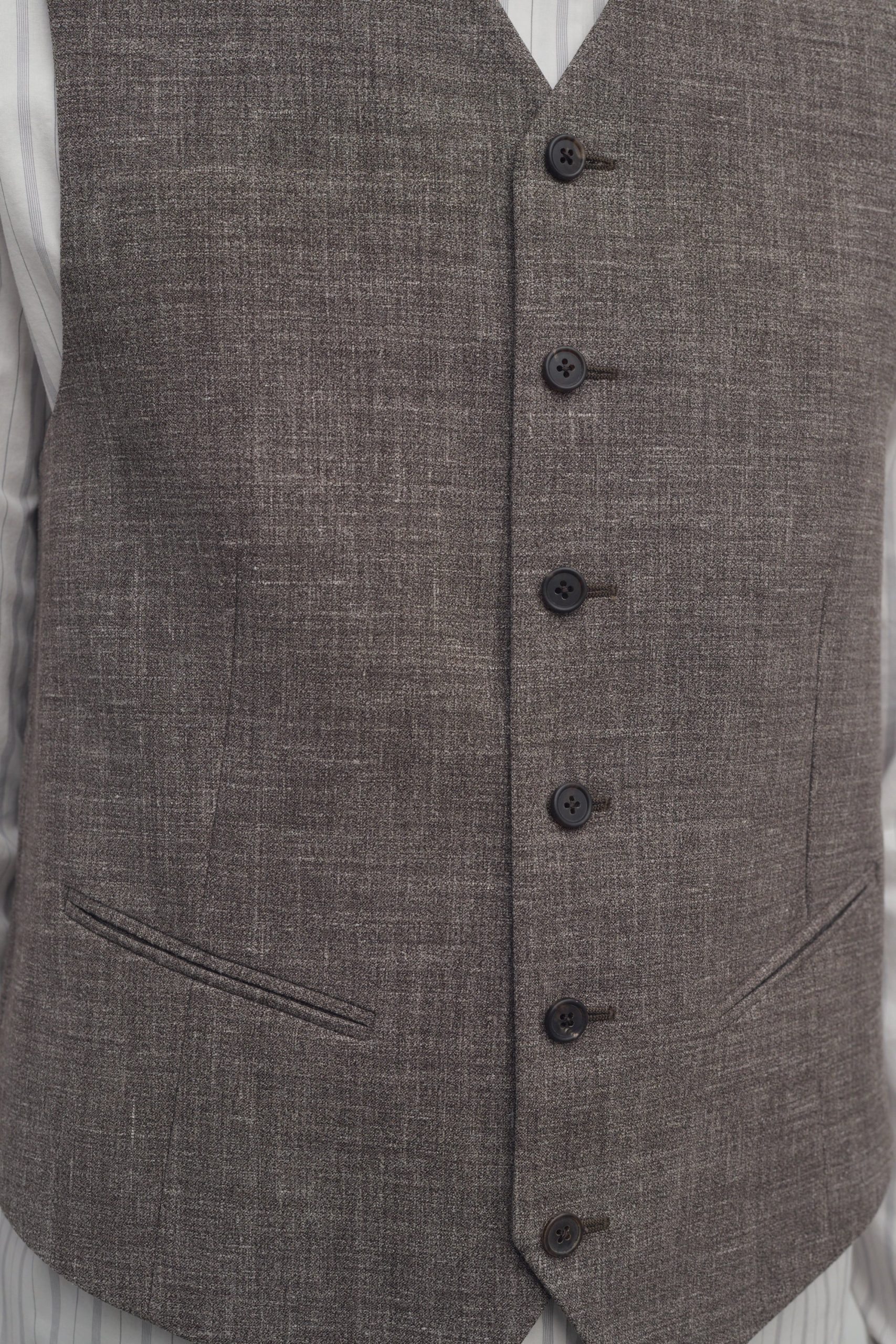 Single-breasted tailored vest in structured silk and linen canvas with front besom pockets. center back vent. and horn button closure.