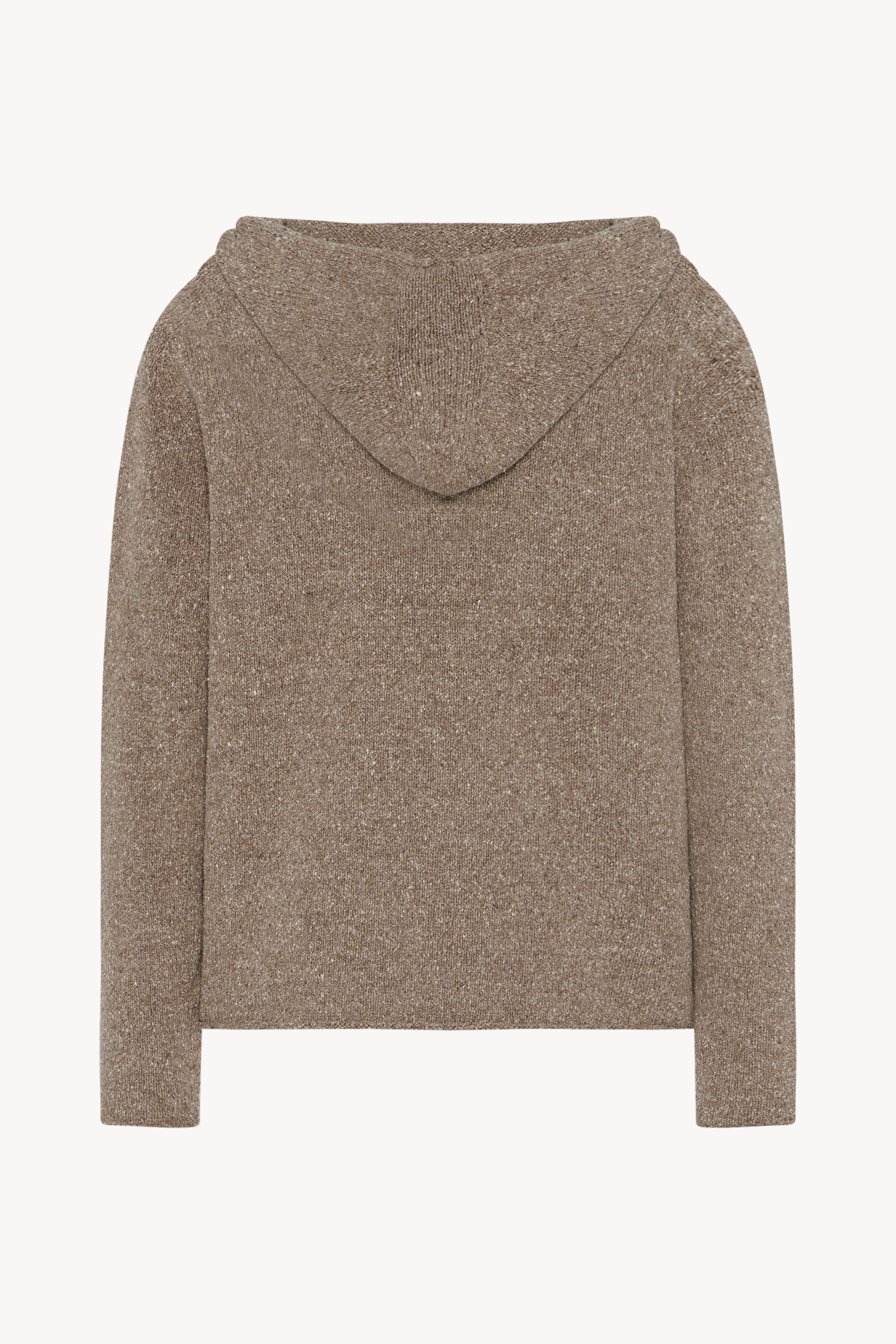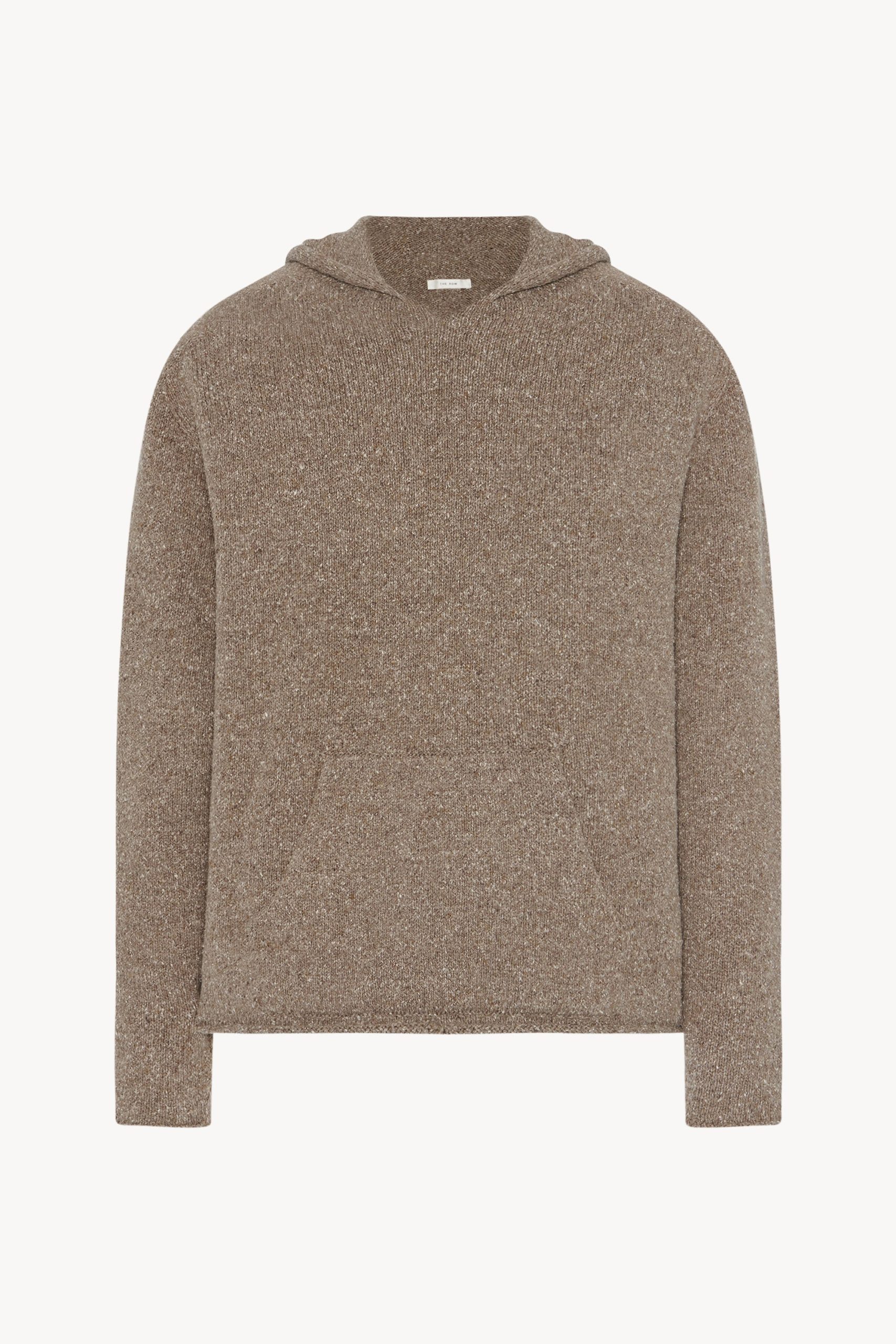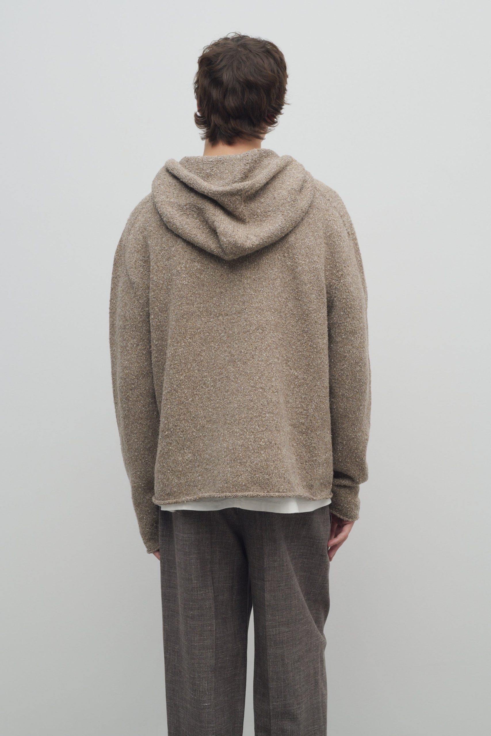 Minimal hooded sweater in textured midweight knit with kangaroo pocket. clean hem finish. and relaxed fit.